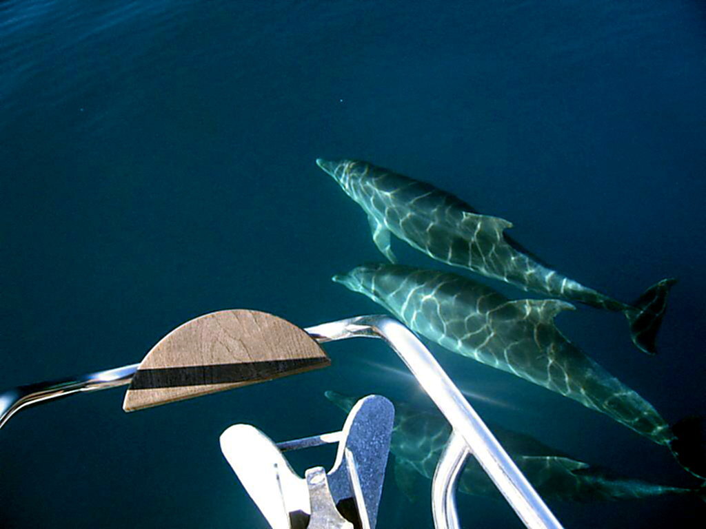 vorbereitet. Kaum sind wir aus dem Hafen raus, verfolgt uns schon die Garde Nationale mit einem schnellen Motorschiff. Sie wollen wissen, wohin wir gehen und wie viele Leute wir an Bord sind. Es hat keinen Wind aber das Wetter ist herrlich, Sonne und etwa 20°, was will man mehr? Um 14h00 erspäht unser Adlerauge Paul Delfine. Paul ist ein absoluter Spezialist, im Umkreis von 5 Seemeilen sieht er alles was sich auf dem Meer befindet, aber seine Socken oder sein Hemd kann er nicht finden, auch wenn es nur 1 m neben ihm liegt!