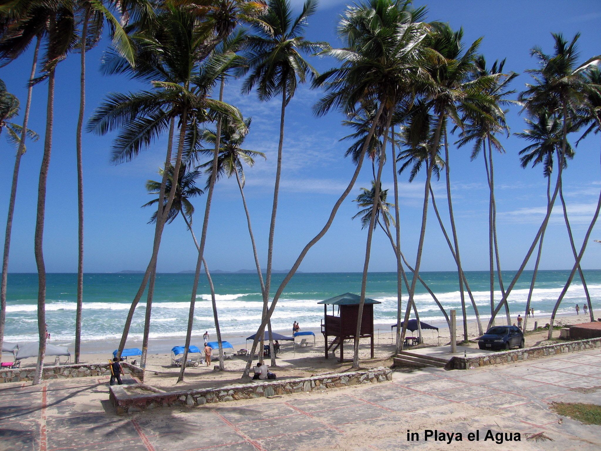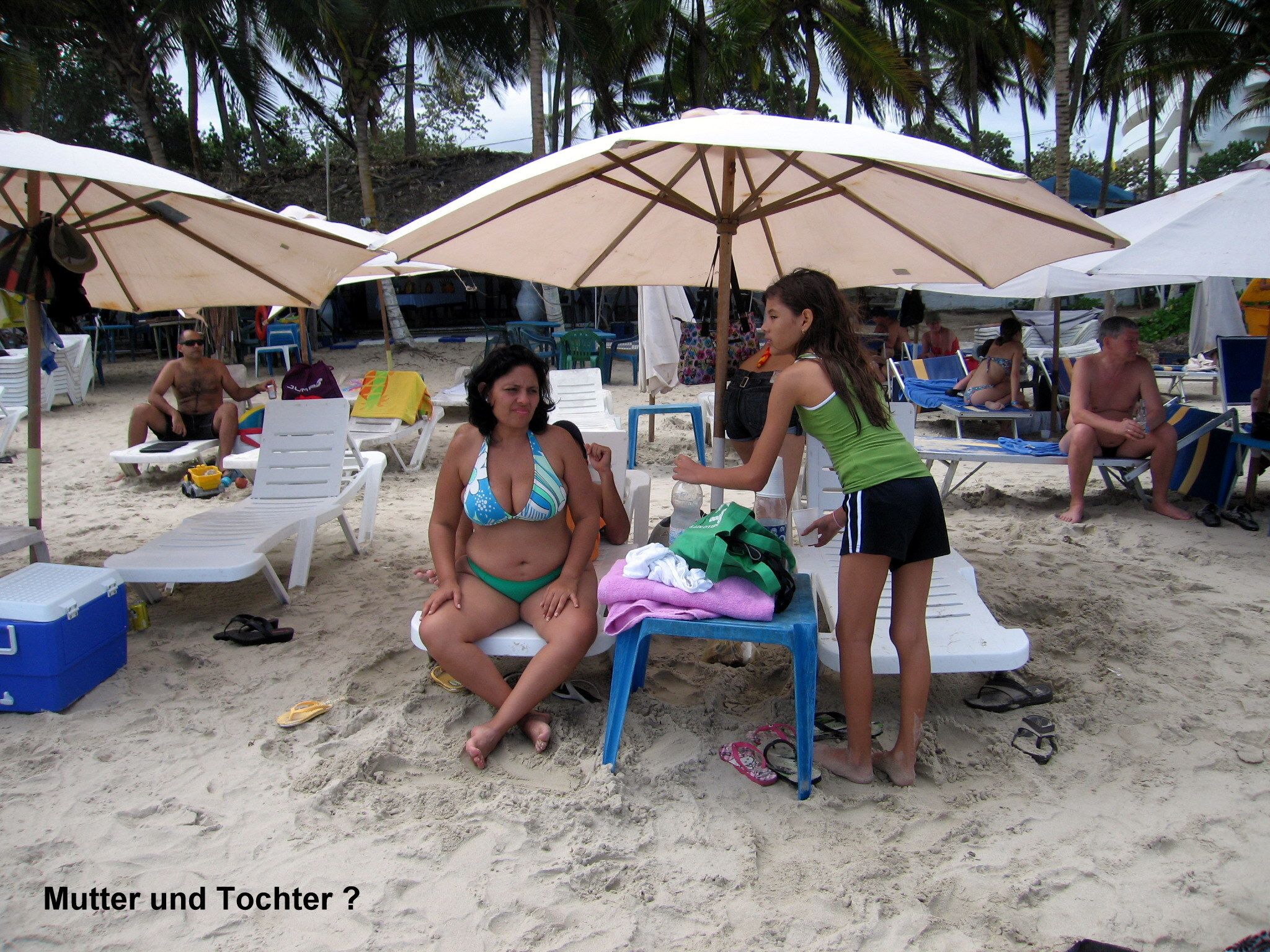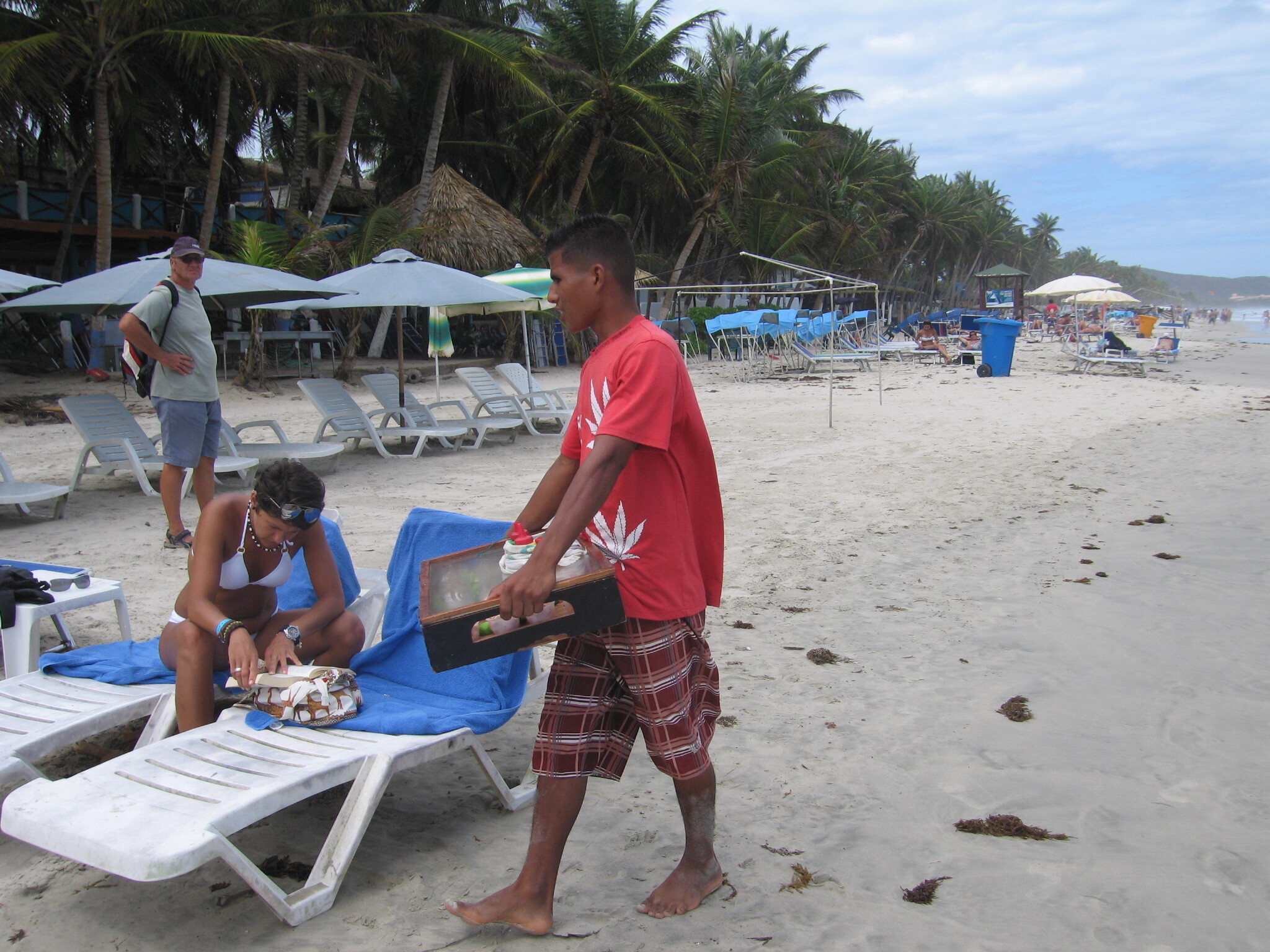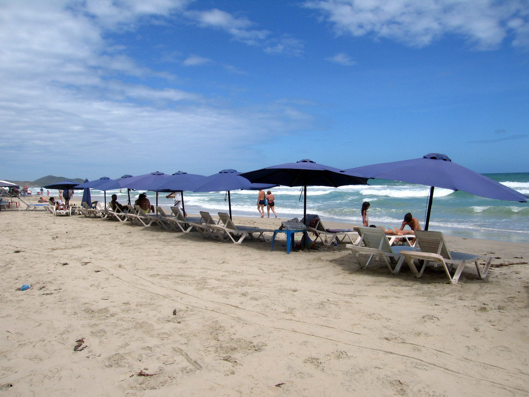 Sonntag, 31.Januar 2010: Porlamar: Trotz heftiger Schaukelei schlafen wir sehr gut. Es ist ein schöner sonniger Tag. Um uns die Zeit ein wenig zu verkürzen, bis unser nächster Besuch am Freitag ankommt, sind wir um 10h bereits auf der Plaza Bolivar. Wir setzen uns in einen klapprigen Bus, der nach Playa el Agua fährt. Dieser touristische Ort mit vielen Hotels liegt an der Nordküste der Insel Margarita. In 40 Minuten fahren wir quer über die ganze Insel, was pro Person 4 Bolivar kostet (ca. 80 Rappen). Hier laufen wir dem Strand entlang und schauen uns das Strandleben, der vorwiegend venezuelanischen Gäste, an. Weil ja heute Sonntag ist, sind viele mit ihren Autos hergekommen. Es hat richtig viel Wind, die Sonnenschirme flattern nur so, und die Brandung donnert ununterbrochen gewaltig an den Strand. Am Sandstrand essen wir bei einer Strandbude je einen Fisch (Red Snapper), Reis und gemischten Chabis-Rüebli-Salat. Es ist sehr gut und günstig (35 Bolivar; ca. 5 SFr. pro Person)!