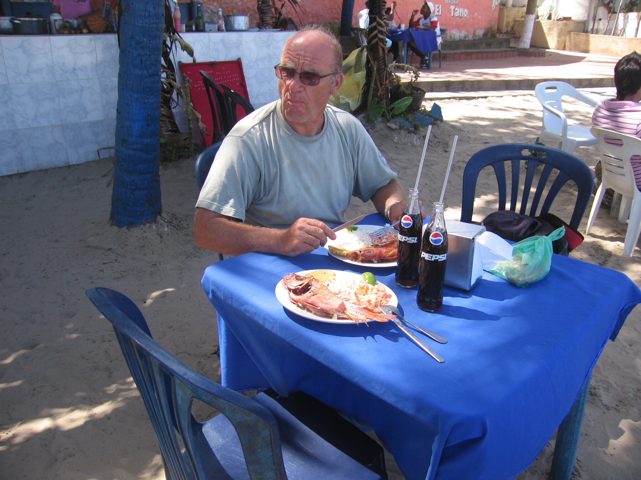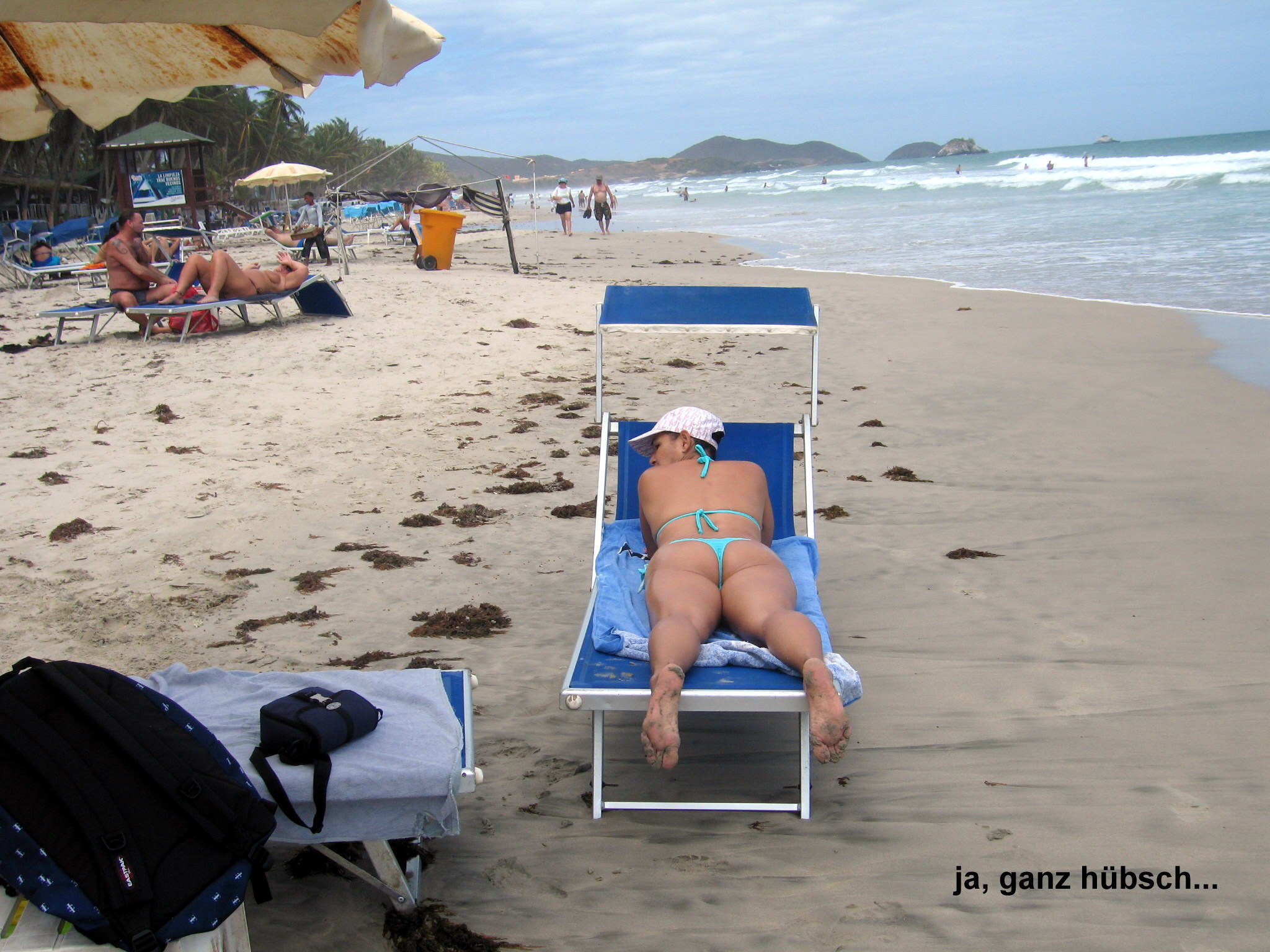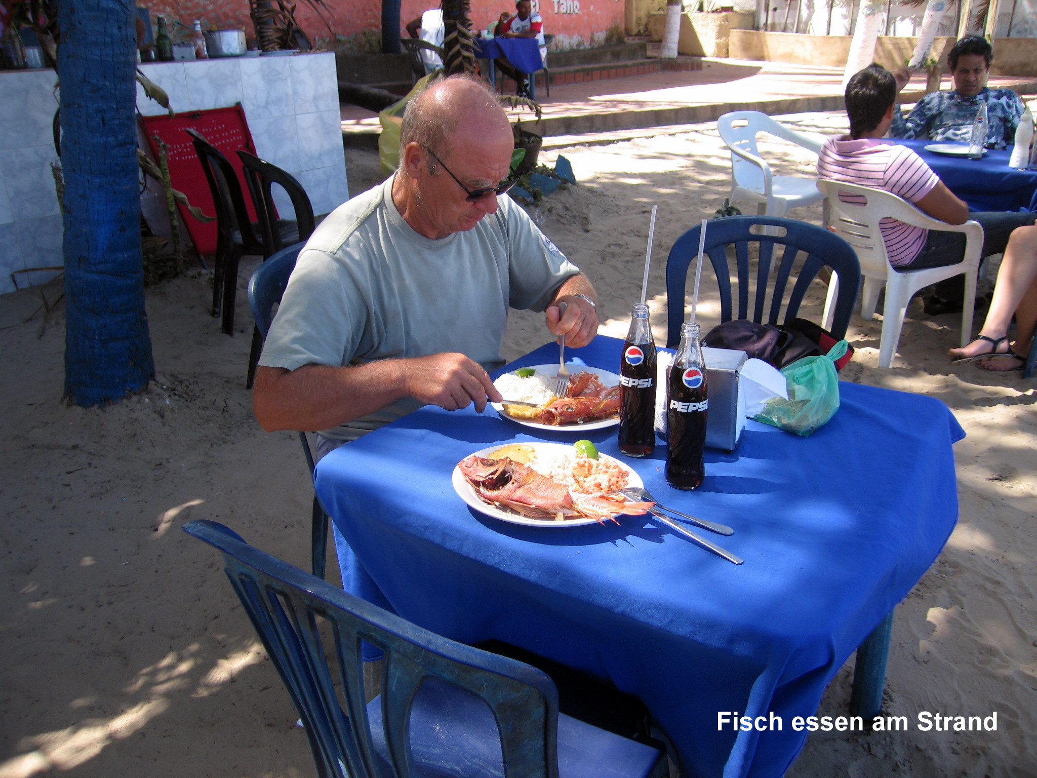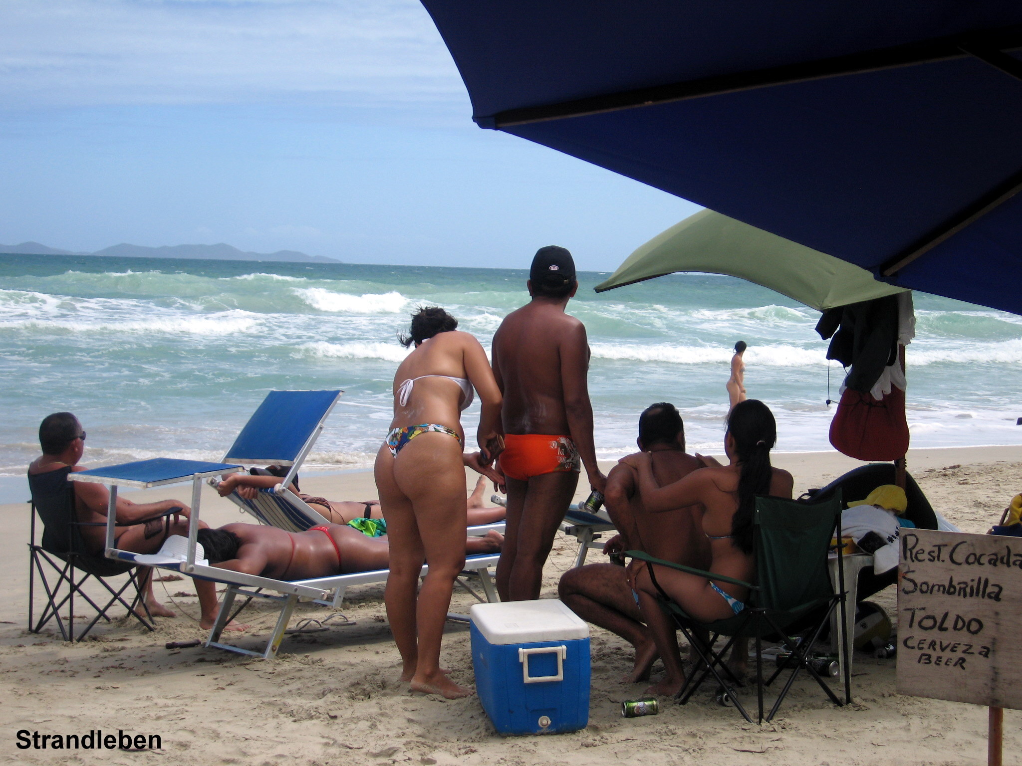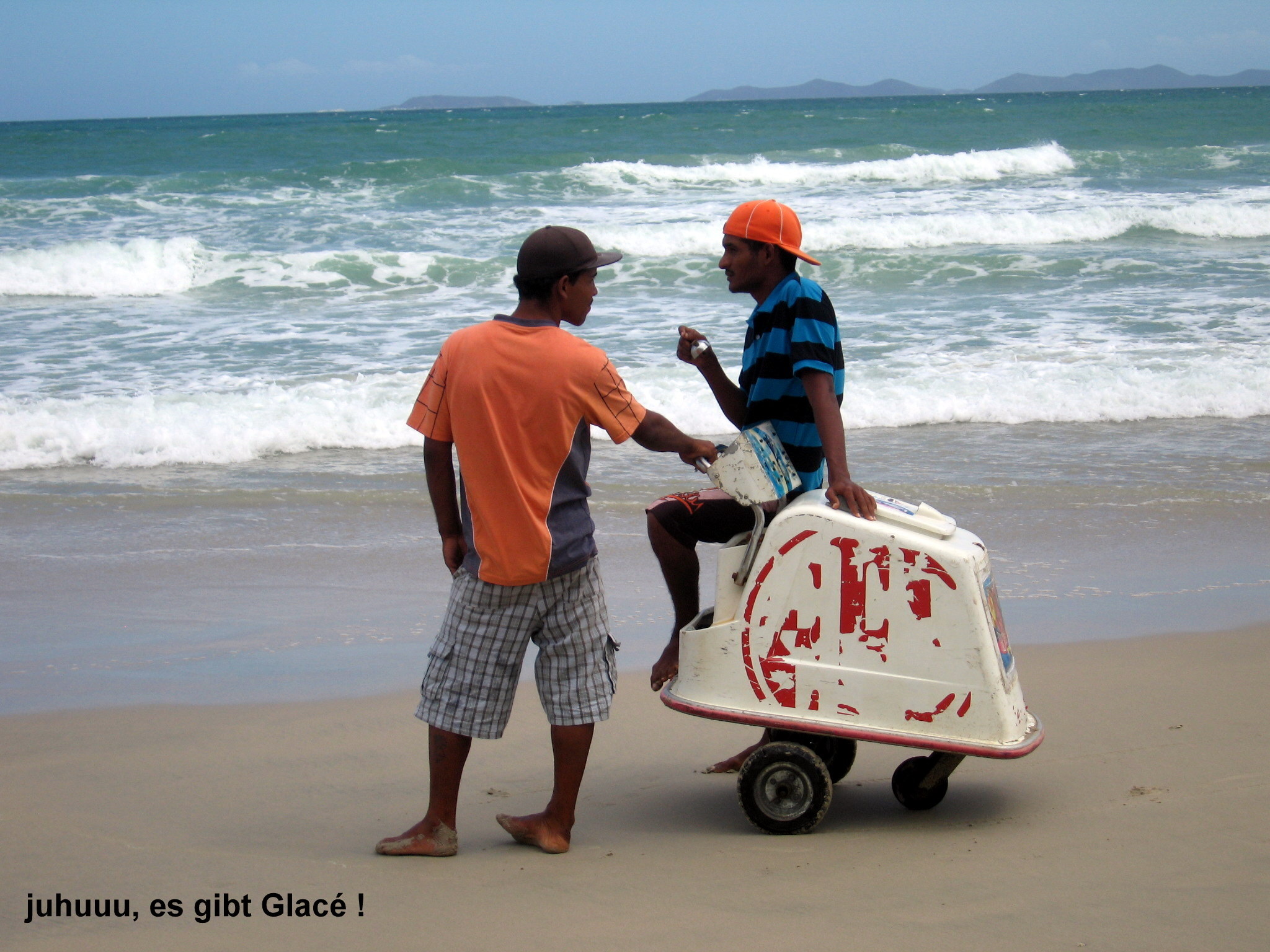 Sonntag, 31.Januar 2010: Porlamar: Trotz heftiger Schaukelei schlafen wir sehr gut. Es ist ein schöner sonniger Tag. Um uns die Zeit ein wenig zu verkürzen, bis unser nächster Besuch am Freitag ankommt, sind wir um 10h bereits auf der Plaza Bolivar. Wir setzen uns in einen klapprigen Bus, der nach Playa el Agua fährt. Dieser touristische Ort mit vielen Hotels liegt an der Nordküste der Insel Margarita. In 40 Minuten fahren wir quer über die ganze Insel, was pro Person 4 Bolivar kostet (ca. 80 Rappen). Hier laufen wir dem Strand entlang und schauen uns das Strandleben, der vorwiegend venezuelanischen Gäste, an. Weil ja heute Sonntag ist, sind viele mit ihren Autos hergekommen. Es hat richtig viel Wind, die Sonnenschirme flattern nur so, und die Brandung donnert ununterbrochen gewaltig an den Strand. Am Sandstrand essen wir bei einer Strandbude je einen Fisch (Red Snapper), Reis und gemischten Chabis-Rüebli-Salat. Es ist sehr gut und günstig (35 Bolivar; ca. 5 SFr. pro Person)!