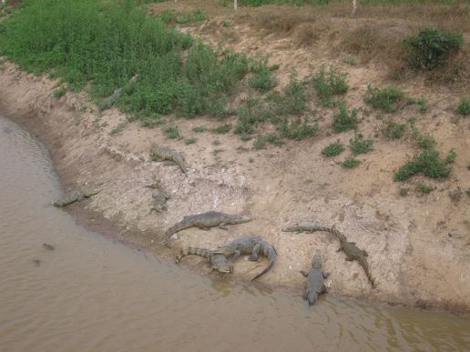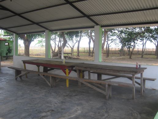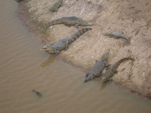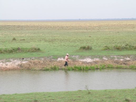 Die Stadt Calabozu ist das Zentrum des Reisanbaus. Überall stehen grosse Reissilos. Hier in dieser Stadt essen wir zu Mittag. Aber komischerweise gibt es keinen Reis, sondern gekochte Yuca (fast wie Kartoffeln) und gemischten Salat, dazu ein Kilo Rindfleisch auf dem offenen Feuer gebraten. Mmm..., sehr gut! Auf der Weiterfahrt sehen wir km-lange hellgrüne, bewässerte Reisfelder. Ca. 200 km vor unserem Ziel gibt es einen Kaffeehalt. Edith und ich staunen nicht schlecht, als wir in der Toilette der „Damas“ (Damen), eine Hündin finden, die in den Wehen liegt und bald ihre Jungen bekommt. Weiter geht es nach San Fernando de Apure, einer grossen Stadt, wo wir den Rio Apure überqueren. An riesigen Viehfarmen vorbei, die hier „hatos“ heissen, erreichen wir den Ort Mantecal. Jetzt dauert es nicht mehr lange, bis wir unser Camp erreichen, nur noch etwa 100 km! Ab jetzt haben wir ganz schnell die Strapazen der langen Reise vergessen! In den Wassertümpeln (jetzt ist hier Trockenzeit) und der unermesslichen und unendlichen Landschaft sehen wir Wasserbüffel, Wasserschweine (Capybaras), jede Menge schwarze, weisse und rote Ibisse, Löffler, verschiedene Sorten Reiher, Geier und viele Vögel, die wir nicht zuordnen können, dazu Hunderte von lebenden Krokodilen in und am Wasser. Ausserdem noch etwa ein Dutzend plattgefahrene Krokodile auf der Strasse. Wir sind alle vier total fasziniert und können es nicht glauben, so viele von den Viechern schon am ersten Abend zu sehen!