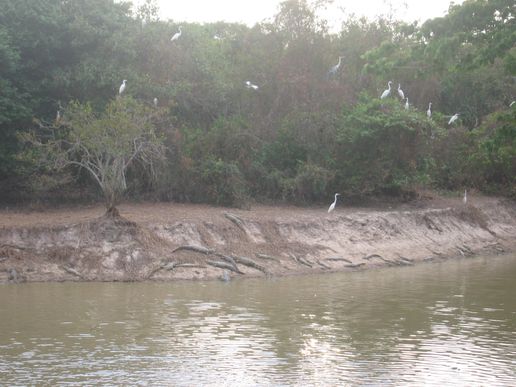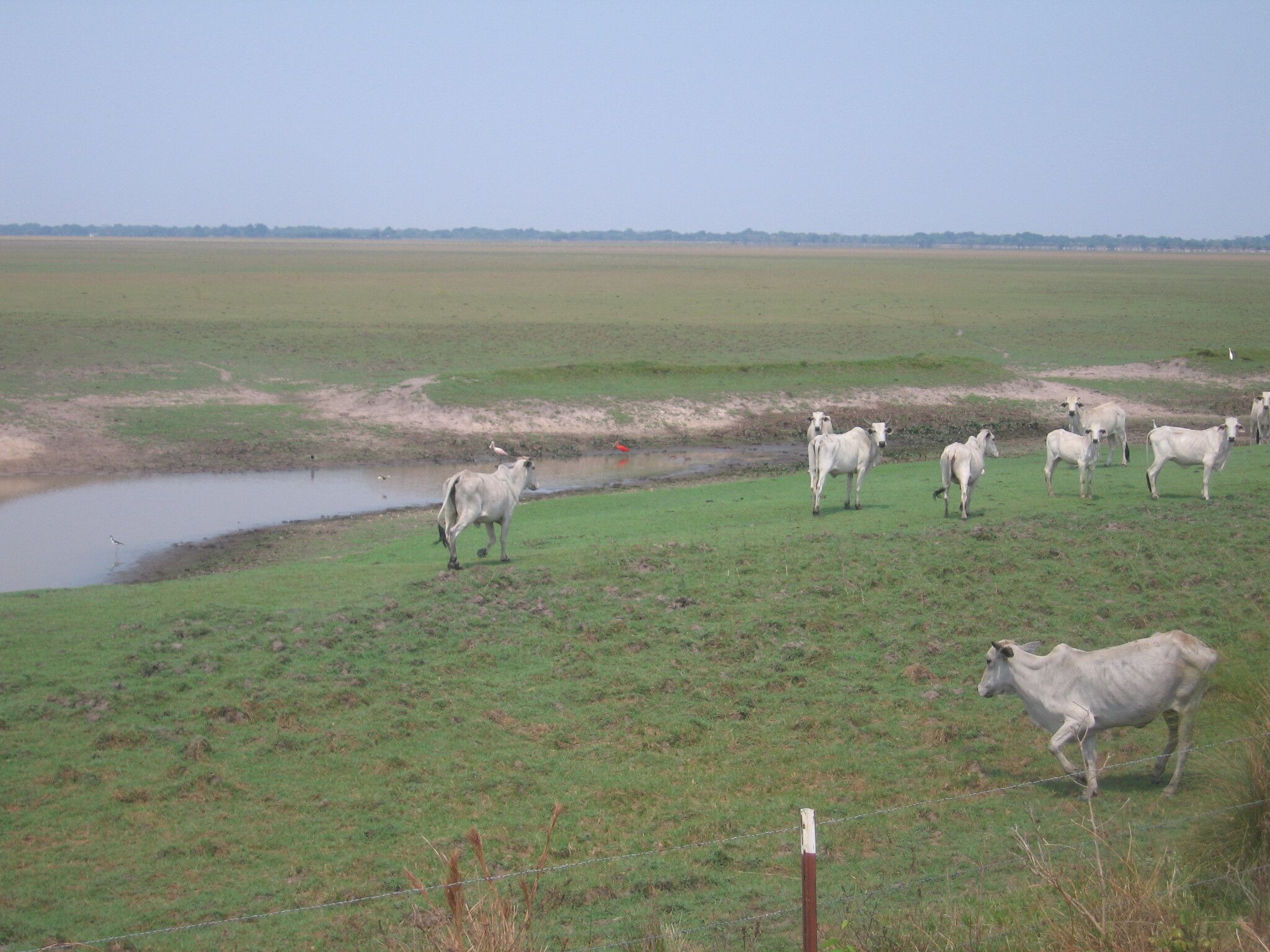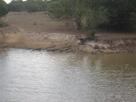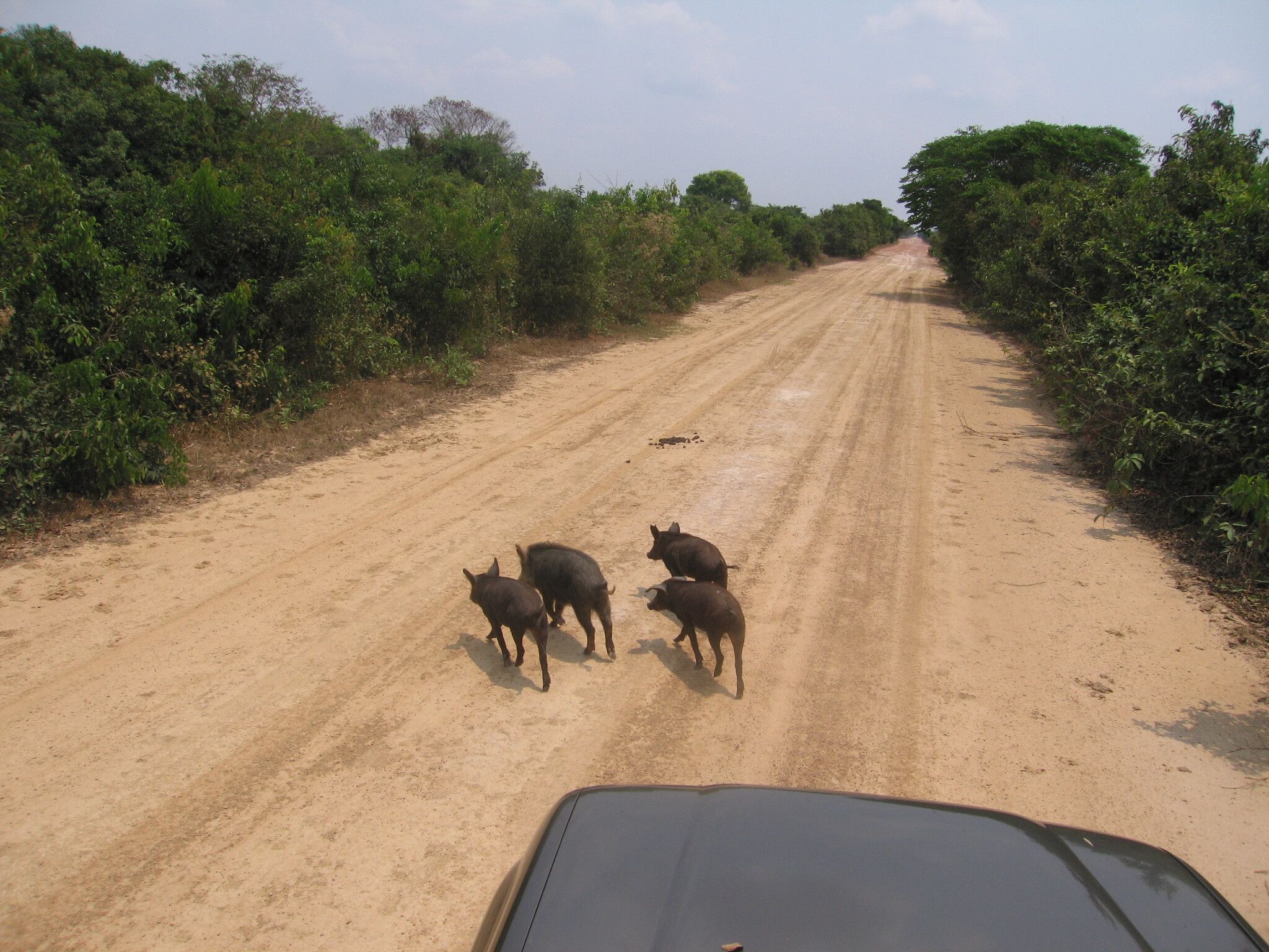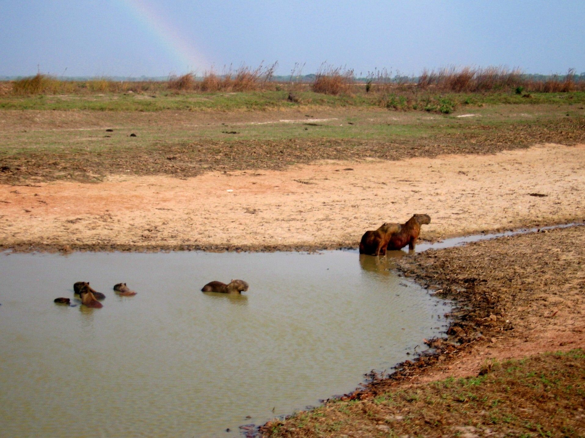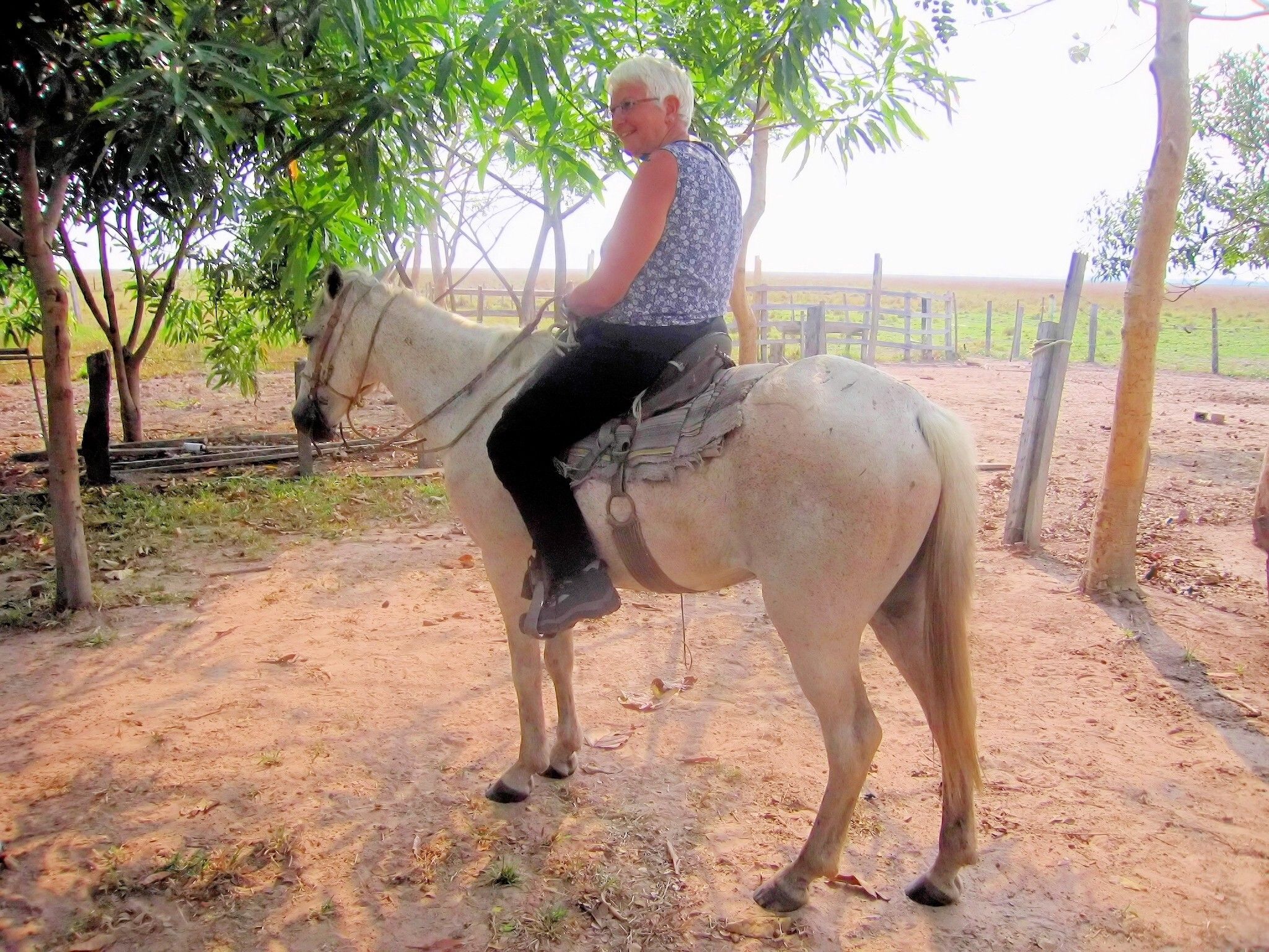 Von 9h15 – 11h15 sitzen wir alle auf den Pferderücken. Paul steigt aber ganz schnell wegen Rückenproblemen wieder von seinem Gaul herunter und bleibt mit Matthias zurück. Wir trotten mit unserem Führer Licandro durch die Savanne und suchen Ameisenbären. Aber ausser einem Reh und zwei kleinen Erd-Eulen sehen wir nicht besonders viel. Es ist gewaltig heiss! Wir sind alle drei froh, nach zwei Stunden wieder von den Rössern herunter zu steigen. Wobei ich unheimlich stolz darauf bin, dass mein Gaul meistens das gemacht hat, was ich von ihm wollte. Matthias hat mit Paul unterdessen eine Tier-Entdeckungsfahrt mit dem Auto unternommen. Um 11h30 wird schon das Mittagessen serviert: Spaghetti, Hähnchen, Salat, Wassermelone. So gegen 12h15-14 sind wir schon wieder mit Matthias im Auto unterwegs: Tiere schauen. Viele, viele, überhaupt nicht scheue Wasserschweine, Krokodile im Wasser die sich abkühlen und auch wieder jede Menge von Vögeln. Darunter auch eine riesige Gruppe von roten Ibissen in einer grünen Wiese. Ein toller Anblick! Von Weitem sieht es aus wie ein Mohnfeld bei uns. Von 14h – 15h haben wir Pause, dann geht es wieder per Auto auf die Pirsch. Wir begegnen Unmengen von Wasserschweinen, Wildschweinen, wilden Hausschweinen, unheimlich vielen Krokodilen, Rehen, Wasserbüffeln, Schildkröten, Leguanen und allen Sorten Vögeln die man sich denken kann. Nur einen Ameisenbären treffen wir nicht an. Es ist enorm heiss, ca. 37° und es hat seit 4 oder 5 Monaten nicht mehr geregnet. Die Wassertümpel werden immer ausgetrockneter und wir sehen viele tote Piranhas, weil das Wasser in den Tümpeln zu heiss wird.