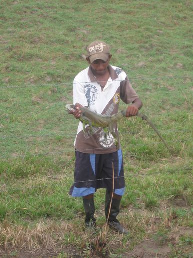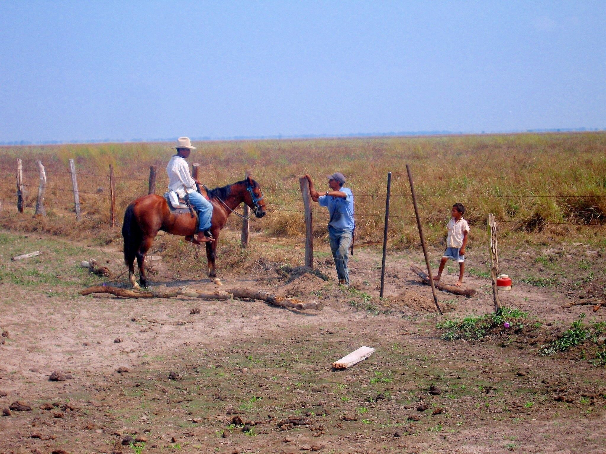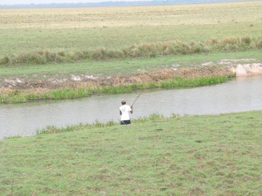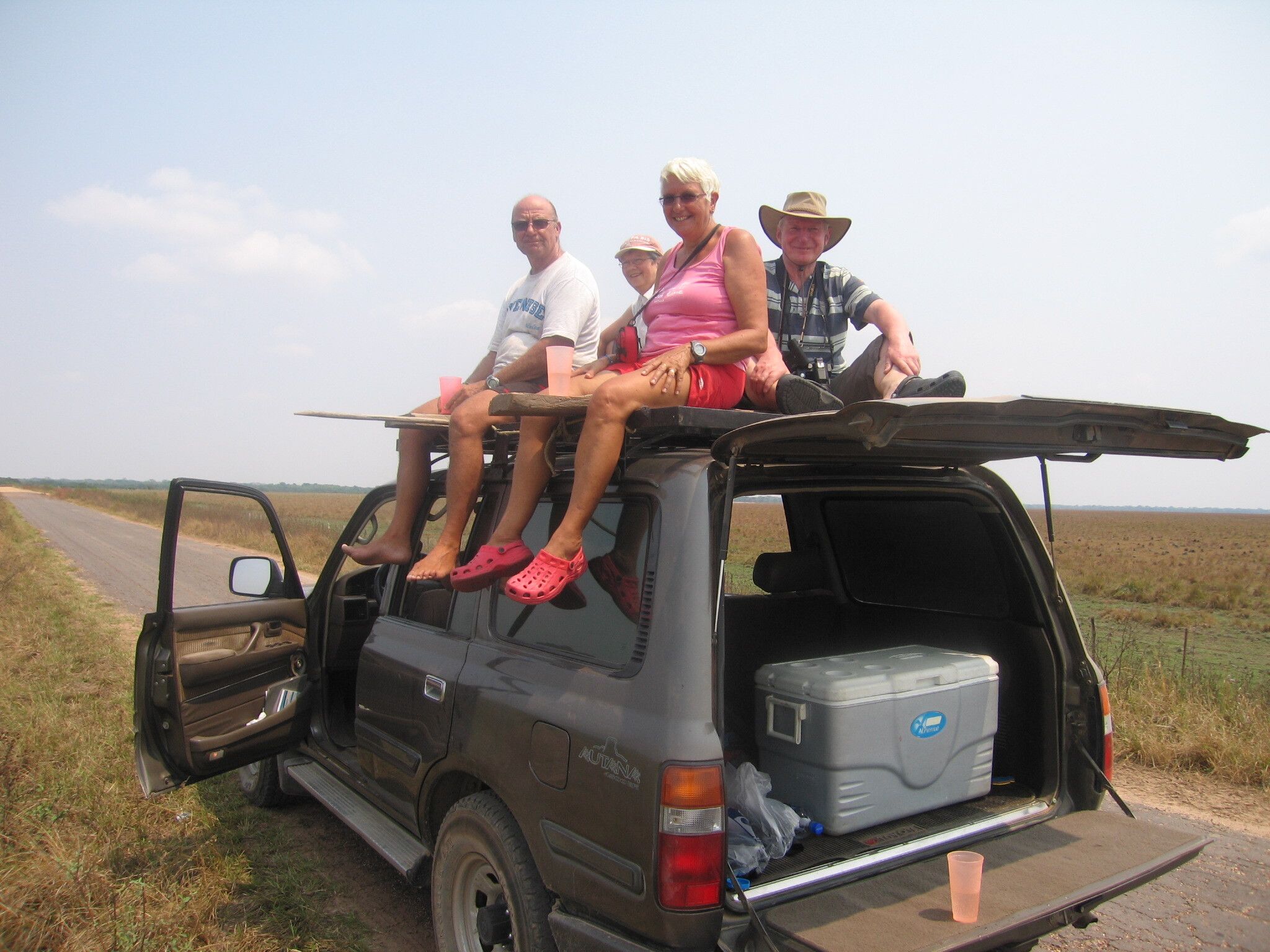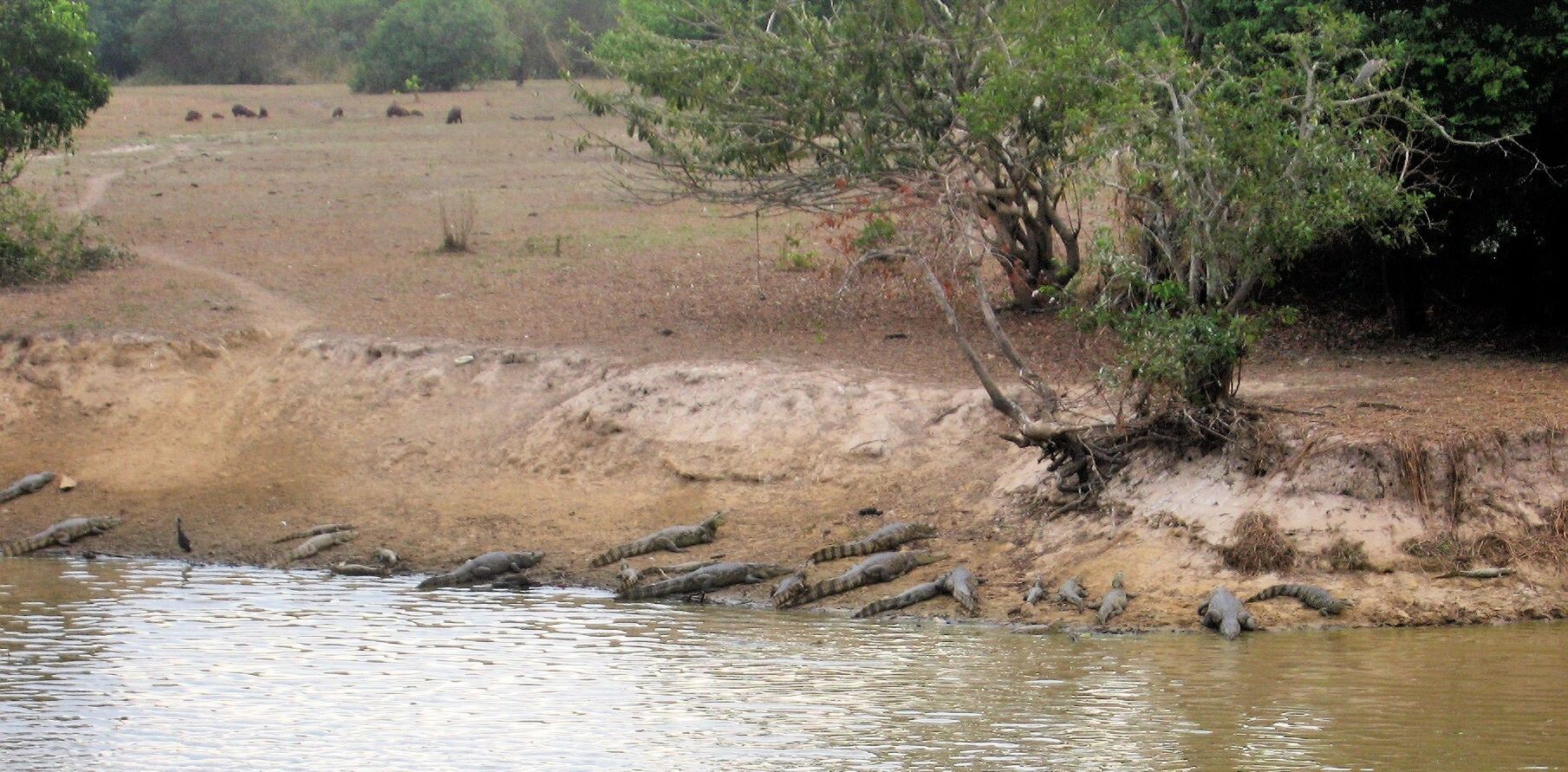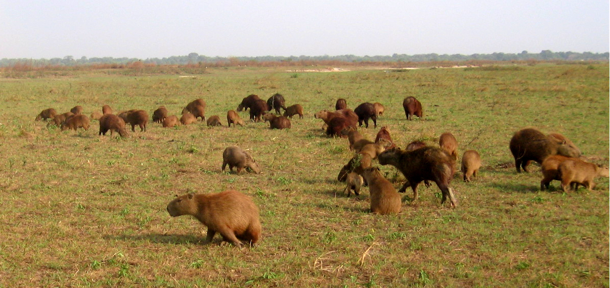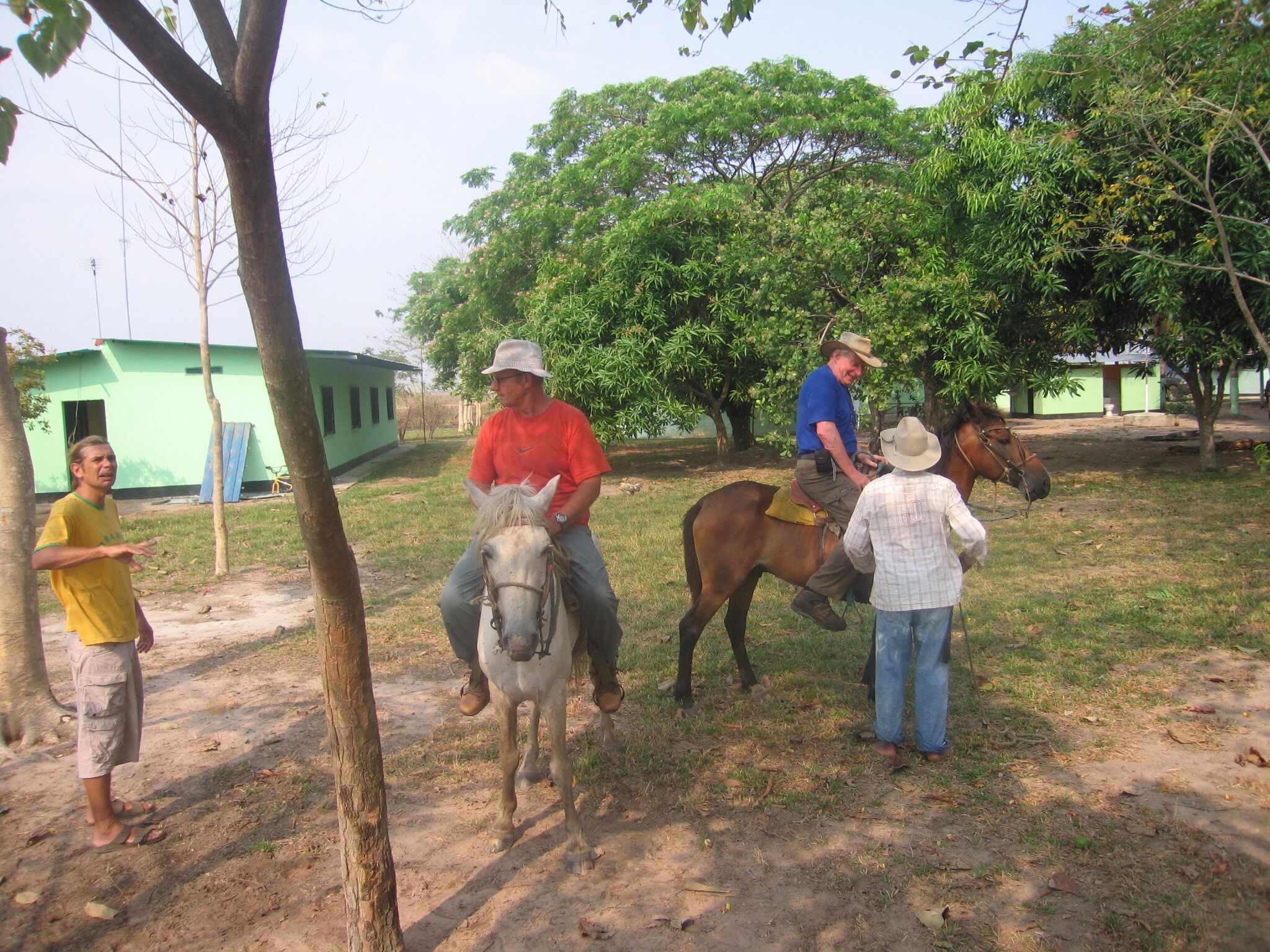 Von 9h15 – 11h15 sitzen wir alle auf den Pferderücken. Paul steigt aber ganz schnell wegen Rückenproblemen wieder von seinem Gaul herunter und bleibt mit Matthias zurück. Wir trotten mit unserem Führer Licandro durch die Savanne und suchen Ameisenbären. Aber ausser einem Reh und zwei kleinen Erd-Eulen sehen wir nicht besonders viel. Es ist gewaltig heiss! Wir sind alle drei froh, nach zwei Stunden wieder von den Rössern herunter zu steigen. Wobei ich unheimlich stolz darauf bin, dass mein Gaul meistens das gemacht hat, was ich von ihm wollte. Matthias hat mit Paul unterdessen eine Tier-Entdeckungsfahrt mit dem Auto unternommen. Um 11h30 wird schon das Mittagessen serviert: Spaghetti, Hähnchen, Salat, Wassermelone. So gegen 12h15-14 sind wir schon wieder mit Matthias im Auto unterwegs: Tiere schauen. Viele, viele, überhaupt nicht scheue Wasserschweine, Krokodile im Wasser die sich abkühlen und auch wieder jede Menge von Vögeln. Darunter auch eine riesige Gruppe von roten Ibissen in einer grünen Wiese. Ein toller Anblick! Von Weitem sieht es aus wie ein Mohnfeld bei uns. Von 14h – 15h haben wir Pause, dann geht es wieder per Auto auf die Pirsch. Wir begegnen Unmengen von Wasserschweinen, Wildschweinen, wilden Hausschweinen, unheimlich vielen Krokodilen, Rehen, Wasserbüffeln, Schildkröten, Leguanen und allen Sorten Vögeln die man sich denken kann. Nur einen Ameisenbären treffen wir nicht an. Es ist enorm heiss, ca. 37° und es hat seit 4 oder 5 Monaten nicht mehr geregnet. Die Wassertümpel werden immer ausgetrockneter und wir sehen viele tote Piranhas, weil das Wasser in den Tümpeln zu heiss wird.