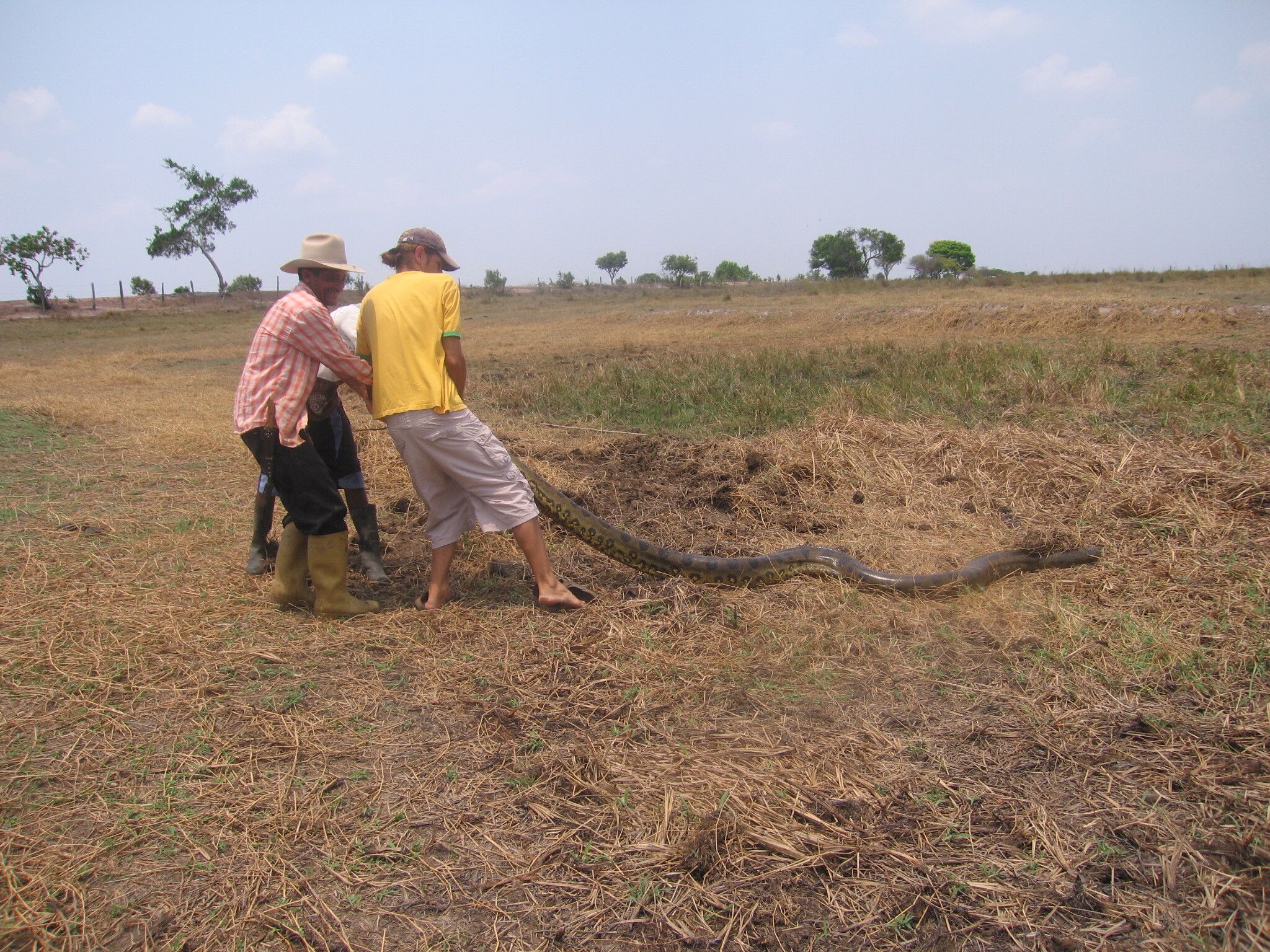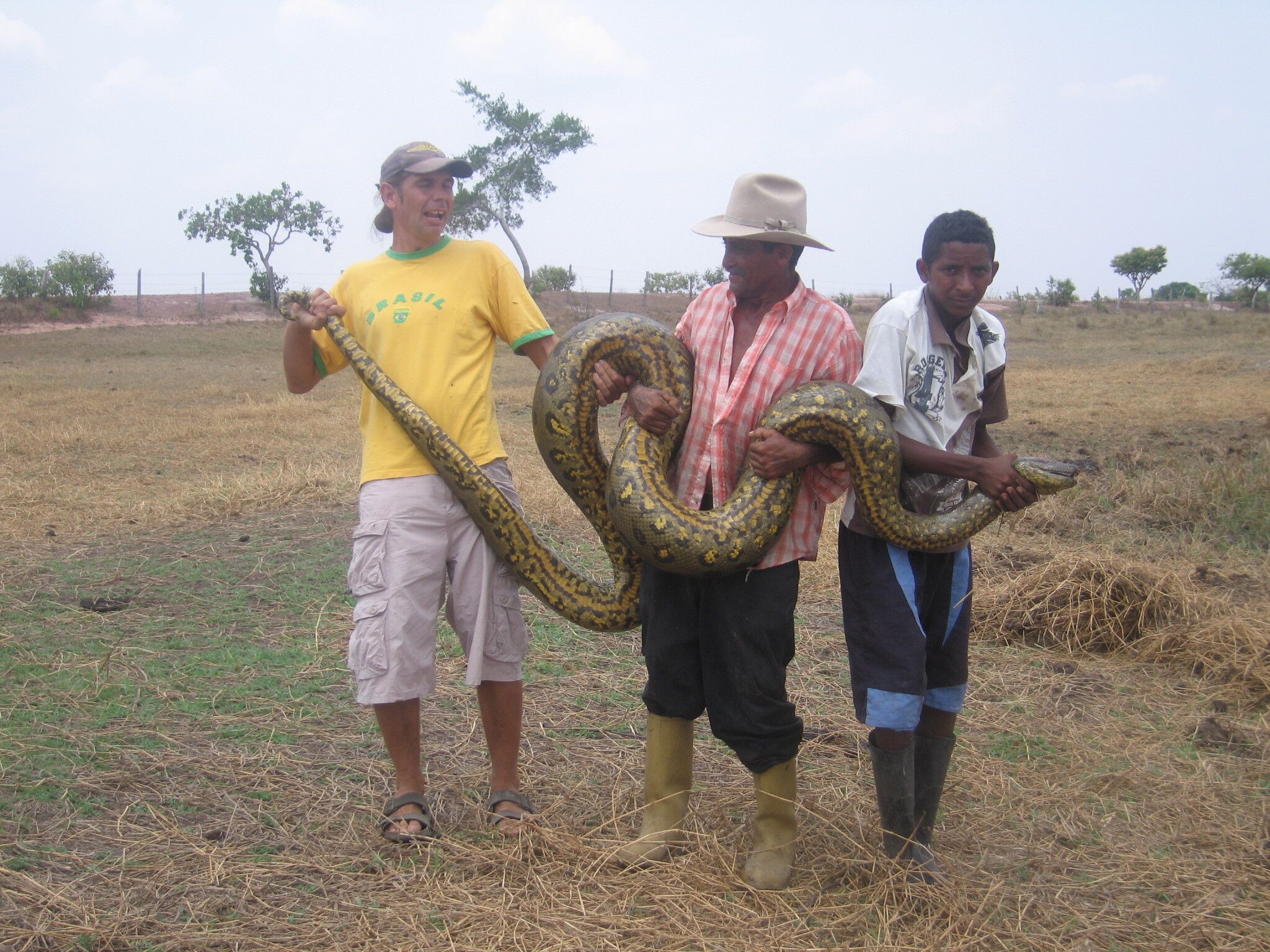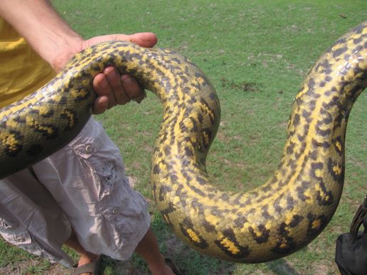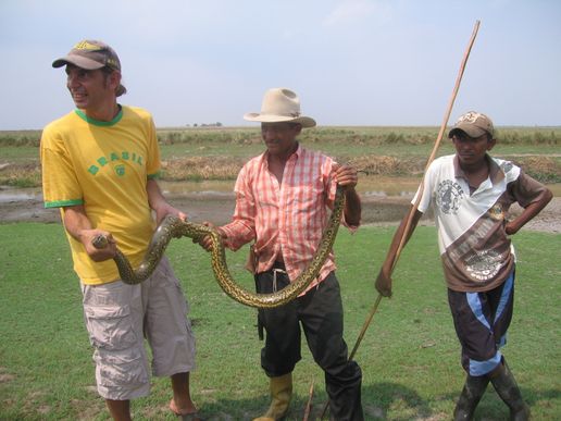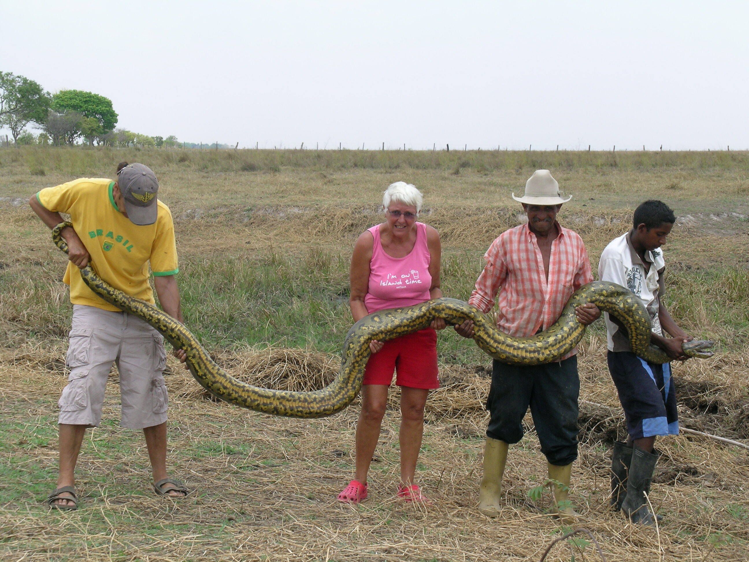 Wir schlafen alle vier in einem runden Raum. Vier Hängematten sind aufgehängt und es hat zwei steinharte Betten. Die Männer scheinen ganz gut geschlafen zu haben in ihren ungewohnten Hängematten. Ich habe nicht besonders viel geschlafen diese Nacht und Edith auch nicht. In unserem Häuschen hat es zwei Duschen und zwei WC's. Die WC's funktionieren soweit ganz gut, aber bei einer der Duschen und beim Lavabo hat es keine Wasserhahnen! Im Schlafraum hat es rundherum 9 grosse Fenster, ohne Fenster, nur mit Moskitogittern davor. Um 03h bellen zwei Hunde vor unserer Türe. Ob wohl ein grosses Krokodil durch's Camp schleicht? Zwischen 5h30 und 7h erleben wir ein unheimlich vielfältiges und gewaltiges Vogelstimmenkonzert. Nach dem Konzert wird geduscht, draussen hat es noch ein paar Duschen mit Wasserhahnen. Aber das Camp ist ein wenig primitiv eingerichtet für uns verwöhnte Touristen! Ich stehe zum Beispiel duschbereit unter der Dusche und es kommt kein einziger Tropfen Wasser! Ich ziehe mich wieder an und frage draussen den Campchef Licandro, ob es kein Wasser habe? „Un momentito!“ sagt er, verschwindet zur Wasserpumpe und kurz darauf kann ich tatsächlich doch noch duschen. Um 8h gibt es Frühstück mit Rührei und Omeletten. Nachdem Paul und Matthias etwas am Toyota repariert haben, geht es auf eine Beobachtungstour. Wir vier Touristen sitzen oben auf dem Dach des Landcruisers. Matthias, der Campchef Licandro und sein 16 jähriger Sohn Oman sitzen im Auto drin. Mir gefällt es hier oben auf dem luftigen Autodach sehr gut und ich könnte den ganzen Tag nur in die Ebenen schauen! Das ist echt „cool“! Wir sehen viele Schildkröten und jede Menge Krokodile die sich sonnen, dazu tausenderlei Sorten Vögel. Dazwischen immer wieder die knochendürren Zeburinder auf den Weiden, die uns blöd anstarren. Licandro und sein Sohn suchen nun für uns in den Wassertümpeln eine Anaconda, eine Riesenschlange. Dazu stochern sie mit einer langen Stange zwischen den Wasserpflanzen herum und sie finden doch tatsächlich eine kleine, etwa 2½ m lange, wunderschön gezeichnete Anaconda. Aber die ist scheinbar zu klein! Sie lassen sie vorsichtig wieder ins Wasser und suchen weiter nach einer Grösseren. In einem anderen Wasserloch werden sie fündig und reissen ein mächtiges Anaconda-Exemplar aus dem Wasser. Das Tier ist wunderschön, sehr schwer und enorm kräftig. Ein Megavieh! Drei Männer haben alle Mühe das etwa 5m lange Reptil zu halten. Auch diese Schlange wird wieder unversehrt in ihr Element zurückentlassen. Um 12h30 sind wir zum Mittagessen zurück im Camp. Es gibt Huhn in Sauce, Reis, Tomaten-Gurken-Zwiebeln-Salat. Danach Melonen. Das Essen ist eigentlich immer sehr gut, nur die „Umgebung“ ist ziemlich „schmuddelig!“. So bleiben wir zum Beispiel öfters am Plastiktischtuch des Esstisches „kleben“! Jetzt haben wir bis um 14h30 Siesta. Es ist aber auch höllisch heiss hier und wir ruhen uns ganz gerne ein wenig aus. Von 15h – 19h15 ist Tierbeobachtung angesagt. Bevor wir aber zum Fluss kommen, entdeckt Licandro in einem Baum schon einen kleinen Ameisenbären, der uns ganz erstaunt anschaut. Danach geht es mit einem Langboot mit 40 PS Aussenborder los. Wir sehen wieder Hunderte von Krokodilen in und am Wasser. Der Sohn von Licandro taucht in den trüben Fluss und befördert eine urtümliche Schildkröte zu Tage. Die ist steinhässlich und stinkt schauerlich, aber sie hat einen wunderschönen Panzer. Zum Glück darf sie sehr schnell wieder in ihren Schlick abtauchen. Am Ufer sonnen sich viele grosse Leguane. Nun wollen Licandro und sein Sohn Oman unbedingt ein grosses Krokodil fangen um es uns zu präsentieren. Jedesmal wenn wir uns mit dem Boot nähern, suchen die Krokos schnell das Weite. Licandro und Sohn versuchen es mit Lassos und einer Stange mit einer Schlinge daran. Wir schauen dem Treiben eine Weile zu und dann bitten wir Matthias und die beiden, damit aufzuhören. Wir brauchen das nicht zu haben, wir sehen die Tiere lieber in Freiheit. Und es hat jede Menge davon: Wasserschweine, Brüllaffen, Flussdelfine, Acure (eine Art grosse Ratten), eine Seehunde-Mamma mit ihrem Baby, das jämmerlich schreit! Und dazu eine unheimliche Artenvielfalt an Vögeln. Es ist einfach unbeschreiblich und mir fehlen die Worte...! Bei der Rückkehr zum Auto, um 18h30, liegt ein grosses Krokodil davor. Zum Glück verschwindet es ganz schnell im Wasser, als wir ankommen. Auf dem Heimweg sehen wir vom Auto aus zwei Rehe. Um 19h15 sind wir zurück im Camp und freuen uns alle unheimlich auf eine erfrischende Dusche. Und es hat sogar Wasser. Aber, in den WC-Schüsseln hat es unter dem Rand ziemlich grosse, braune Frösche die herausspringen, wenn man spült! Uahhh..., da erschrickt man ganz schön! Wieder gibt es ein sehr gutes Essen: Rindsgulasch, Reis, warmer Kartoffel-Rüebli-Eiersalat, Honigmelone. Heinz bringt uns nach dem Essen noch ein Ständchen auf der Mundharmonika. Wow, war das ein eindrücklicher Tag heute!