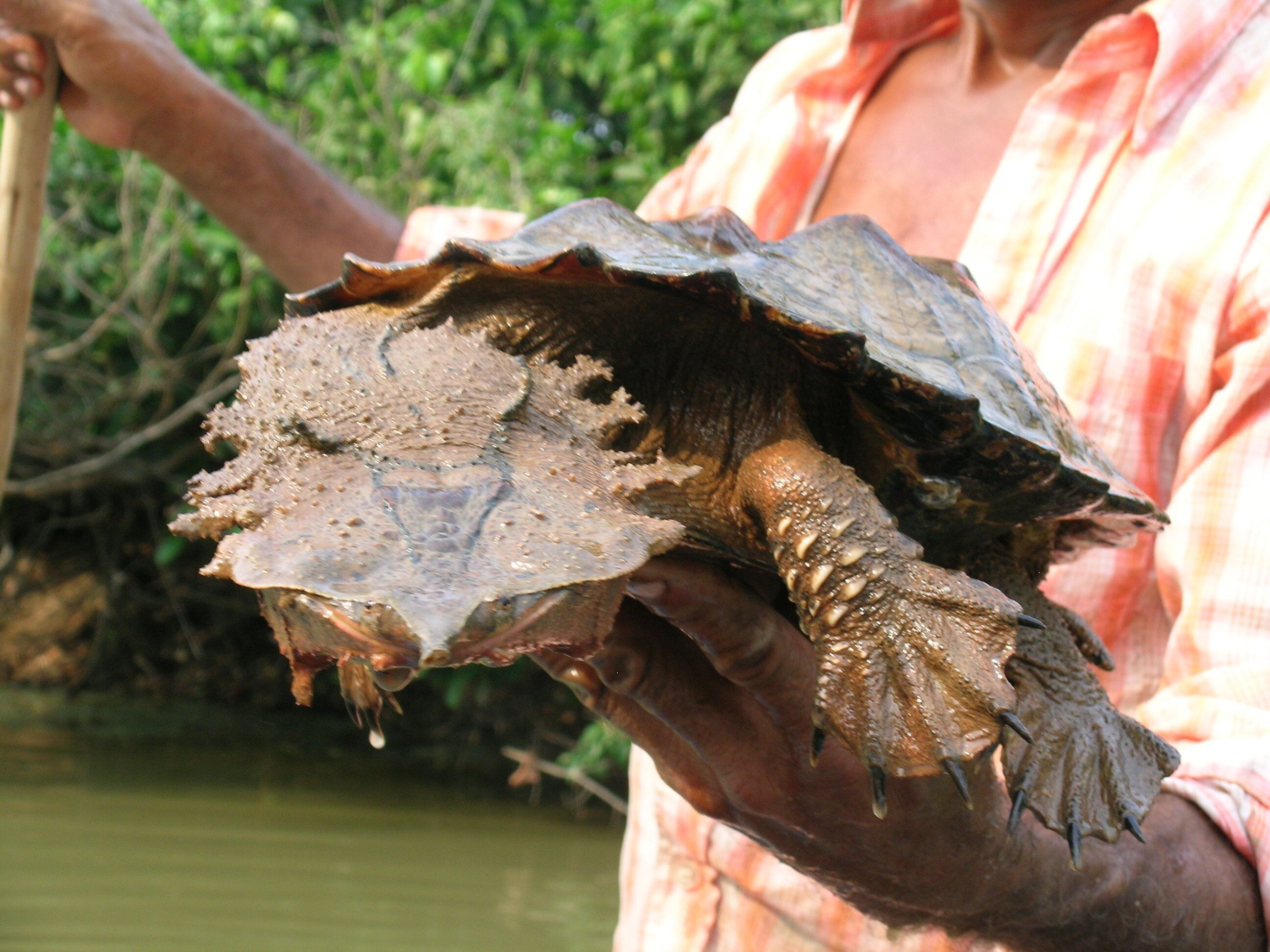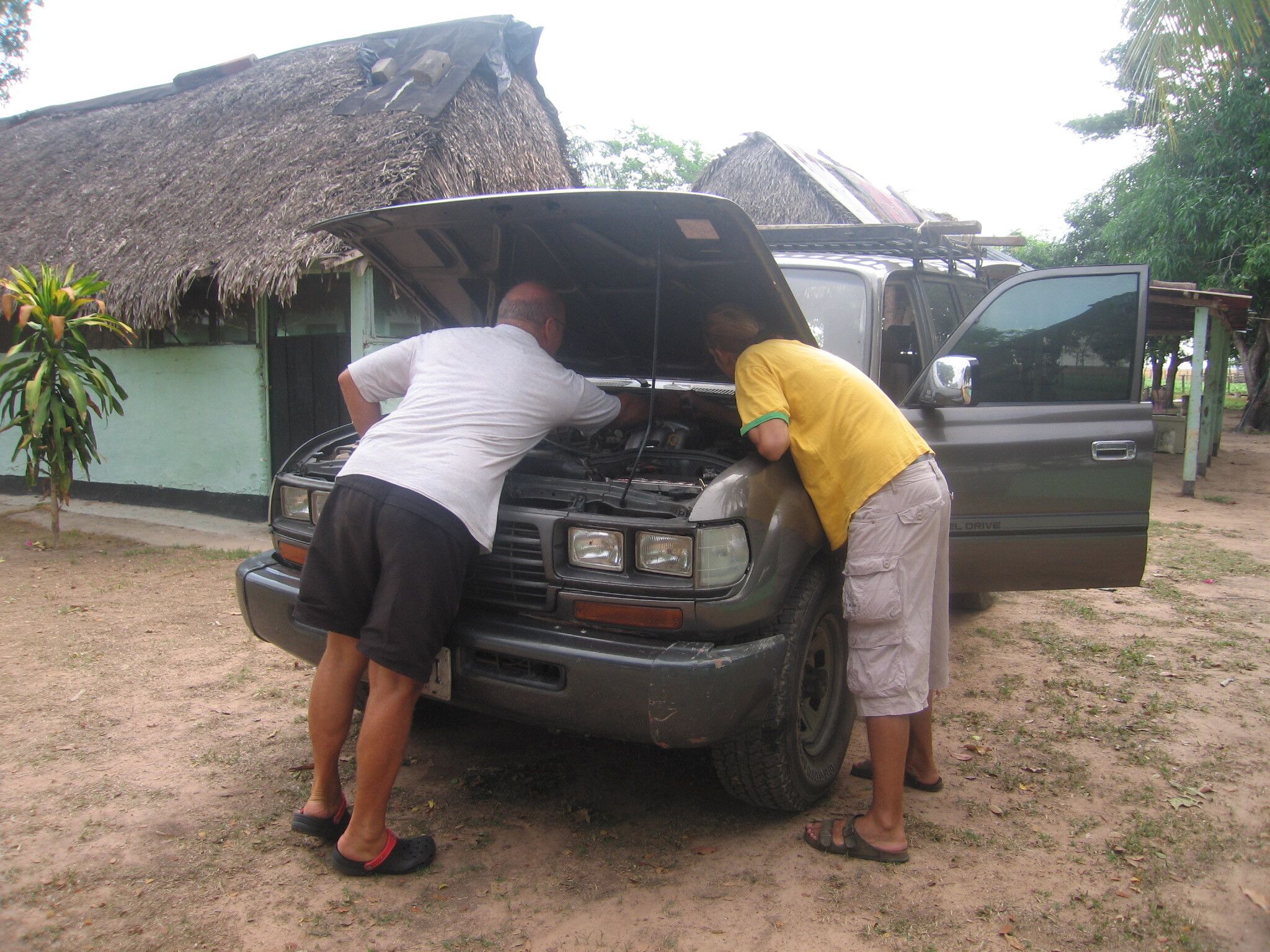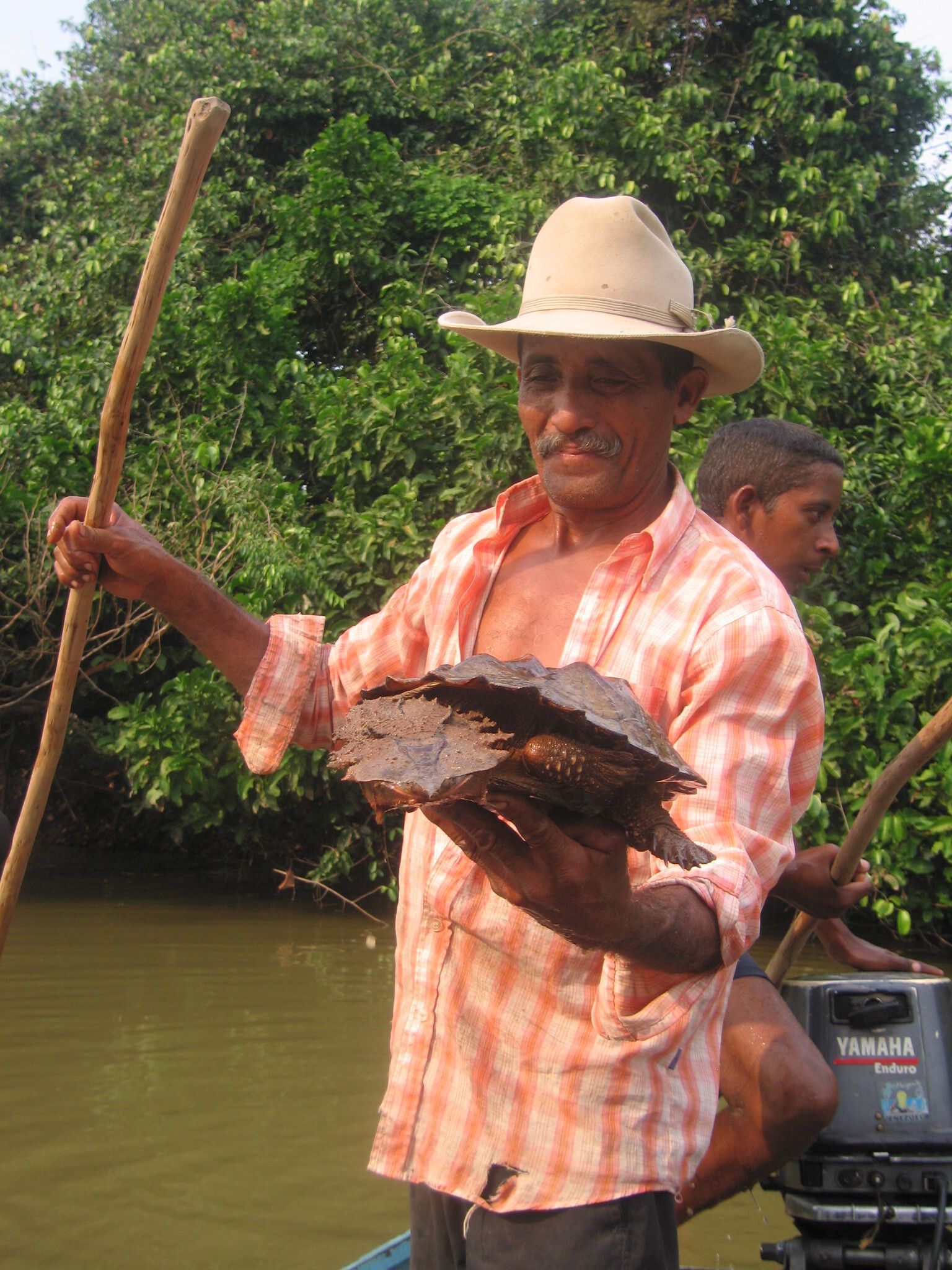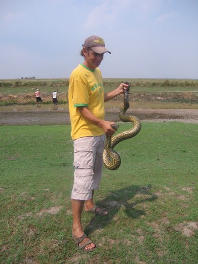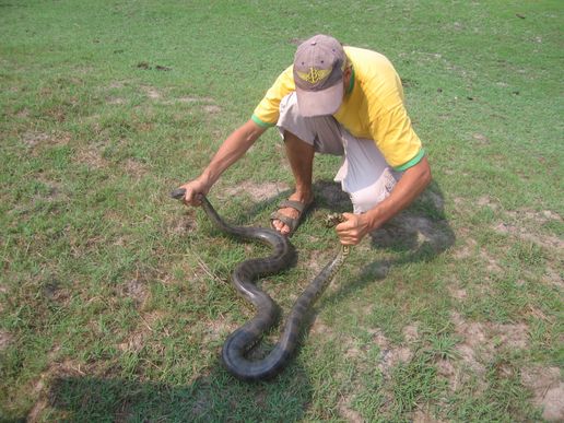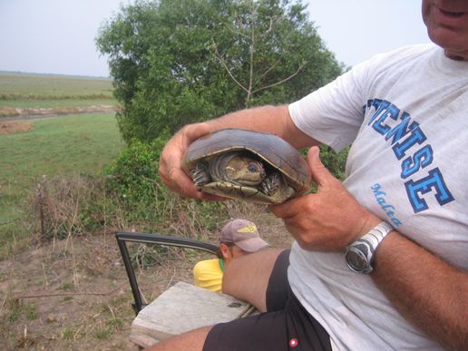 Wir schlafen alle vier in einem runden Raum. Vier Hängematten sind aufgehängt und es hat zwei steinharte Betten. Die Männer scheinen ganz gut geschlafen zu haben in ihren ungewohnten Hängematten. Ich habe nicht besonders viel geschlafen diese Nacht und Edith auch nicht. In unserem Häuschen hat es zwei Duschen und zwei WC's. Die WC's funktionieren soweit ganz gut, aber bei einer der Duschen und beim Lavabo hat es keine Wasserhahnen! Im Schlafraum hat es rundherum 9 grosse Fenster, ohne Fenster, nur mit Moskitogittern davor. Um 03h bellen zwei Hunde vor unserer Türe. Ob wohl ein grosses Krokodil durch's Camp schleicht? Zwischen 5h30 und 7h erleben wir ein unheimlich vielfältiges und gewaltiges Vogelstimmenkonzert. Nach dem Konzert wird geduscht, draussen hat es noch ein paar Duschen mit Wasserhahnen. Aber das Camp ist ein wenig primitiv eingerichtet für uns verwöhnte Touristen! Ich stehe zum Beispiel duschbereit unter der Dusche und es kommt kein einziger Tropfen Wasser! Ich ziehe mich wieder an und frage draussen den Campchef Licandro, ob es kein Wasser habe? „Un momentito!“ sagt er, verschwindet zur Wasserpumpe und kurz darauf kann ich tatsächlich doch noch duschen. Um 8h gibt es Frühstück mit Rührei und Omeletten. Nachdem Paul und Matthias etwas am Toyota repariert haben, geht es auf eine Beobachtungstour. Wir vier Touristen sitzen oben auf dem Dach des Landcruisers. Matthias, der Campchef Licandro und sein 16 jähriger Sohn Oman sitzen im Auto drin. Mir gefällt es hier oben auf dem luftigen Autodach sehr gut und ich könnte den ganzen Tag nur in die Ebenen schauen! Das ist echt „cool“! Wir sehen viele Schildkröten und jede Menge Krokodile die sich sonnen, dazu tausenderlei Sorten Vögel. Dazwischen immer wieder die knochendürren Zeburinder auf den Weiden, die uns blöd anstarren. Licandro und sein Sohn suchen nun für uns in den Wassertümpeln eine Anaconda, eine Riesenschlange. Dazu stochern sie mit einer langen Stange zwischen den Wasserpflanzen herum und sie finden doch tatsächlich eine kleine, etwa 2½ m lange, wunderschön gezeichnete Anaconda. Aber die ist scheinbar zu klein! Sie lassen sie vorsichtig wieder ins Wasser und suchen weiter nach einer Grösseren. In einem anderen Wasserloch werden sie fündig und reissen ein mächtiges Anaconda-Exemplar aus dem Wasser. Das Tier ist wunderschön, sehr schwer und enorm kräftig. Ein Megavieh! Drei Männer haben alle Mühe das etwa 5m lange Reptil zu halten. Auch diese Schlange wird wieder unversehrt in ihr Element zurückentlassen. Um 12h30 sind wir zum Mittagessen zurück im Camp. Es gibt Huhn in Sauce, Reis, Tomaten-Gurken-Zwiebeln-Salat. Danach Melonen. Das Essen ist eigentlich immer sehr gut, nur die „Umgebung“ ist ziemlich „schmuddelig!“. So bleiben wir zum Beispiel öfters am Plastiktischtuch des Esstisches „kleben“! Jetzt haben wir bis um 14h30 Siesta. Es ist aber auch höllisch heiss hier und wir ruhen uns ganz gerne ein wenig aus. Von 15h – 19h15 ist Tierbeobachtung angesagt. Bevor wir aber zum Fluss kommen, entdeckt Licandro in einem Baum schon einen kleinen Ameisenbären, der uns ganz erstaunt anschaut. Danach geht es mit einem Langboot mit 40 PS Aussenborder los. Wir sehen wieder Hunderte von Krokodilen in und am Wasser. Der Sohn von Licandro taucht in den trüben Fluss und befördert eine urtümliche Schildkröte zu Tage. Die ist steinhässlich und stinkt schauerlich, aber sie hat einen wunderschönen Panzer. Zum Glück darf sie sehr schnell wieder in ihren Schlick abtauchen. Am Ufer sonnen sich viele grosse Leguane. Nun wollen Licandro und sein Sohn Oman unbedingt ein grosses Krokodil fangen um es uns zu präsentieren. Jedesmal wenn wir uns mit dem Boot nähern, suchen die Krokos schnell das Weite. Licandro und Sohn versuchen es mit Lassos und einer Stange mit einer Schlinge daran. Wir schauen dem Treiben eine Weile zu und dann bitten wir Matthias und die beiden, damit aufzuhören. Wir brauchen das nicht zu haben, wir sehen die Tiere lieber in Freiheit. Und es hat jede Menge davon: Wasserschweine, Brüllaffen, Flussdelfine, Acure (eine Art grosse Ratten), eine Seehunde-Mamma mit ihrem Baby, das jämmerlich schreit! Und dazu eine unheimliche Artenvielfalt an Vögeln. Es ist einfach unbeschreiblich und mir fehlen die Worte...! Bei der Rückkehr zum Auto, um 18h30, liegt ein grosses Krokodil davor. Zum Glück verschwindet es ganz schnell im Wasser, als wir ankommen. Auf dem Heimweg sehen wir vom Auto aus zwei Rehe. Um 19h15 sind wir zurück im Camp und freuen uns alle unheimlich auf eine erfrischende Dusche. Und es hat sogar Wasser. Aber, in den WC-Schüsseln hat es unter dem Rand ziemlich grosse, braune Frösche die herausspringen, wenn man spült! Uahhh..., da erschrickt man ganz schön! Wieder gibt es ein sehr gutes Essen: Rindsgulasch, Reis, warmer Kartoffel-Rüebli-Eiersalat, Honigmelone. Heinz bringt uns nach dem Essen noch ein Ständchen auf der Mundharmonika. Wow, war das ein eindrücklicher Tag heute!