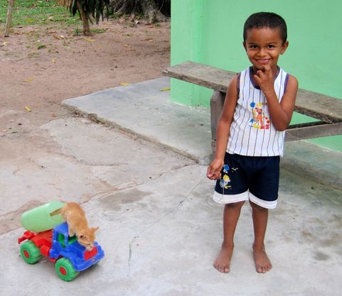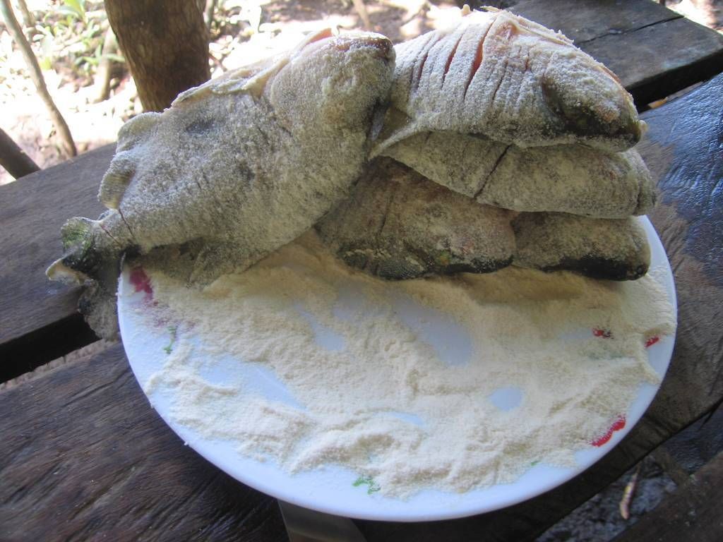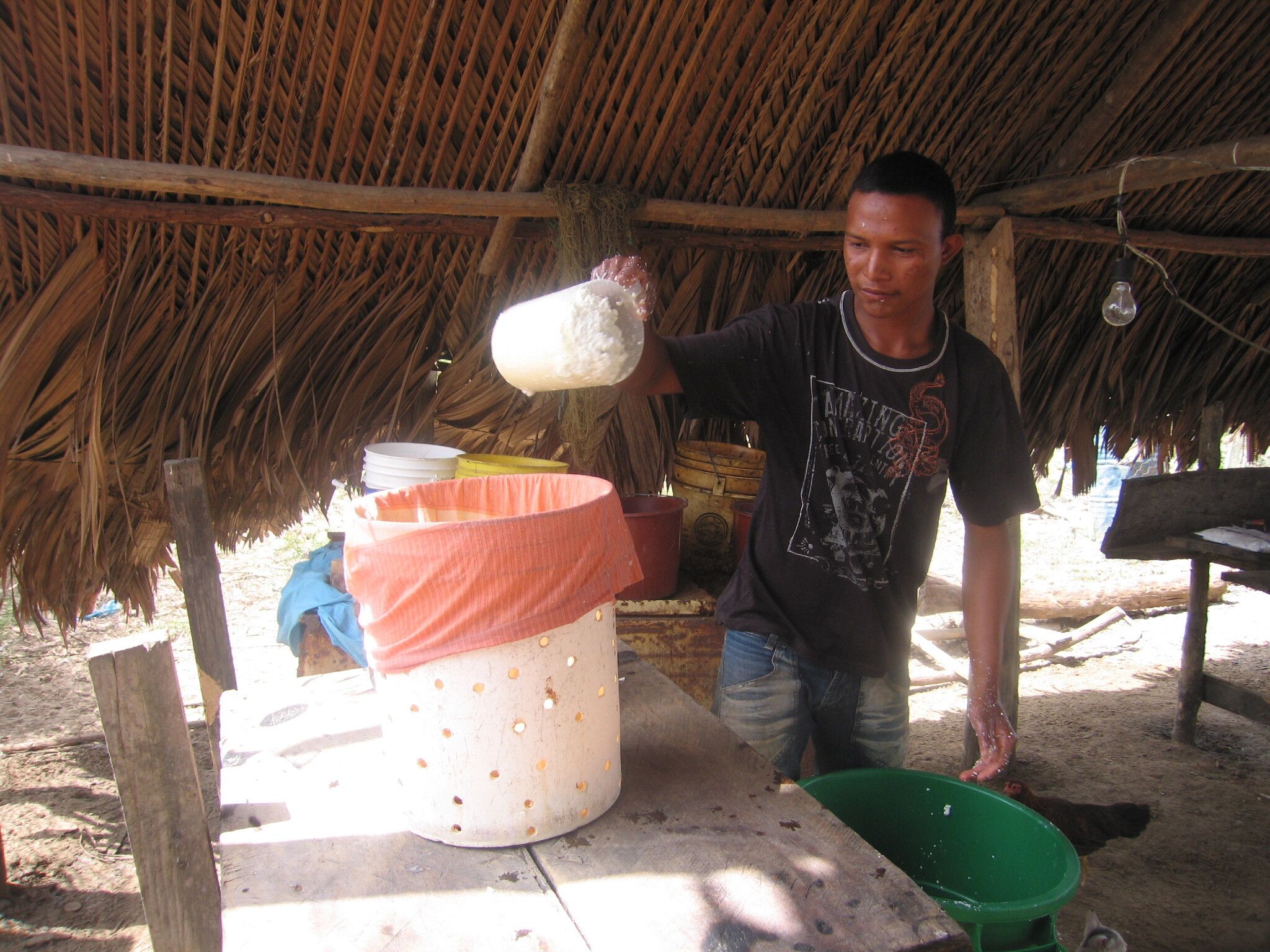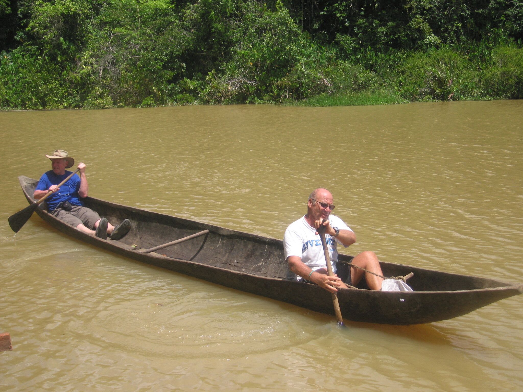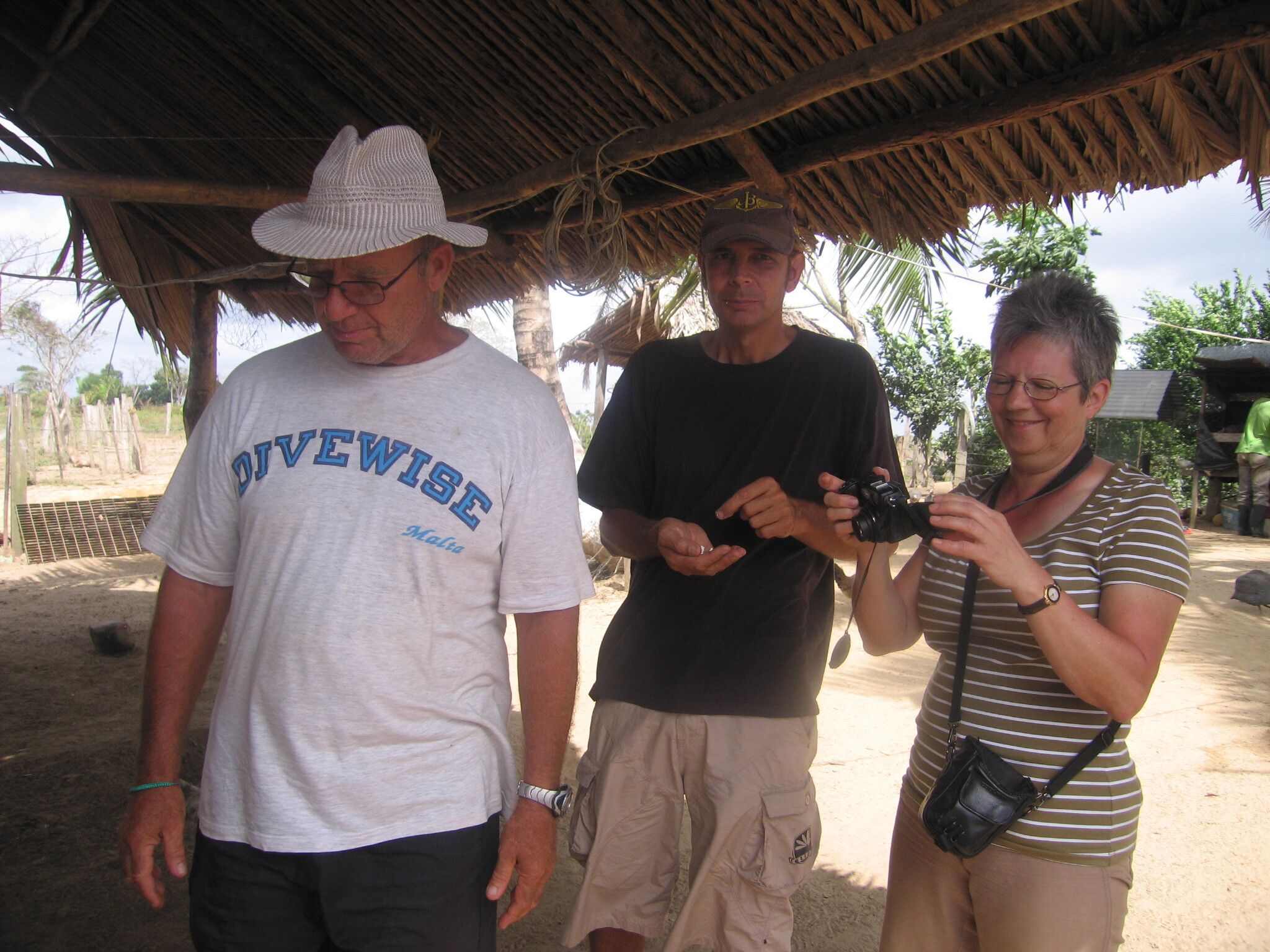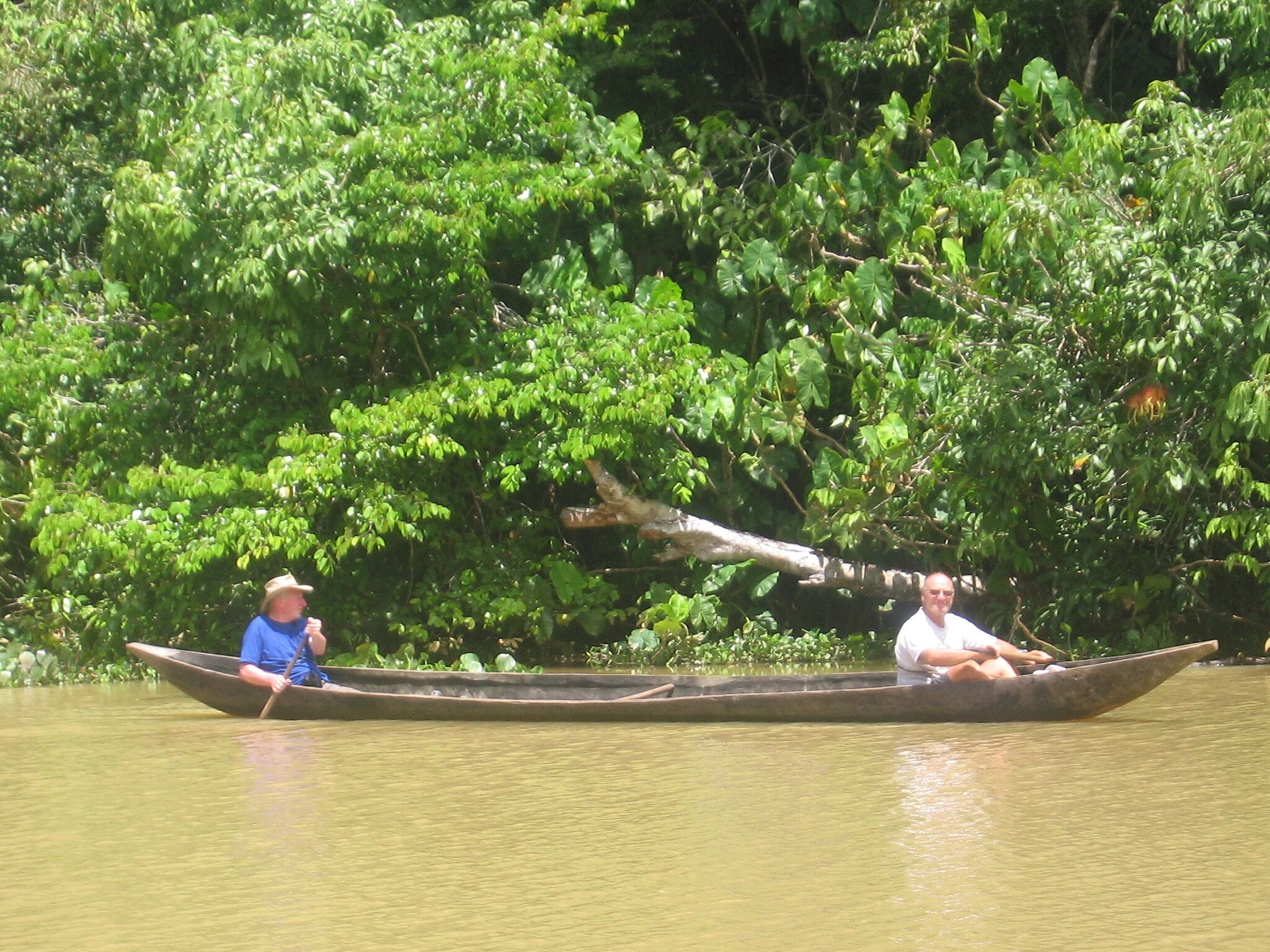 Heute müssen wir mal nicht so früh aufstehen. Trotzdem sind wir alle schon um 7h wach. Sobald es hell wird, so gegen 5h30 erwacht der Regenwald zu neuem Leben und es ertönen vielerlei Tierstimmen. Um 8h gibt es Frühstück. In diesem Camp ist es wunderbar und schön, wenn nur die blöden Stechfliegen nicht wären! Sie piesacken uns wo sie nur können. Um 9h steigen wir wieder ins Motorboot und tuckern zu einer Wasserbüffel-Farm. Hier sehen wir zufällig, wie Büffelkäse hergestellt wird. Hinter der Farm steht eine Wasserbüffel-Mamma mit ihrem Wasserbüffelkälbchen im Wasser. Matthias zeigt uns wie Maniok- oder Yuca-Pflanzen aussehen. Auf dem Rückweg zum Camp sehen wir wieder Kapuzineraffen auf einem Baum mit wunderschönen roten Blüten und acht Ara-Papageien. Um 10h50 sind wir zurück im Camp und Heinz und Paul drehen alleine noch eine Runde im Einbaum. Das ist nämlich gar nicht so einfach! Um 11h30 gibt es schon Mittagessen: Thon gemischt mit diversen Salaten. Um 12h15 verlassen wir das Camp und geniessen noch einmal die Bootsfahrt auf dem Fluss. Ca. 35 Minuten später steigen wir in San José de Buja um ins Auto von Matthias. Bereits um 16h20 sind wir, gesund und voller neuer Eindrücke, aber auch mit vielen Mückenstichen, zurück auf der MABUHAY. Wir waschen sofort eine Maschine voll verschwitzter Wäsche.