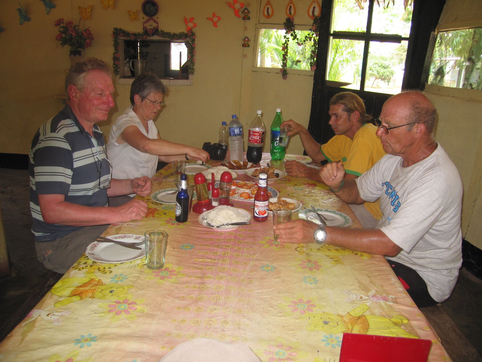 Gegen 16h wird es immer dunkler, es windet, blitzt und donnert. Aber Regen gibt es, da wo wir sind, nur ein paar Tropfen. Um 18h sind wir zurück in unserem Camp und geniessen wieder eine kühlende Dusche. Licandro schenkt uns etwa 4 Kilo Mangos, frisch von seinen Bäumen im Hof. Nach dem Nachtessen spendiert uns Matthias eine Flasche Rosé und später machen wir es uns in unserem Bungalow gemütlich. Edith und ich in unseren harten Betten, Heinz und Paul in den Hängematten. Auf dem Betonboden brennt eine Kerze. Heinz spielt auf seiner Mundharmonika und Edith und Paul singen dazu. Ich wusste gar nicht, dass die beiden so schön singen können!