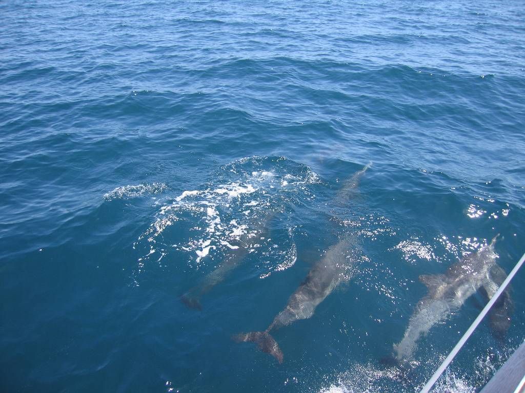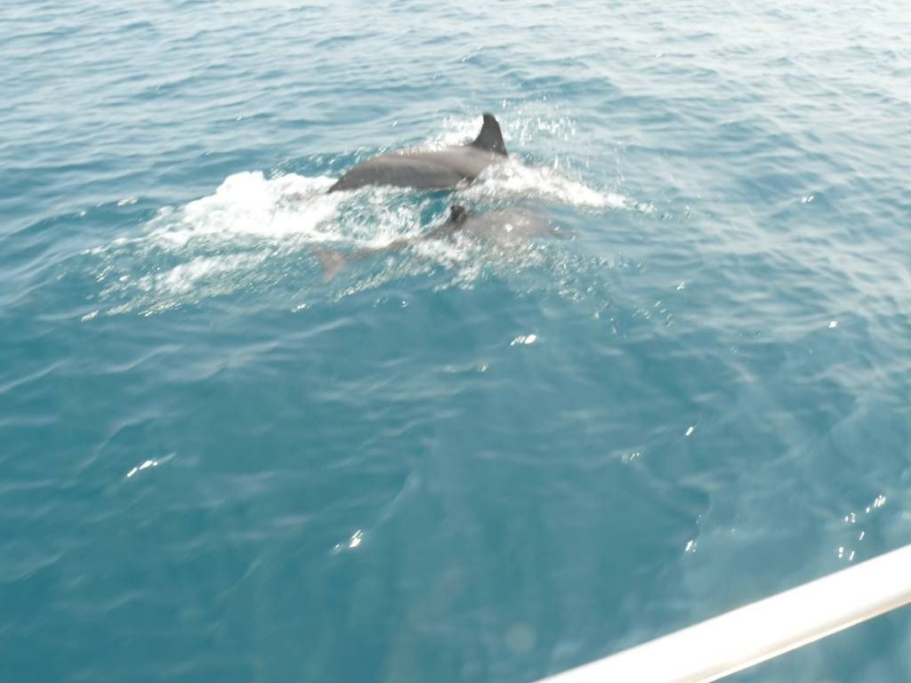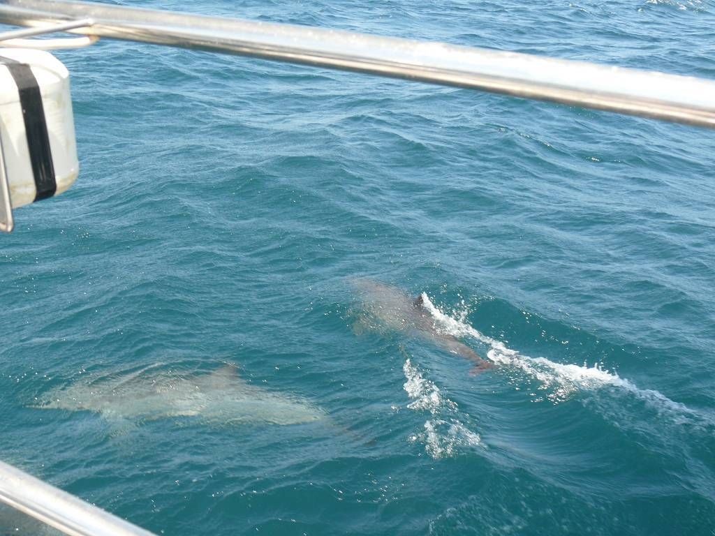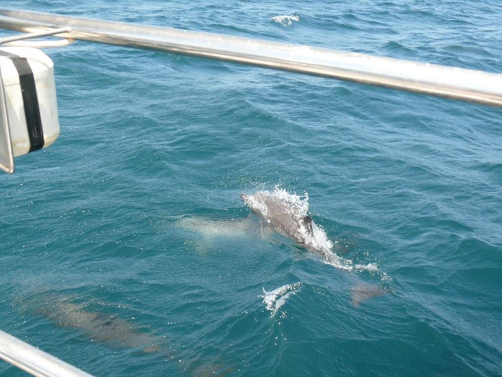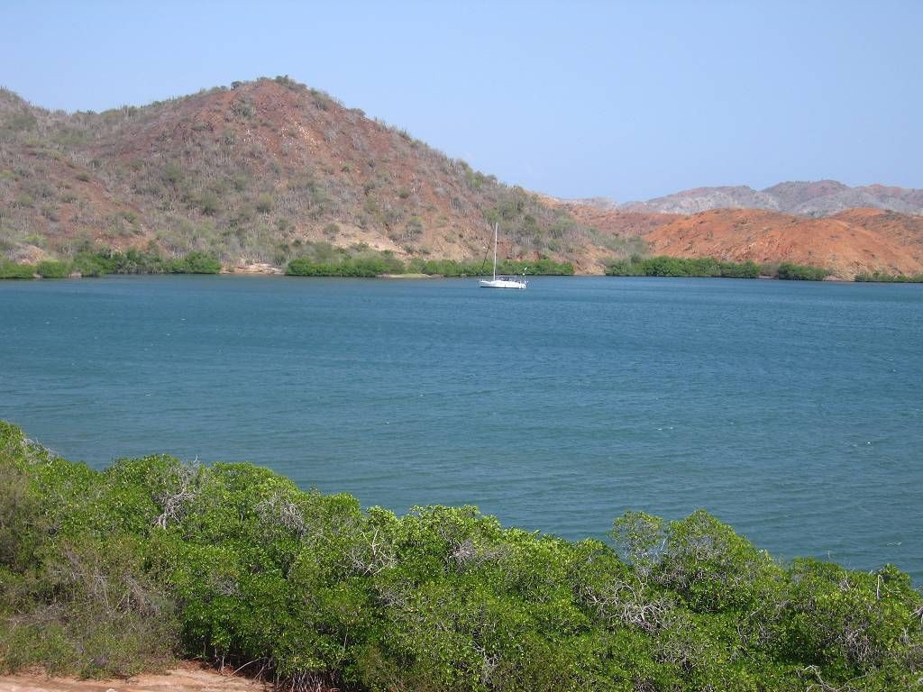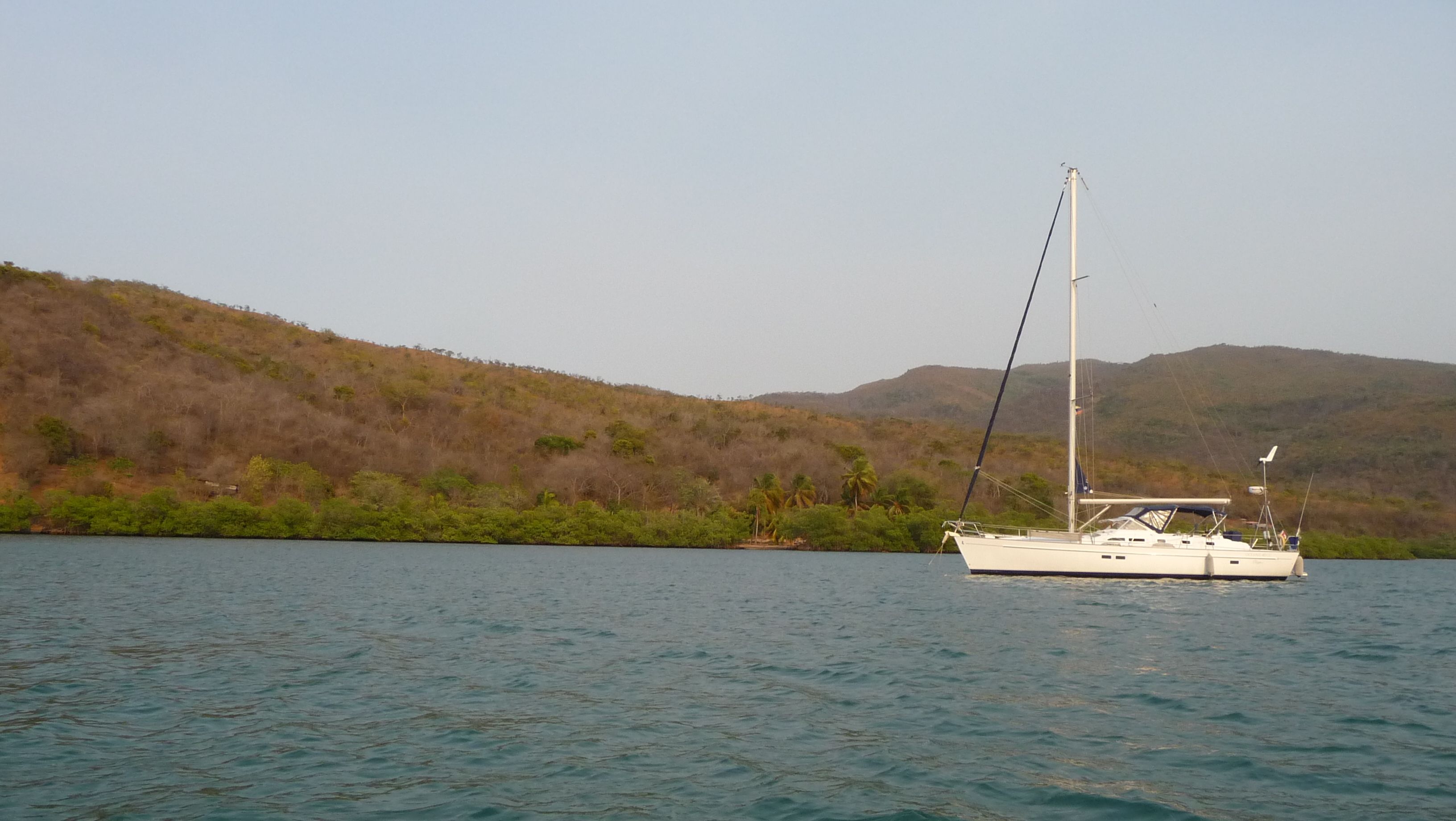 Um 8h40 lösen wir die Leinen vom Steg der Marina und fahren los, Richtung Osten. Es hat keinen Wind und wir motoren. Unser Ziel ist der Mochima-Nationalpark. Wir wollen bis zum Ort Mochima, ein sehr gemütlicher Törn, zur Angewöhnung, für ängstliche Gäste. Um 10h30 sehen wir die ersten Delfine. Eine kleine Gruppe begleitet uns, vorne am Bug schwimmend. Der grössere Teil der Schule widmet sich lieber dem Fressen. 20 Minuten später, schon wieder Delfine! Aber diese sind ziemlich weit weg. Um 12h50: Delfine! Und immer wieder sehen wir ein paar Delfine. Um 14h45 kommen wir am wunderbar ruhigen Ankerplatz vor dem Dorf Mochima an. Wir geniessen ein Bad im angenehm warmen Wasser. Nach dem Abendessen spielt uns Heinz wieder mal ein wenig auf der Mundharmonika vor und wir haben es ziemlich fidel an Bord der MABUHAY.