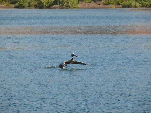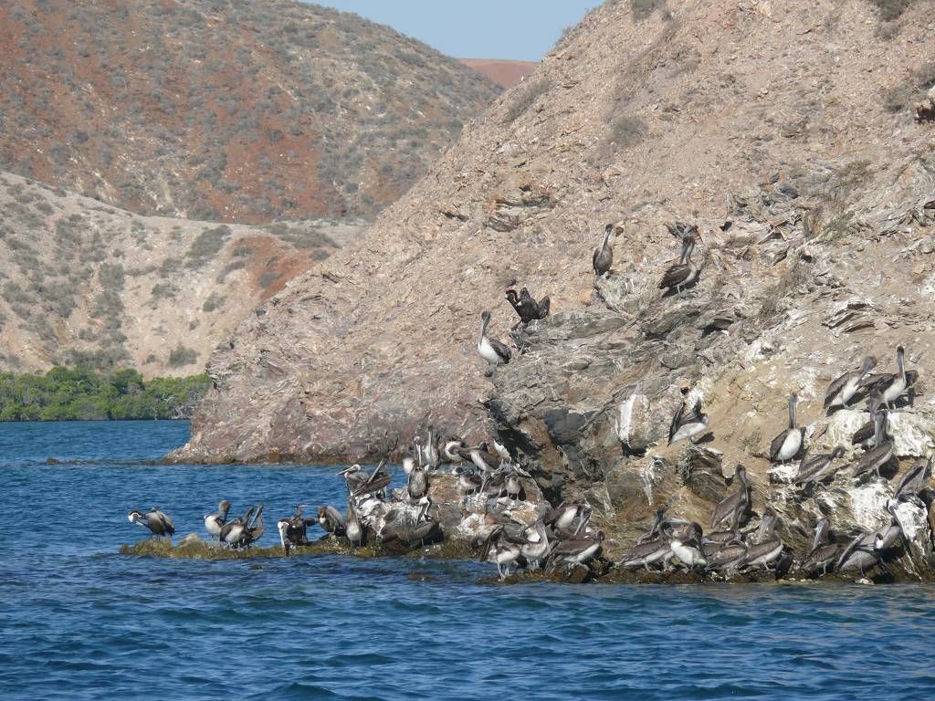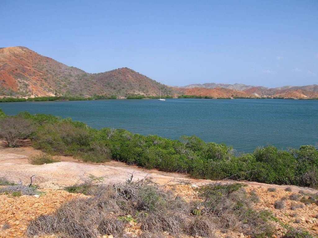 Um 8h35 geht es los. Auch heute hat es wieder ziemlich viel Wind und grosse Wellen und Gegenströmung. Wir motoren gegenan. Edith übersteht die heutige Fahrt mit einer Tablette sehr gut. Immer wieder sehen wir Delfine, die uns eine Weile begleiten, es ist schon bald langweilig! Nach 2 Stunden und 10 Minuten treffen wir an unserem nächsten Ankerplatz in der Laguna Grande ein. Die Laguna Grande ist traumhaft schön! Grüne Mangroven säumen das blaue Wasser, darüber rote Berge mit haufenweise Kakteen. Wunderschön! Die Lagune hat viele verschiedene Buchten. Wir suchen uns eine sehr schöne, windgeschützte aus, wo wir bis zum Dienstagmorgen bleiben wollen. Plötzlich hat es überall Tausende von lästigen Fliegen. Wo die nur alle herkommen? Es ist eine richtige Invasion! Am Nachmittag geht es mit dem Dinghy an Land. Der 1.Landungsort ist nicht so gut, der Berg dort ist zu steil um auf dem losen Gestein hinauf zu klettern. Wir fahren quer über die Bucht und hier können wir perfekt anlanden. Wir laufen auf einen Hügel und geniessen die prachtvolle Aussicht auf die Lagune und die roten Berge. Schööön!!! Heinz verliert beim fotografieren eine Schutzlinse für das Objektiv und einen Deckel. Hier oben fegt ein höllischer Wind durch die Berge, so dass es die beiden Sachen fortbläst. Wir suchen alle vier wie verrückt den steinigen Boden ab, bis wir die zwei Teile endlich wieder finden. Wir hören die Felsbrocken von Heinzen's Herz plumpsen! Wir wandern noch ein wenig durch die karge, ausgetrocknete Gegend und kehren dann zur MABUHAY zurück. Hier gibt es zum Znacht zu zähe Rindsmedaillons, zu sehr gesalzenen Kartoffelgratin und zu grob geschnittenen Chabissalat. Aber wir lassen uns die gute Laune in dieser herrlichen Umgebung nicht verderben. Heinz spielt uns wieder ein paar Stücke zur Unterhaltung vor.