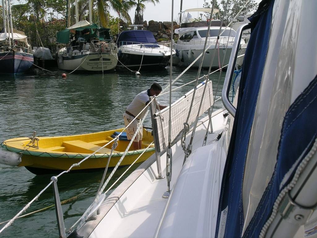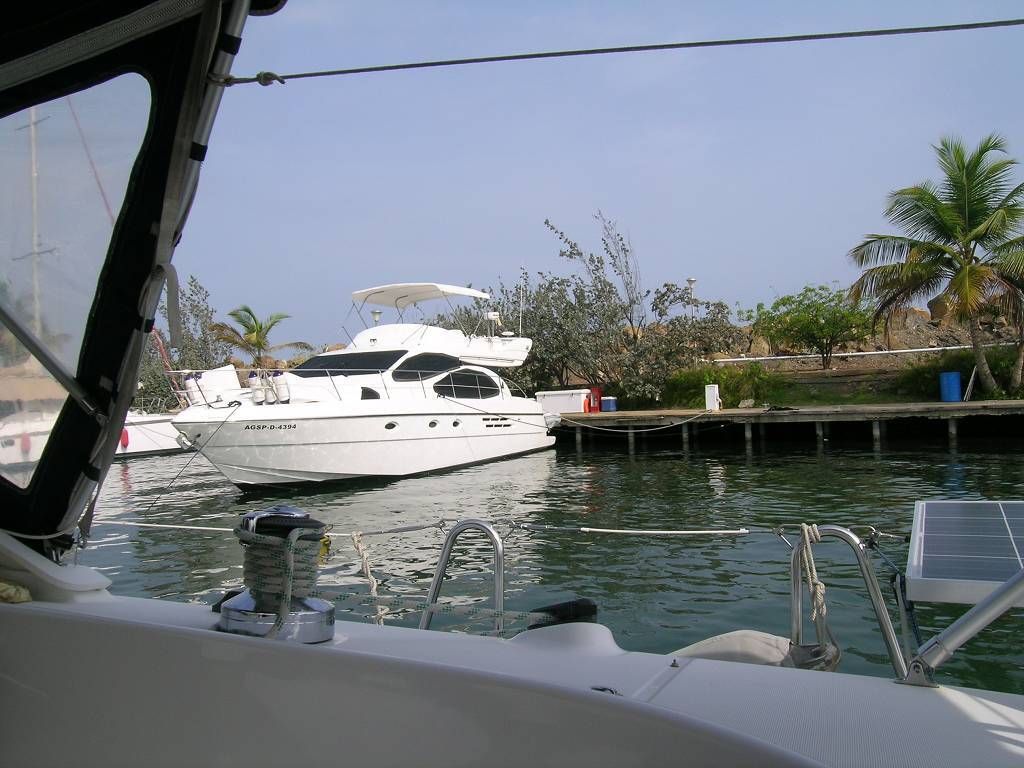 Um 11h geht Paul zu Milanos Geschäft. Schliesslich ist heute Samstag und bis Montag wollen wir nun wirklich nicht mehr hier warten. Paul kommt zurück und sagt, Milano komme in einer halben Stunde. Jetzt ist es 12h05, es ist noch KEIN MILANO da! Ich rufe wieder bei ihm an. Ja, er sei auf dem Weg zu uns! Und: wir können es kaum noch glauben, um 12h25 kommt Milano doch noch mit seiner Gehilfin um die Dinghy-Abdeckung zu montieren. Dabei fällt Milano die Brille vom Kopf ins Hafenwasser. Und das Tüpfelchen auf dem i ist, dass es gar nicht SEINE Brille war, sondern er hatte sie vom Nachbarn AUSGELIEHEN!, weil er sich auf seine EIGENE draufgesetzt hatte! Um 13h ist schon alles fertig. Die Gehilfin bittet uns, wie jedes Mal, um kaltes Wasser und Milano bekommt, wie jedes Mal, ein kühles Bier. Wir bezahlen ihm die Arbeit, ziehen ihm aber von den 700 Bolivar (ca. 117 SFr.) 100 Bolivar (ca. 17 SFr.) ab, weil wir ja jetzt noch einen Tag länger in der Marina bezahlen müssen. Entgegen unseren Befürchtungen ist Milano sofort damit einverstanden und schüttelt uns begeistert die Hände.