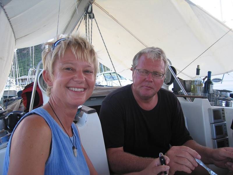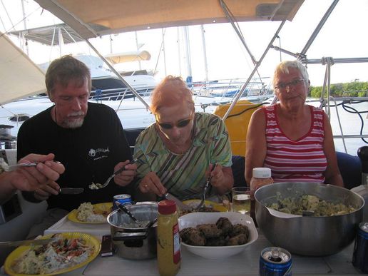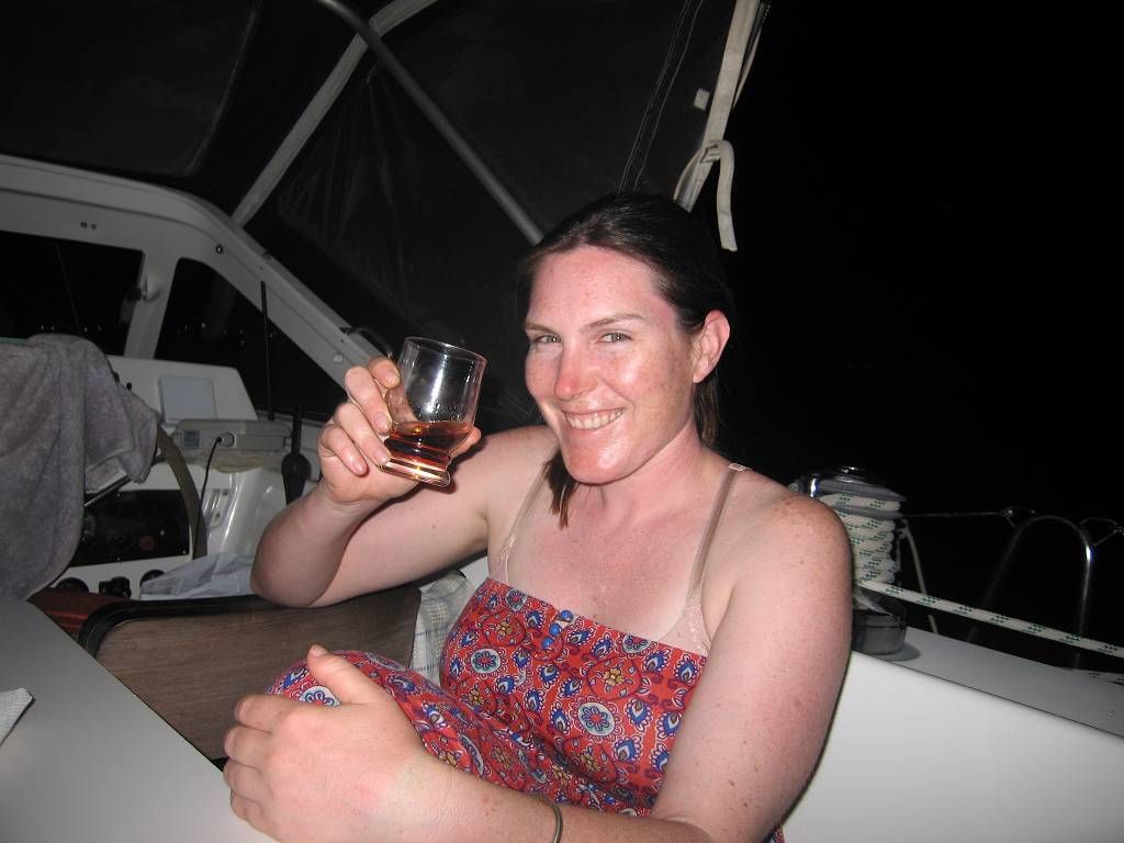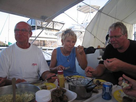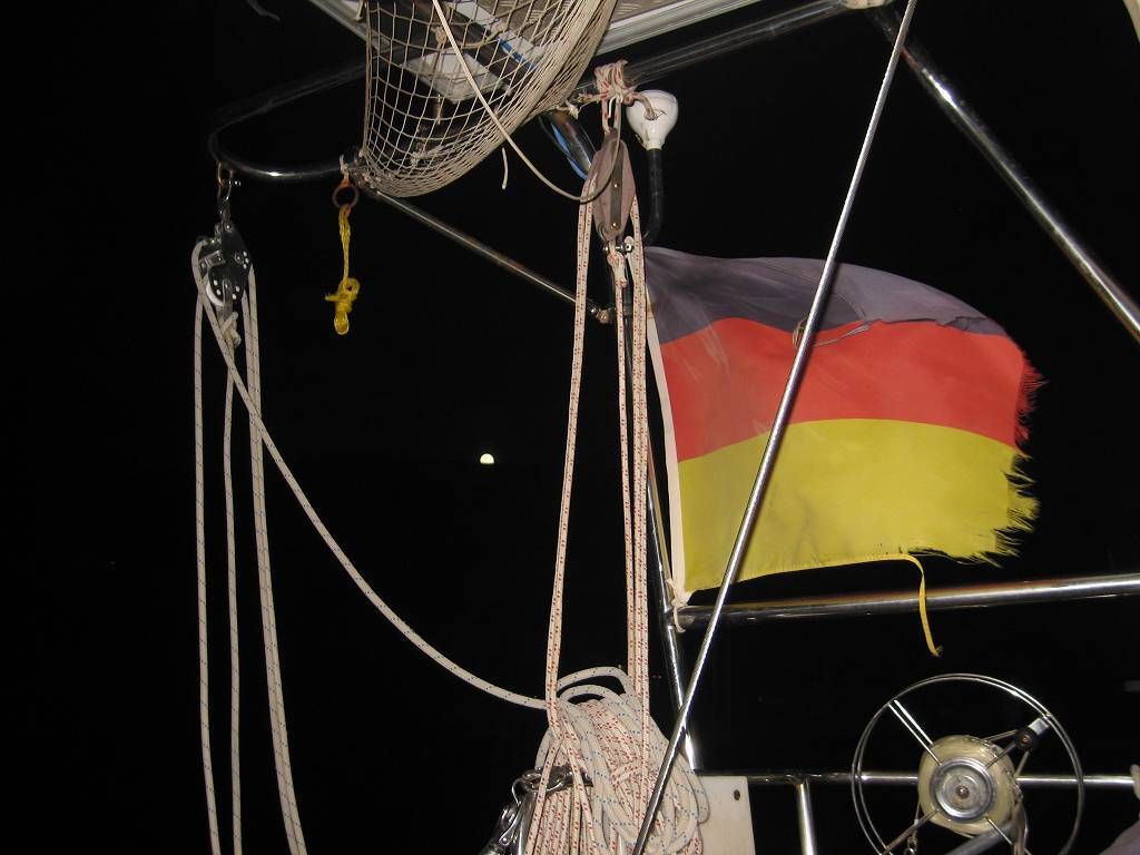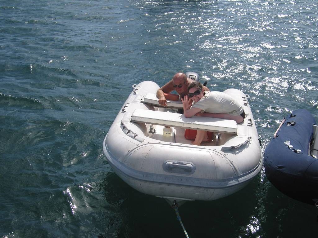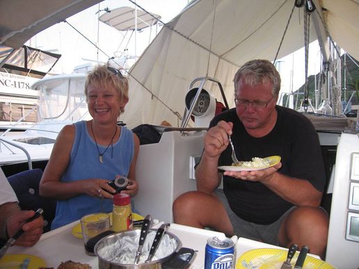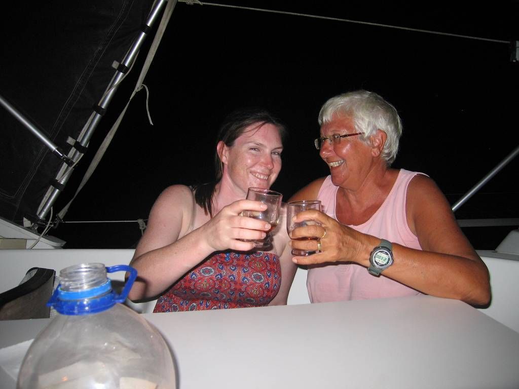 Nach kurzer Hin-und Herberatung heben Paul und Birgit den Benzintank so schräg an, dass wir mit dem letzten Restchen Benzin wieder zuück in die Marina, zu Udo's Schiff „Caroona“fahren können. Udo ist schon im Bett und Christa rät uns, doch einfach ihr Dinghy zu nehmen. Es gibt wieder ein grosses Palaver und dabei schmeissen wir noch den ganzen Papierkorb, der am Heck des Schiffes stand, mit vielen leeren Bierdosen, Petflaschen und Kartontellern ins Wasser. Wir sammeln so gut es geht alles wieder ein und beschliessen dann doch noch, Udo's Dinghy zu nehmen. Die Rückfahrt klappt dann, mit nur einem Stopp, auch gut. Der Schlauch mit der Benzinzufuhr war abgegangen. Birgitt lacht und lacht, dass sie fast aus dem Dinghy fällt!!! Gegen 22h45 sind wir alle gesund und munter zu unseren Schiffen rückgeführt. Mann, war das aufregend!