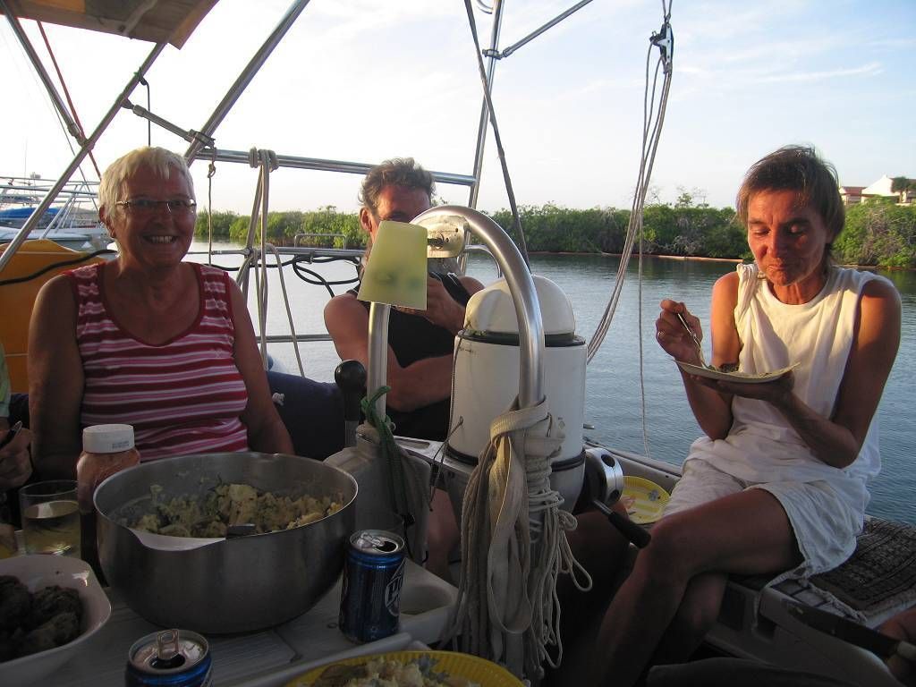Um 17h15 holt Rainer uns und Manfred ab und wir fahren per Dinghy in die Seru Boca Marina. Dort sind wir bei Christa und Udo zu Christa's 47. Geburtstag eingeladen. Wir sind neun Personen. Christa und Udo (D), Birgitt und Rainer (D), Manfred (D), Marlies und Manfred (A) aus Graz vom Schiff „Pangea“ und wir beiden. Es gibt Kartoffelsalat, Frikadellen, gemischten Salat und Tsatsikisauce. Alles von Udo selber zubereitet und sehr gut! Es geht sehr lustig zu und her. Kurz nach 22h machen wir uns langsam wieder auf den Heimweg. Bis wir endlich alle 5 in Rainer's Dinghy geklettert sind, dauert es ein Weilchen und gerade leise geht es auch nicht zu. Rainer chauffiert uns aus der Marina und nach kaum etwa 200 m bleibt der Motor einfach stehen. Wir meinen alle, Rainer mache einen Scherz mit uns, aber er sagt ganz trocken: „Wir haben kein Benzin mehr!!“ Und Paddel sind keine da!