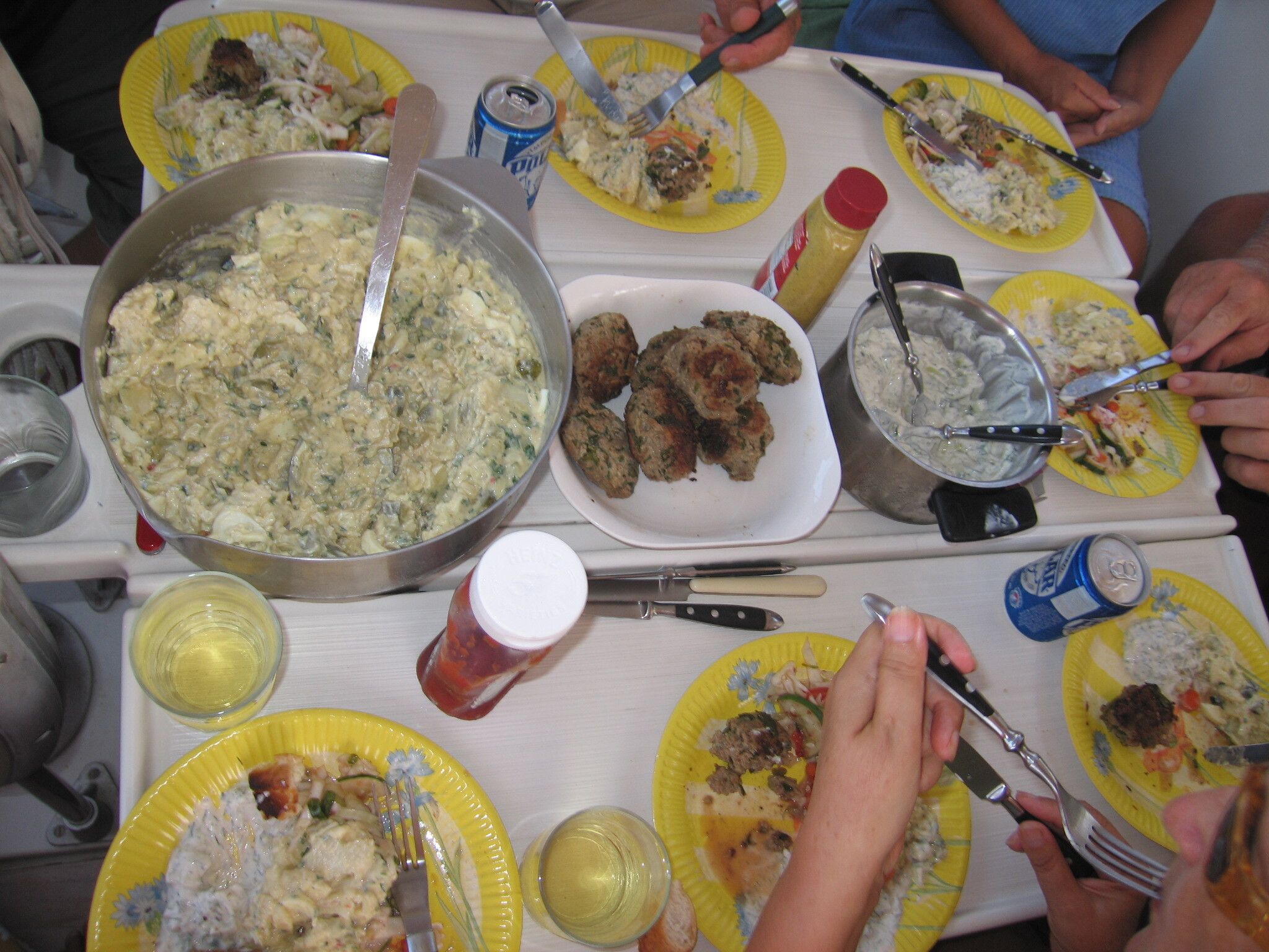 Auf jeden Fall ist die Pasta, mit selber gefangenem Thunfisch und Dorade, die Edoardo für uns kocht köstlich! Dazu Weisswein oder Bier und danach einen feinen Kaffee und Ruhm aus Panama. Mit dicken Bäuchen kehren Manfred und wir zurück auf unsere Schiffe.
