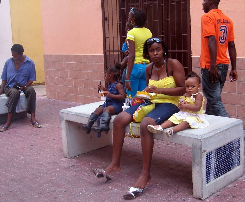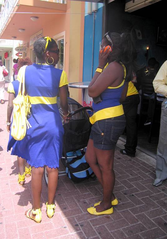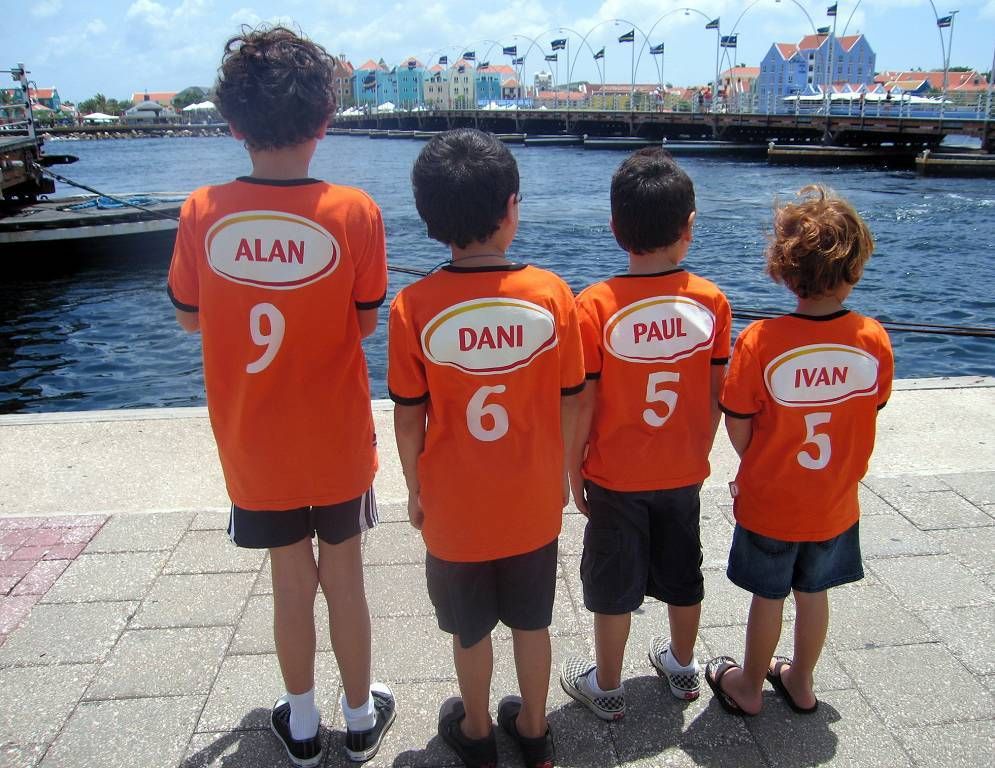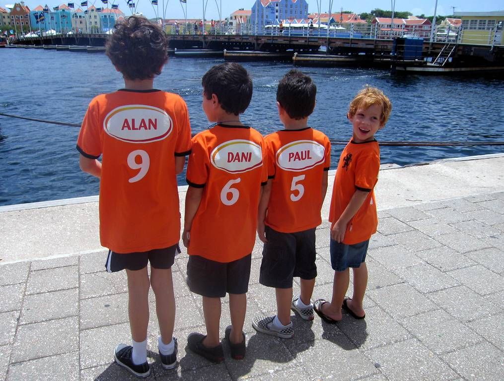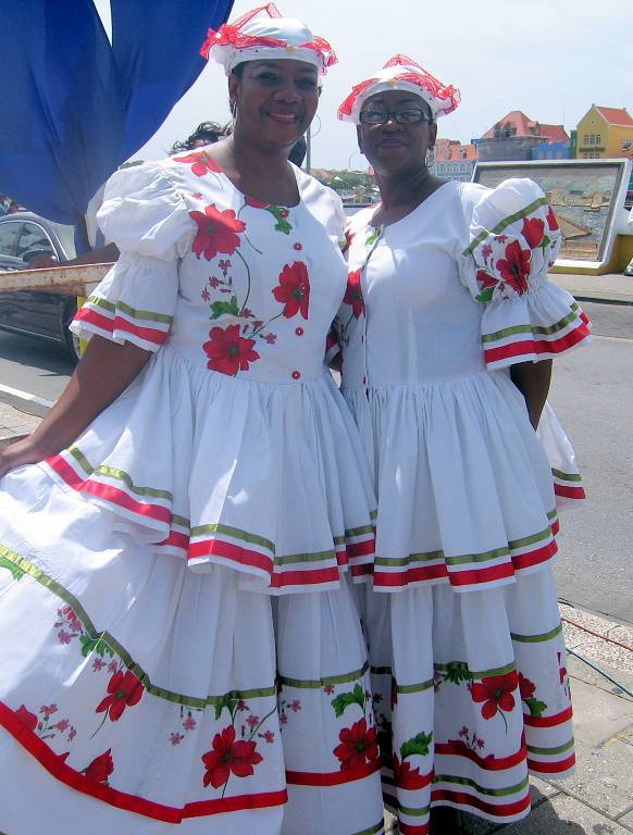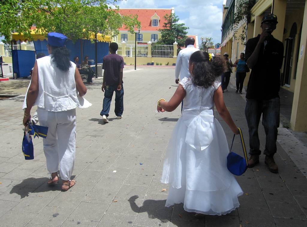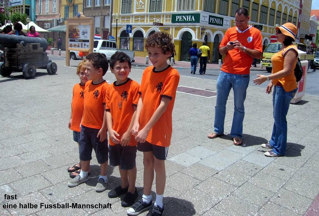Aber beim 2:1 für Holland bricht auf dem Platz Jubel aus. Wir essen an einem Stand jeder einen Hamburger und machen uns auf den Rückweg zur Busstation. Die Drehbrücke geht genau in dem Moment auf, als wir drauf sind. Wir beeilen uns und kommen noch rechtzeitig auf die andere Seite, und, erreichen mit einem Sprung noch die Punda-Seite. Um 13h15 sind wir bei der Busstation und warten auf den Bus von 13h30. Ein Buschauffeur sagt uns, weil Feiertag sei, fahre der Bus heute erst um 16h. Puhh, wir machen lange Gesichter! Aber dann gehen wir in ein surinamesisches Restaurant und trinken Wasser und Cola und Paul isst eine Glacé. Danach spazieren wir ein wenig herum und treffen zufällig auf eine andere Flagday-Veranstaltung. Ein ganzer Umzug mit lauter Schwarzen in traditionellen Kleidern formiert sich. Wir folgen dem Zug durch die Strassen, wobei wir fast die Einzigen sind. Aber es hat viele Polizisten (auch alles Schwarze) die sicherheitshalber (Wieso eigentlich???) rund um die Gruppe mitlaufen. Die Schwarzen tanzen den ganzen Weg und wir fühlen uns ziemlich in Afrika.