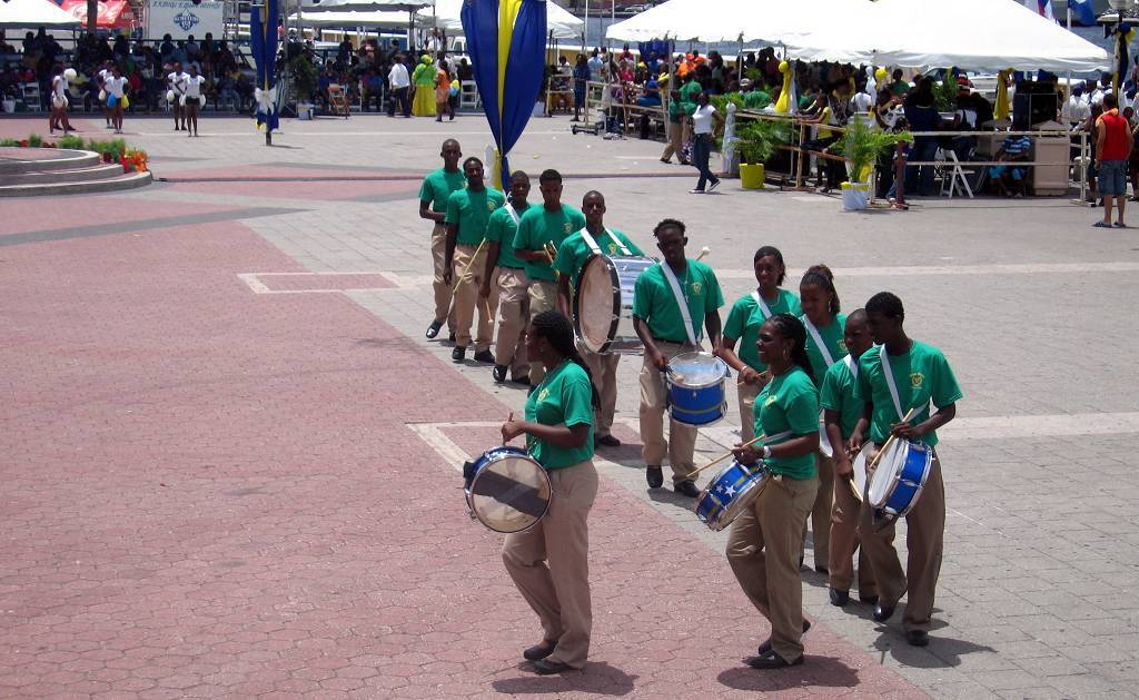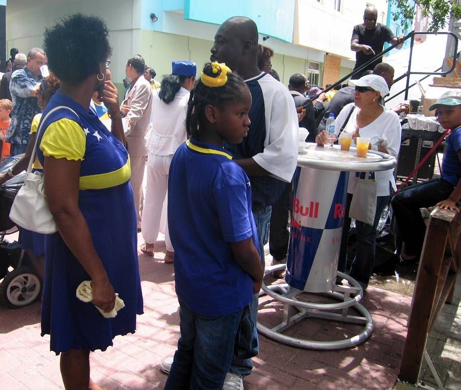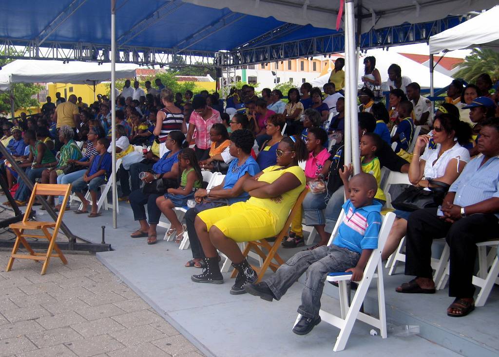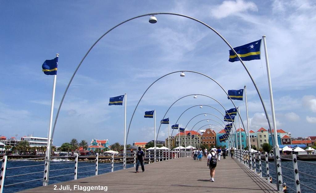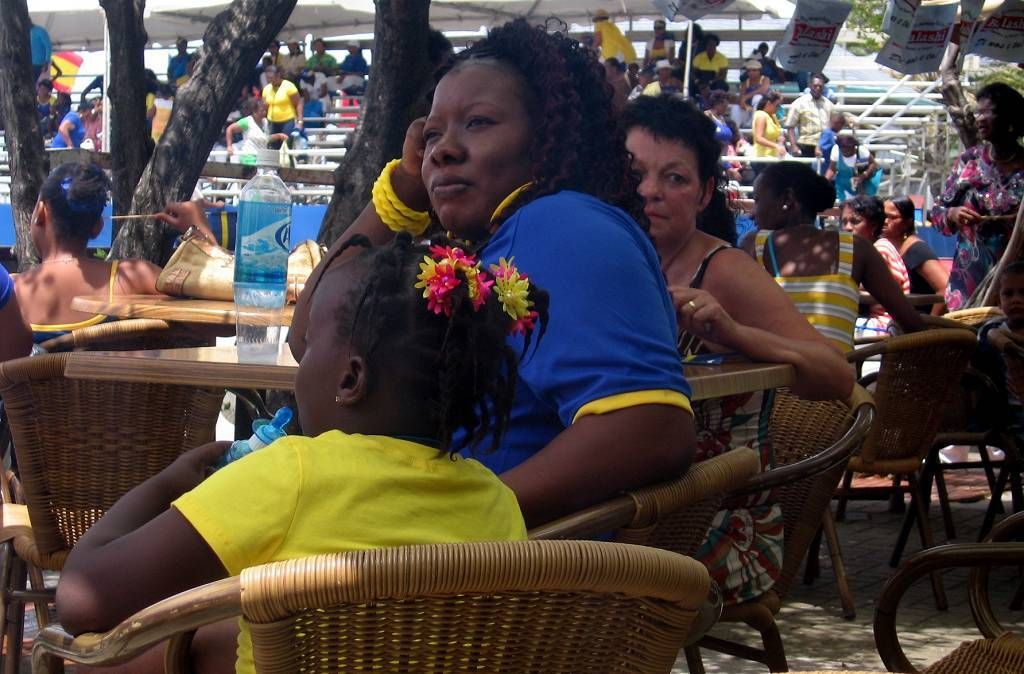 Heute feiert Curaçao den „Dia de la Bandera“, den Flaggentag. Seit 26 Jahren hat Curaçao eine eigene Flagge und das wird nun jedes Jahr am 2.Juli gefeiert. Wir erwischen um 10h15 einen Bus und fahren ins Zentrum nach Willemstad. Die Bus-Endstation ist wie ausgestorben. Wir laufen über die Königin-Emma-Brücke nach Otrobanda. Hier auf dem grossen Platz finden die Feierlichkeiten für das Fest statt. Die offiziellen Ansprachen sind (zum Glück) schon vorbei und wir hören und sehen „nur“ noch Sänger, Tänzer und Marschformationen (fast nur schwarze Mitwirkende). Die Zuschauer, auch mehrheitlich Schwarze, gehen unheimlich mit und es herrscht eine tolle Stimmung. Wir sitzen in einem Gartenrestaurant, direkt beim Festplatz und neben der Bühne, wo das Curaçao Orchester spielt. Daneben ist ein riesiger Fernseher aufgestellt und das WM-Fussballspiel Holland -Brasilien ist in vollem Gange. Den Ton kann man nicht hören, die Musik spielt viel zu laut.