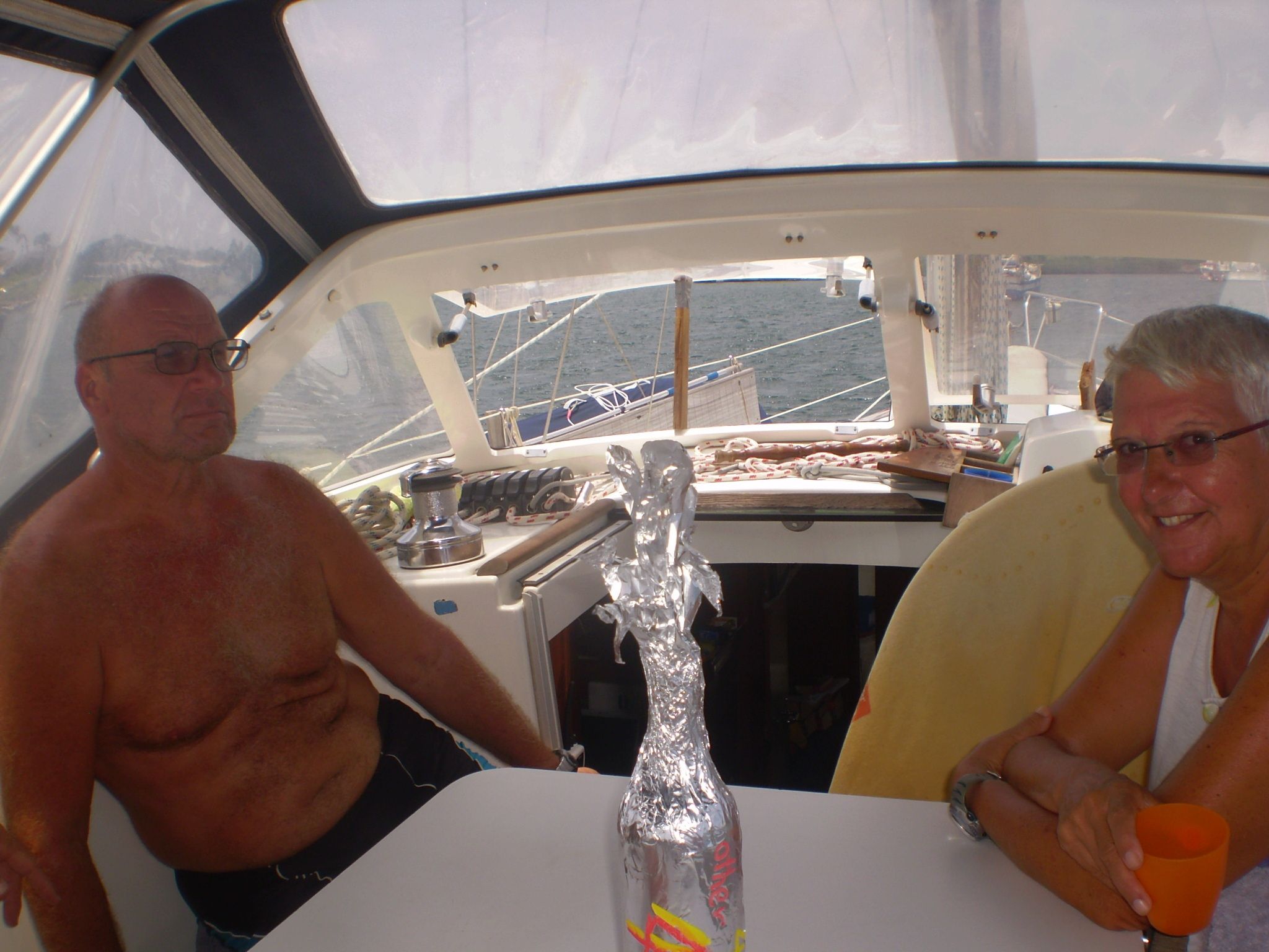 Gegen 12h kommen Michelle und Edoardo und bringen uns zum Hochzeitstag eine Flasche Rum, schön eingepackt in Alufolie und bunt beschriftet. Sie bleiben 1½ Stunden bei uns und verabschieden sich dann, um nach Venezuela zu segeln.