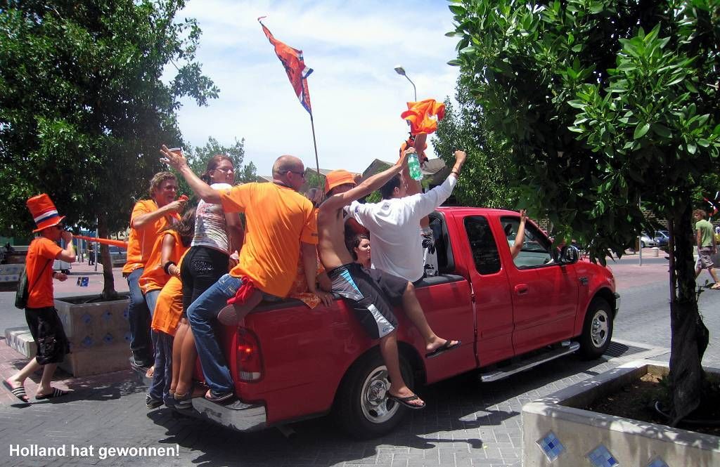 um den Fussball-Weltmeister zu zittern. Wir sind eigentlich neutral und wissen nicht, ob wir für Holland oder Spanien sind. Es hat enorm viele holländische Segler und auch einheimische Schwarze, in orangeroten T-Shirts und Perücken. Die Orangen machen einen Höllenlärm und sehen sich schon als Weltmeister. Als dann endlich, endlich das erlösende Tor für Spanien 1:0 fällt,, werden sie ganz kleinlaut! Norman hat zur Feier des Weltmeisters eine 2-Mann-Band angestellt und nun werden die Spanier gebührend gefeiert.