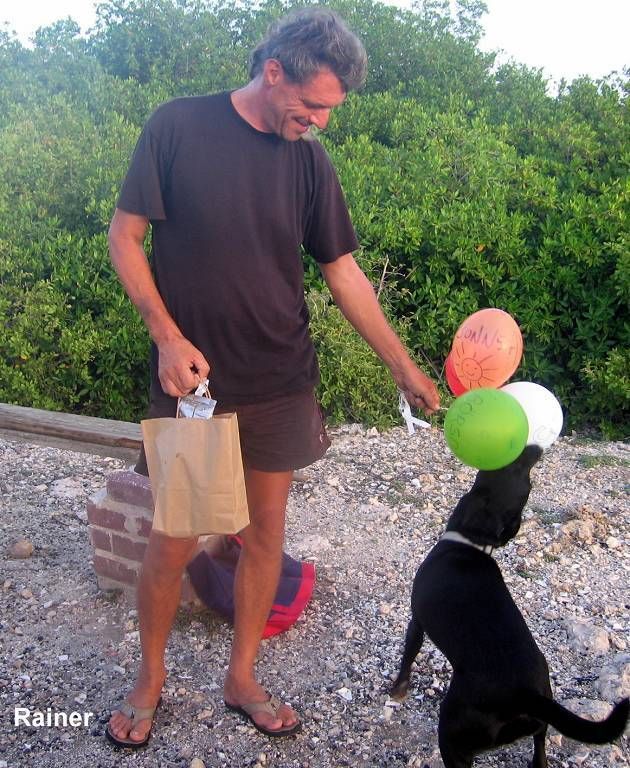Rainer von der ELSA feiert seinen 50. Geburtstag und wir sind zum gemütlichen Beisammensein auf der kleinen Insel eingeladen. Nach dem Fussballmatch gehen Rainer, Manfred und Paul mit Chica (Hund auf der ELSA) Holz suchen.