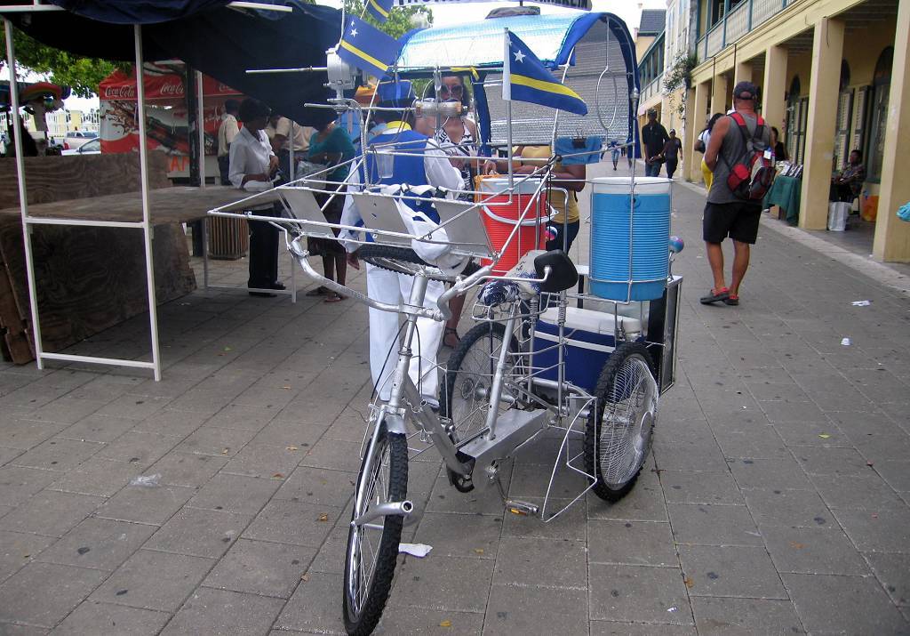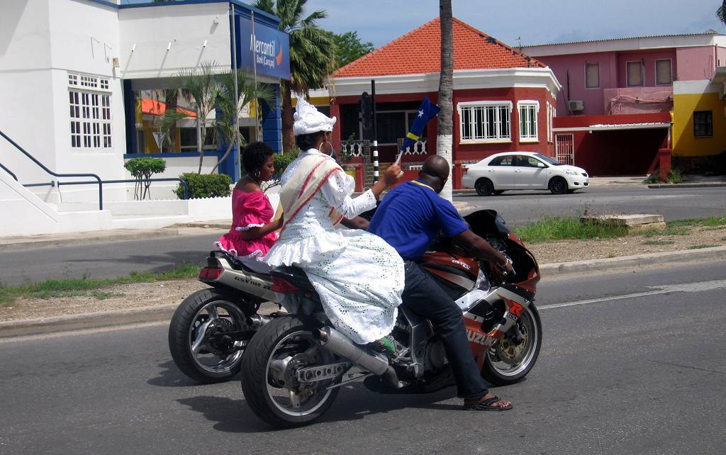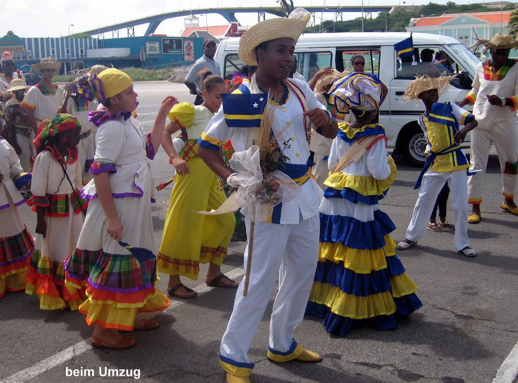 Aber beim 2:1 für Holland bricht auf dem Platz Jubel aus. Wir essen an einem Stand jeder einen Hamburger und machen uns auf den Rückweg zur Busstation. Die Drehbrücke geht genau in dem Moment auf, als wir drauf sind. Wir beeilen uns und kommen noch rechtzeitig auf die andere Seite, und, erreichen mit einem Sprung noch die Punda-Seite. Um 13h15 sind wir bei der Busstation und warten auf den Bus von 13h30. Ein Buschauffeur sagt uns, weil Feiertag sei, fahre der Bus heute erst um 16h. Puhh, wir machen lange Gesichter! Aber dann gehen wir in ein surinamesisches Restaurant und trinken Wasser und Cola und Paul isst eine Glacé. Danach spazieren wir ein wenig herum und treffen zufällig auf eine andere Flagday-Veranstaltung. Ein ganzer Umzug mit lauter Schwarzen in traditionellen Kleidern formiert sich. Wir folgen dem Zug durch die Strassen, wobei wir fast die Einzigen sind. Aber es hat viele Polizisten (auch alles Schwarze) die sicherheitshalber (Wieso eigentlich???) rund um die Gruppe mitlaufen. Die Schwarzen tanzen den ganzen Weg und wir fühlen uns ziemlich in Afrika.