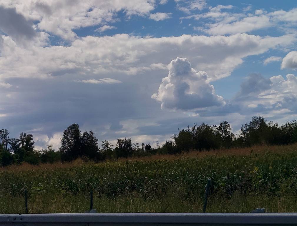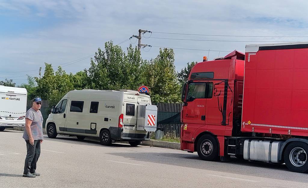 Um 09h fahren wir los, bei Regen, 15° und ohne Frühstück! Rund um Mailand verfahren wir uns elend und verlieren so bestimmt fast 2 Stunden. Die Stimmung im Camper ist ziemlich angespannt und der Fahrer am Zerreisspunkt! Nach 10h30 gibt es endlich bei einer Raststätte einen Kaffee und ein Gipfeli...! Uff! Gegen 11h haben wir endlich die "richtige" A4 nach Venedig gefunden. Wir schaffen das! Zusammen sind wir stark! Was für eine Zangengeburt!!! Wir hätten besser heute Morgen 2 Stunden länger geschlafen! Der Stimmungsbarometer steigt wieder an und es regnet nicht mehr....Das Wetter ist sehr launenhaft. Wir haben abwechselnd Sonne, Wolken, Regentropfen, Regenschauer, 20°. Bei Brescia machen wir unsere Mittagspause. Es gibt Gurken und Tomaten aus unserem Garten zu Hause. Jetzt scheint wieder die Sonne und es wird heiss mit 26°. Um 15h gibt es eine Kaffeepause, irgendwo bei Venedig, im Autobahn-Restaurant. Und jetzt ist es plötzlich so drückend heiss geworden, 28°, dass wir beide kurze Hosen anziehen müssen. Und kurze Zeit später regnet es schon wieder... Es ist 17h10, als wir in Gorizia ankommen. Wir stellen uns sofort auf den offiziellen Stellplatz und sind froh, angekommen zu sein. Besonders Paul ist ziemlich geschafft!