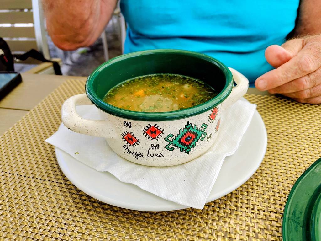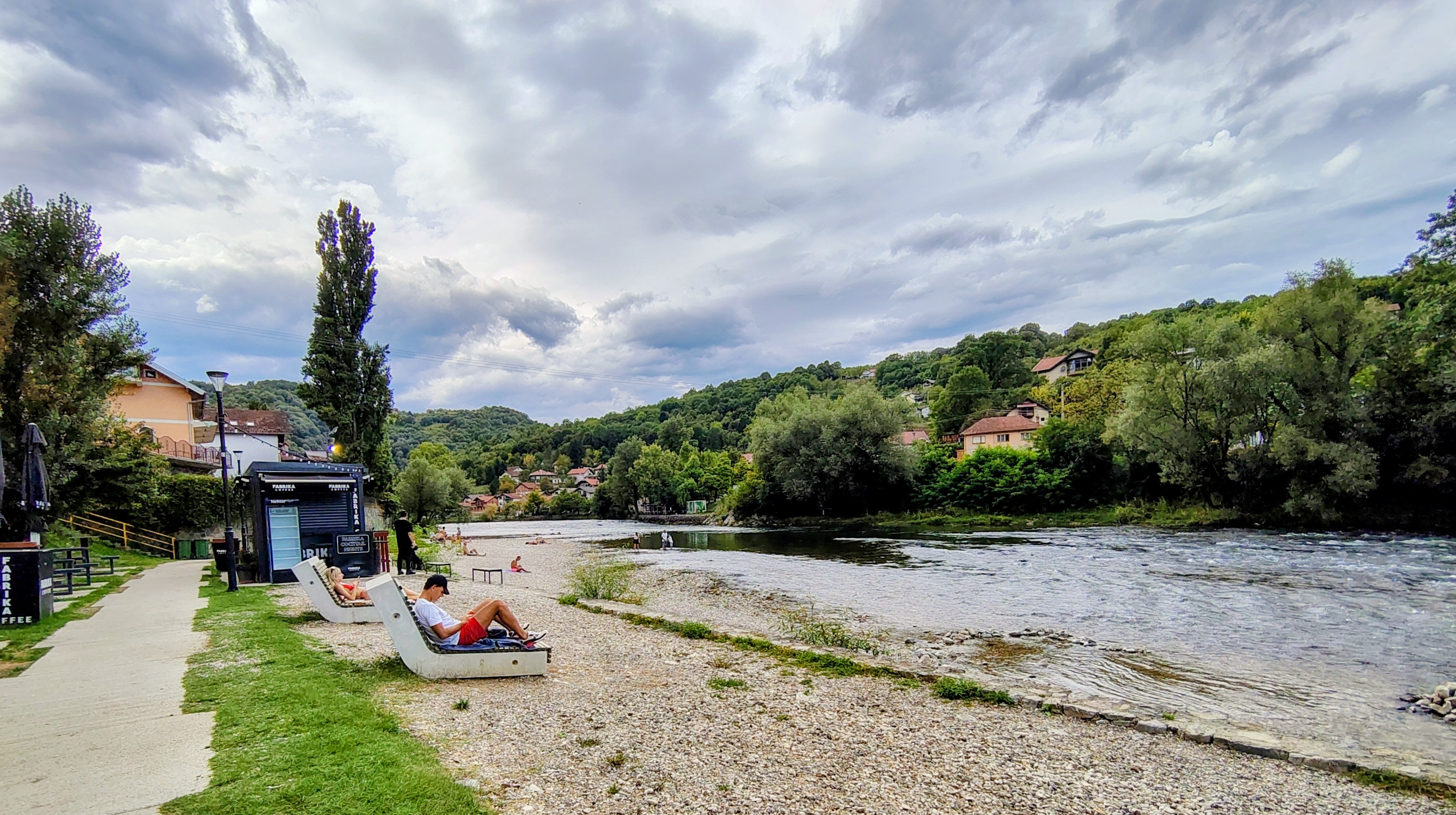 Um 9h30, nach dem Haushalten, fahren wir los. Um 8h00 war noch Nebel, aber jetzt, bei der Abfahrt scheint voll die Sonne bei 23°. Nun sind wir 1½ Tage in Bosnien und ich habe schon 3 Wörter bosnische gelernt: Hvala (Danke), Sobe (Zimmer) und Pivo (Bier). UVon 11h20 bis 14h20 sind wir in Banja Luka. Als erstes schauen wir uns die römische Festung an. Hier hat es auch ein Restaurant und wir essen direkt hier zu Mittag. Es dauert ewig bis das Essen kommt! Danach laufen wir zur wunderschönen serbisch-orthodoxen Christ-Erlöser- Kathedrale. Gleich daneben befindet sich das Rathaus der Stadt. Irgendwo müssen wir noch einen Espresso trinken und dem treiben auf den Strassen zuschauen uns dann kehren wir zum BONSAI zurück. Wir fahren 4km weiter zu unserem heutigen Schlafplatz, am Fluss "Vrbas". Und weil es so heiss ist, wollen wir sofort im Fluss baden. Leider schaffen wir nur bis zu den Waden ins Wasser, weil die Steine im Fluss so glitschig sind. Ausserdem nehmen die dunkeln Wolken immer mehr zu und wir kehren zum Bus zurück. Aber es ist immer noch sehr warm, wir erwarten heute noch Regen. Aber es gibt keinen richtigen Regen, nur leichtes Geniesel.