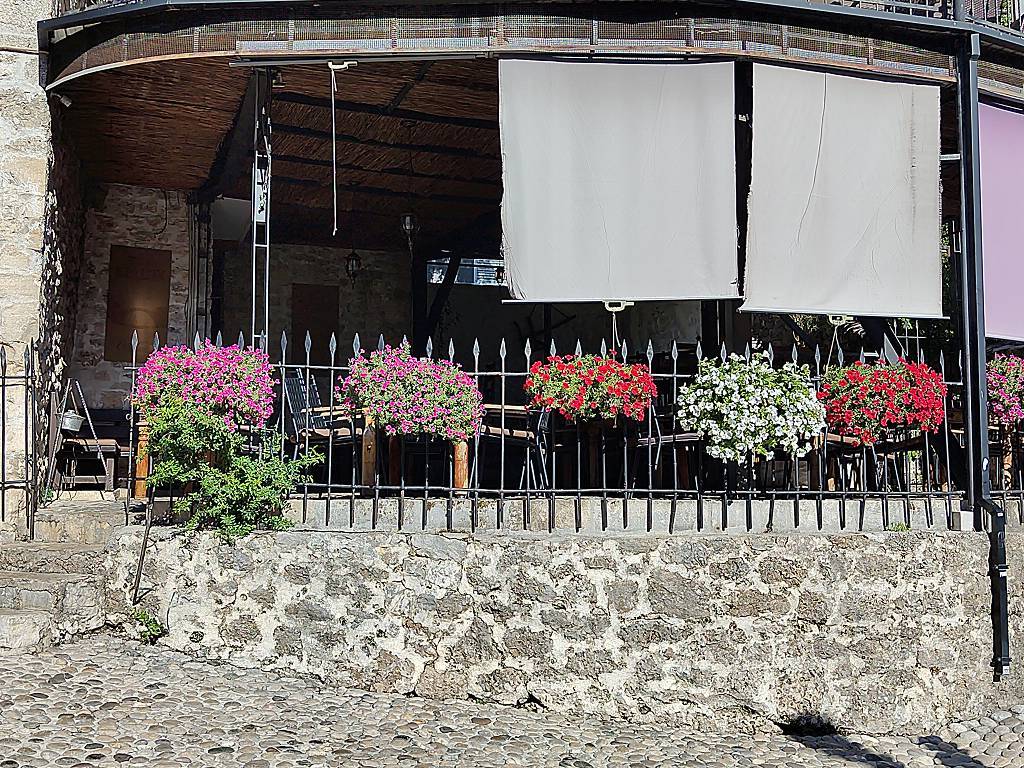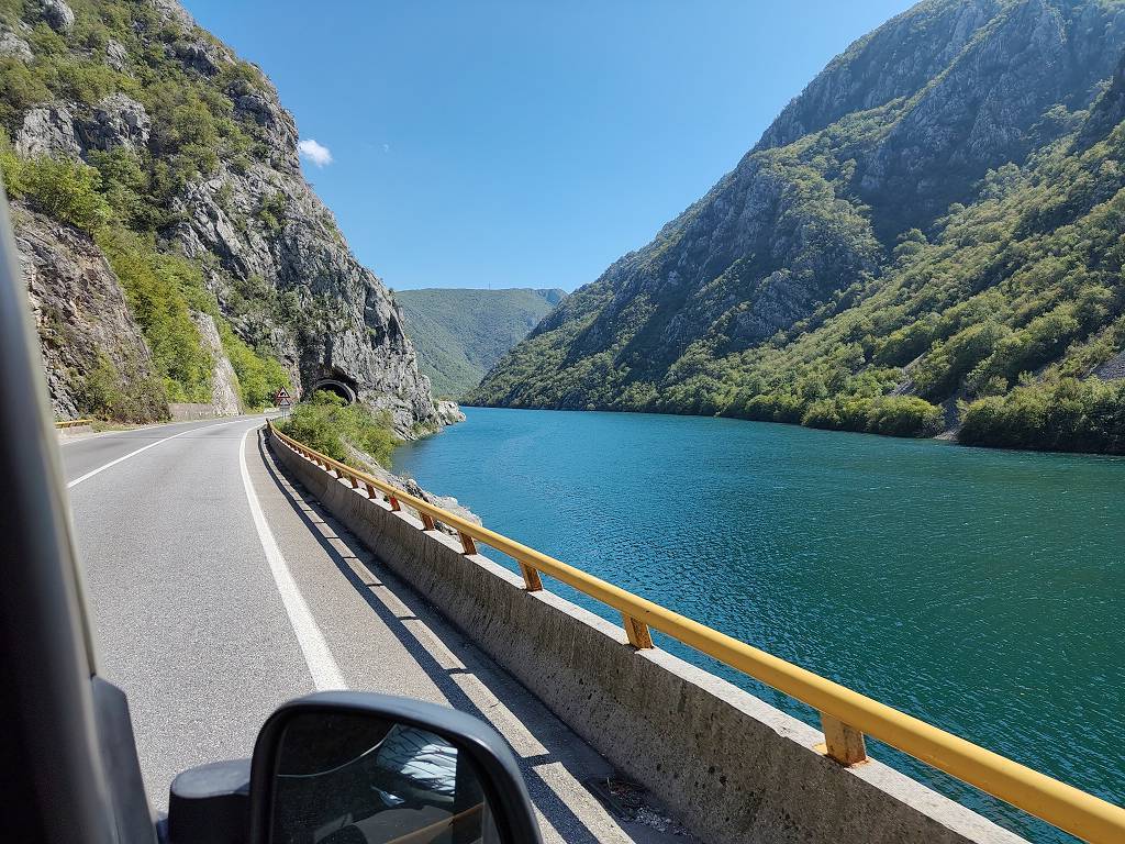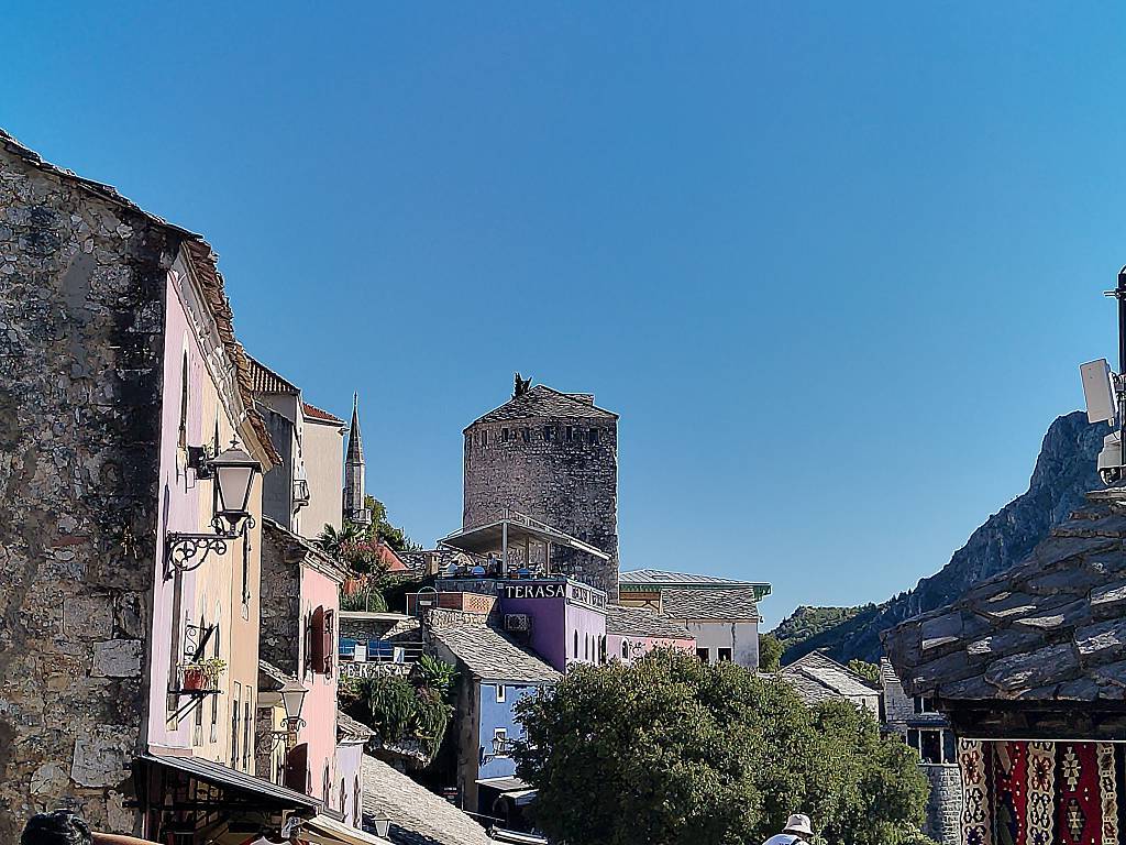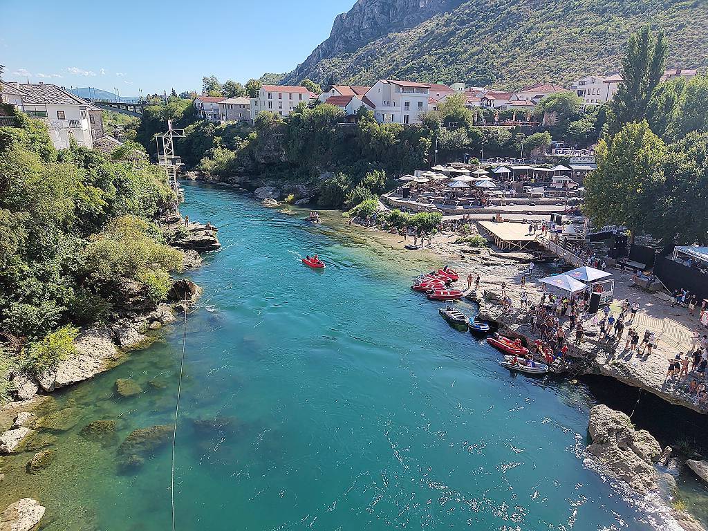 Und nach dem Mittag scheint wieder die Sonne und es wird bis 30° heiss. Um 14h30 sind wir in Mostar, nachdem es auch hier sehr schwierig war einen Übernachtungsplatz zu finden. Alle Parkplätze sind überfüllt, aber wir finden beim Friedhof ein Plätzchen, wo wir die Nacht verbringen werden. Wir machen uns sofort auf die Socken um Mostar zu besuchen. Wir laufen natürlich als erstes zu der berühmten alten Brücke, die während des Bosnienkrieges zerstört wurde. Es hat enorm viele Leute auf der Brücke. Wir sehen wie etwa 10 Mutige (Frauen und Männer) gleichzeitig von der Brücke in den Fluss Neretva hinunterspringen. Danach spzieren wir herum, kehren zweimal ein um etwas zu trinken (das muss ja sein bei dieser Hitze, oder?) und kehren zum BONSAI zurück, wo Paul für uns das Abendessen kocht.