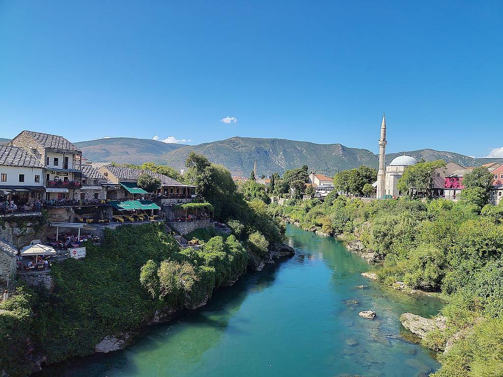 Mostar liegt im Süden des Landes an der Neretva in einem Kessel zwischen den Bergmassiven Velež (1968 m) und Čabulja (1776 m) auf einer Höhe von lediglich 60 m über dem Meeresspiegel.