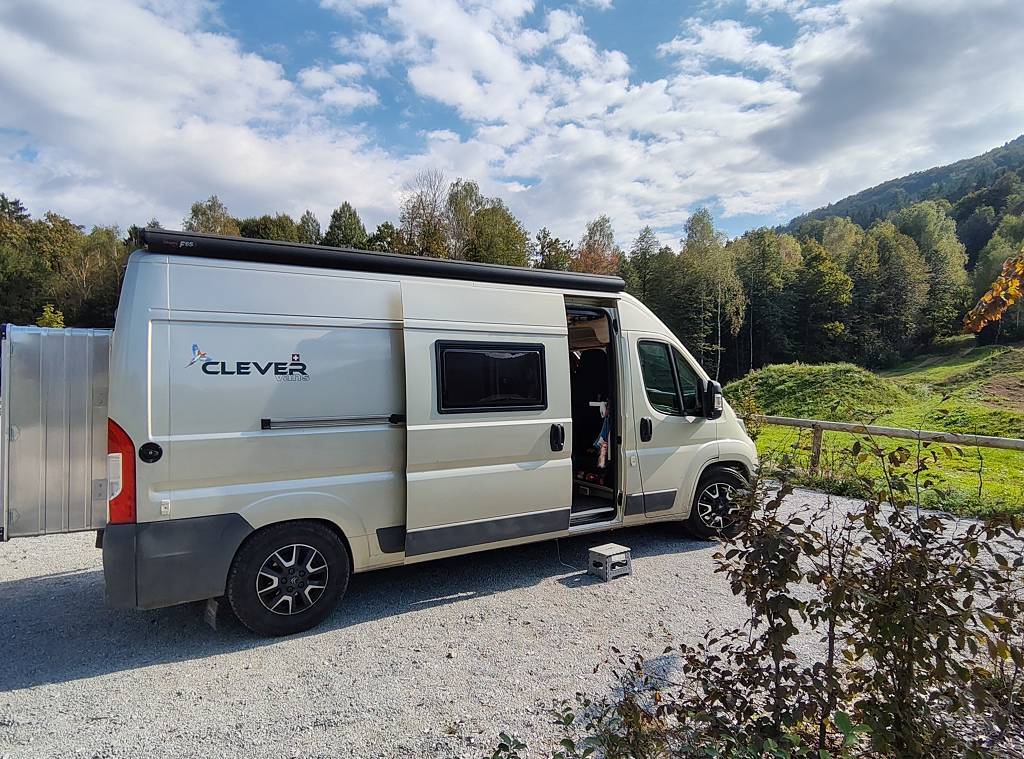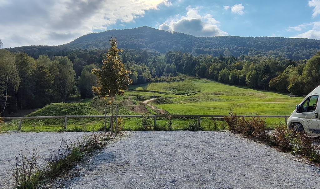 Unterwegs haben unsere beiden Schutzengel sehr gut auf uns aufgepasst. In einem Tunnel steht plötzlich ein Kastenwagen ohne Warnblinker auf unserer rechten Spur. Paul möchte nach links ausweichen, kann aber nicht, weil ein PW schon am überholen ist. Paul tritt sofort auf die Bremse und Dank seiner super Reaktion verhindert er einen Megaunfall. Au, das war absolut knapp!!! Um 13h20 sind wir in Slovenien. An der Grenze Kroatien / Slovenien ist kein Mensch da, der sich für uns interessiert. An einem schönen See, dem Kočevjsko Jezero (Jezero heisst See), möchten wir auf dem Camping Jezero übernachten. Die wollen aber 45.00 € /Nacht! Wir lehnen dankend ab, weil wir den Platz nicht kaufen möchten! Der sehr freundliche Mann an der Rezeption empfiehlt uns das MTB Center Kočevje, da sei es günstiger. Wir fahren ca. 10km zurück und bleiben um 14h30 auf dem Stellplatz beim MTB Center für die Nacht. Hier kostet die Übernachtung 10€. Allerdings hat es hier keinen so schönen See. Aber dafür hat es eine Mountain Bike Piste und wir haben einen guten Blick darauf, wenn die Freaks den Berg heruntergekurvt kommen.