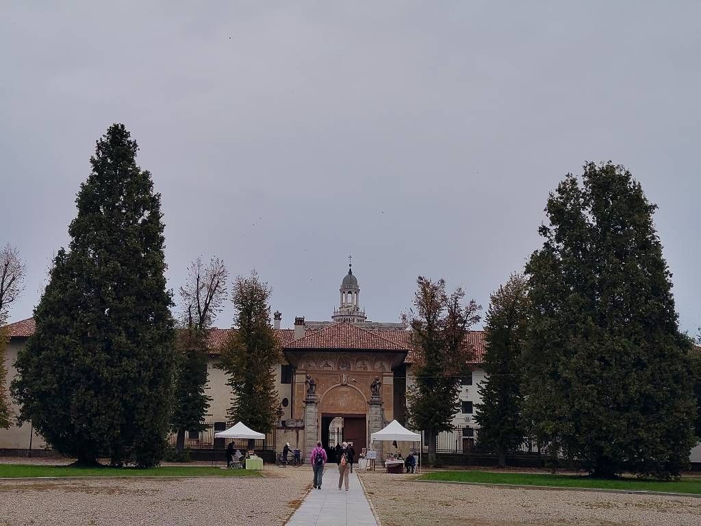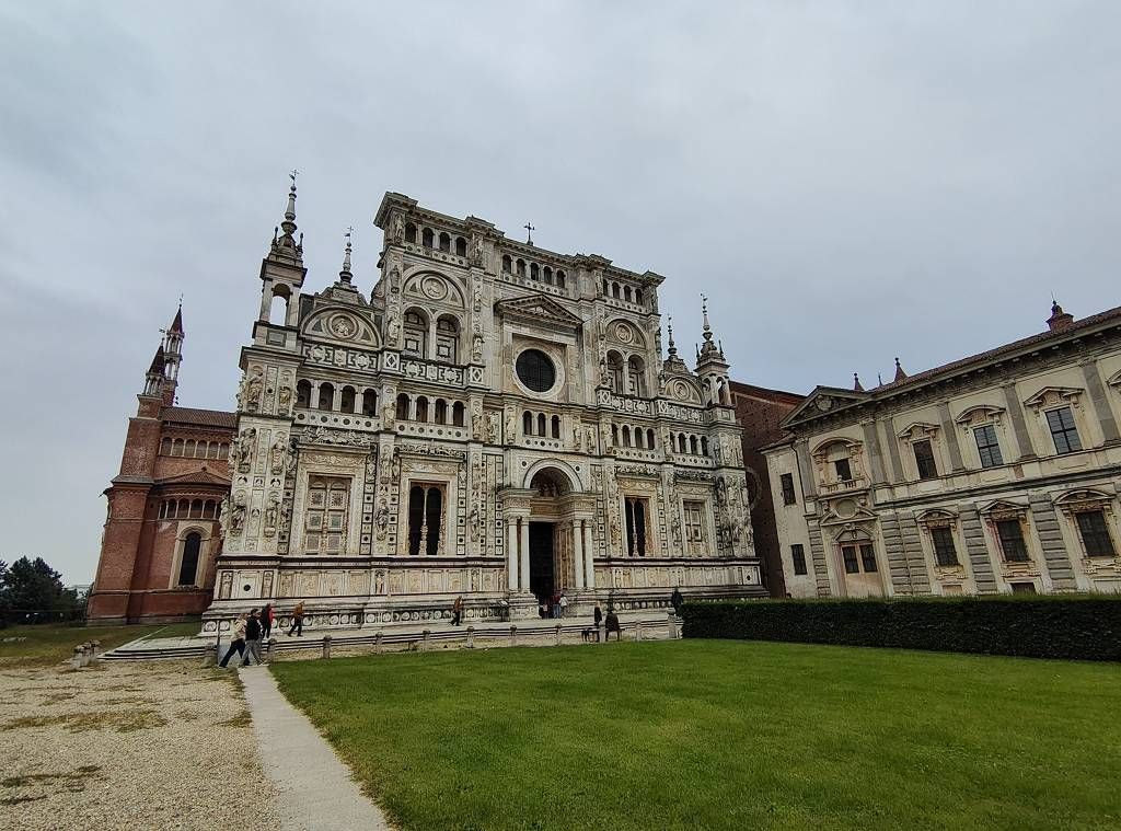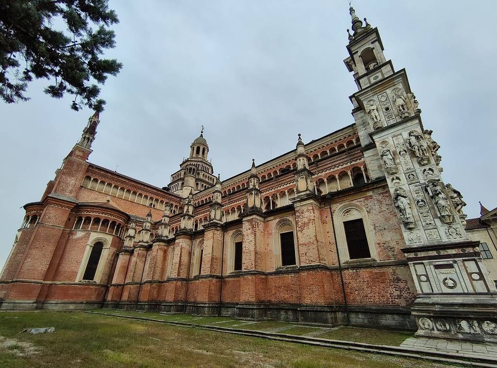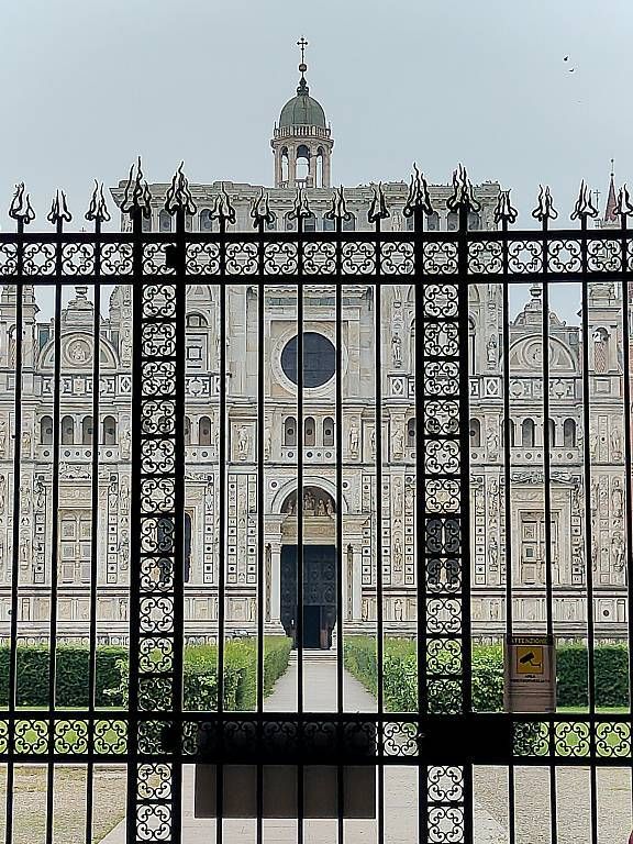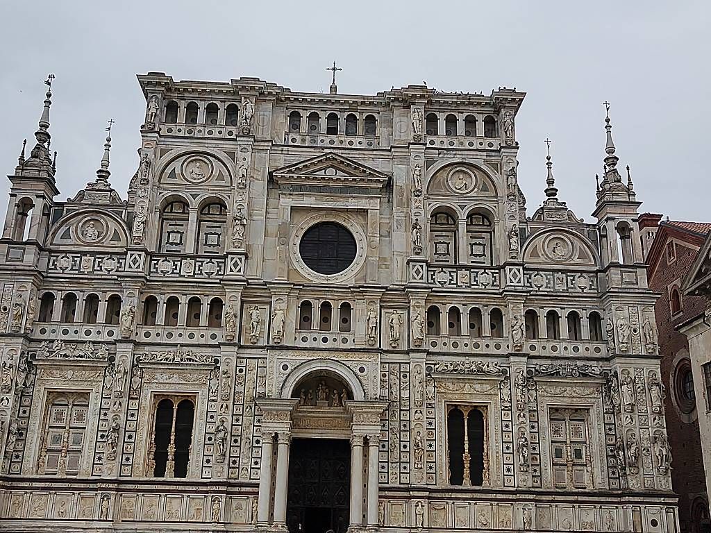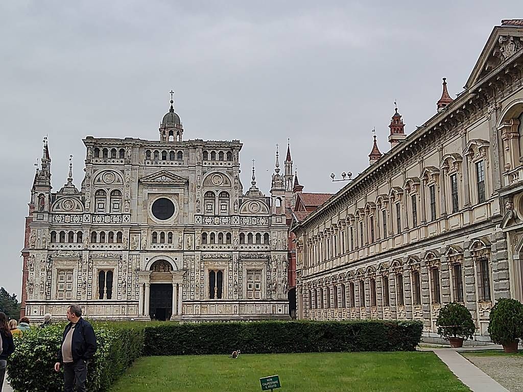 Wir lassen es heute sehr langsam angehen und fahren erst um 10h45 weiter. Es ist mehrheitlich bewölkt und 16°. Mir geht es heute wieder sehr viel besser. Keine Ahnung, was ich egstern für eien Störung hatte. Um 14h20 sind wir bereits in Pavia, auf dme Stellplatz, den Paul für uns vorgesehen hat. Es ist grauslich grau, kalt und unfreundlich, aber (noch) ohne Regen. Nach dem späten Mittagessen machen wir uns zu Fuss auf den etwa 600m weiten Weg zur «Certosa di Pavia». Das ist ein Kloster, das wir vom Stellplatz aus sehen können. Wir wussten nicht, dass es dieses Kloster gibt, sind also zufällig hier gelandet.