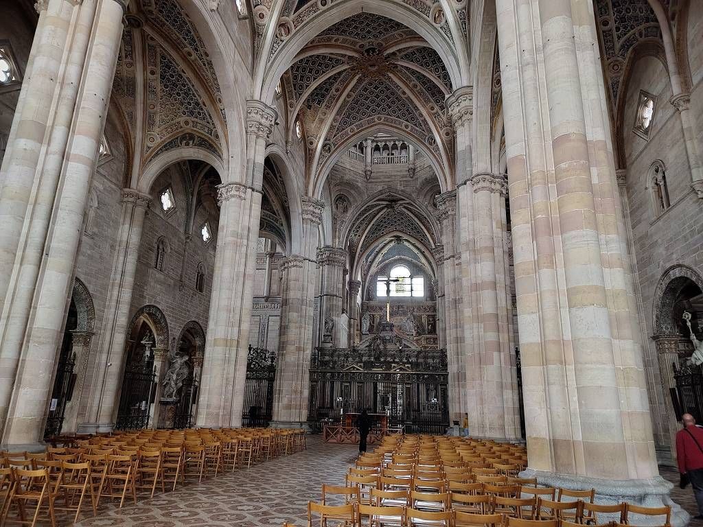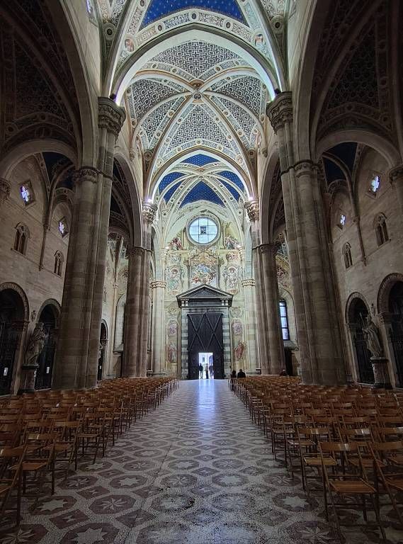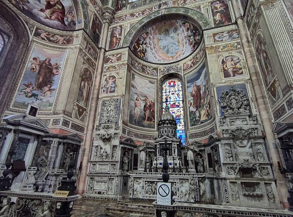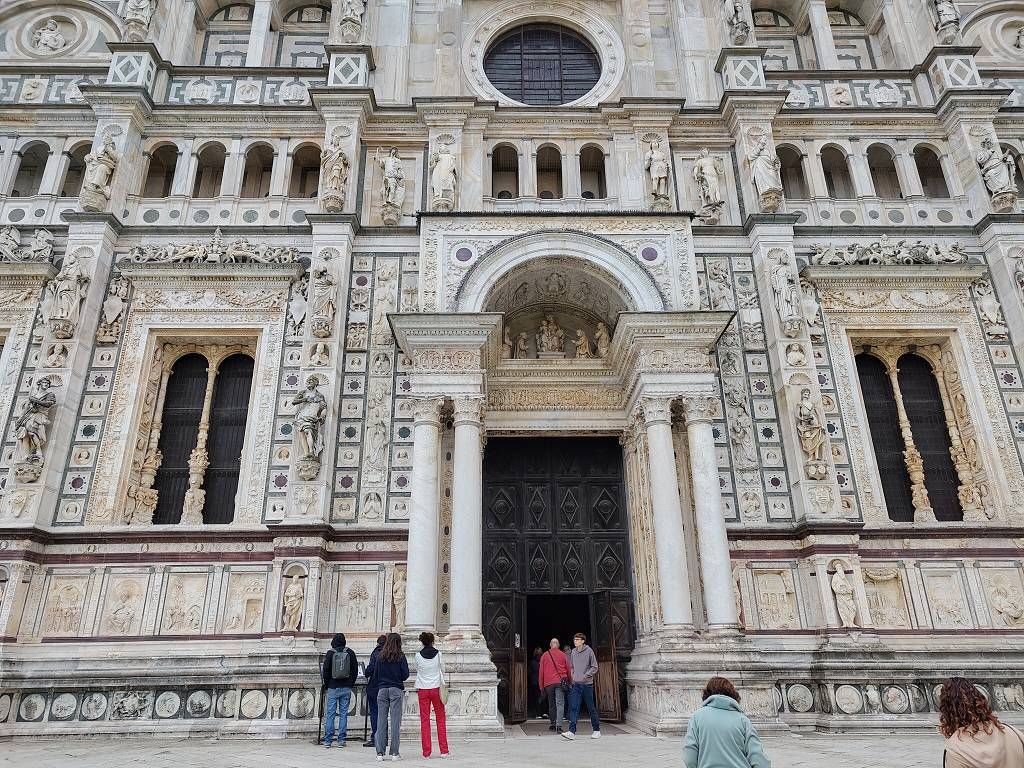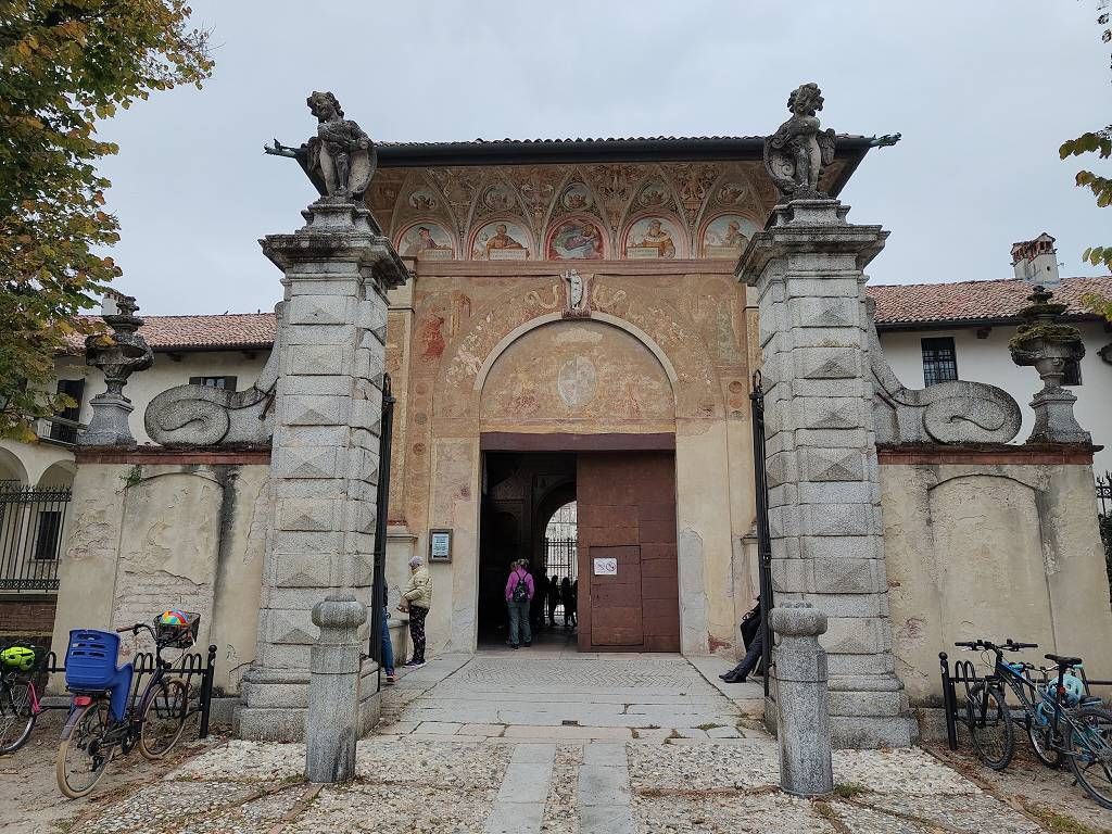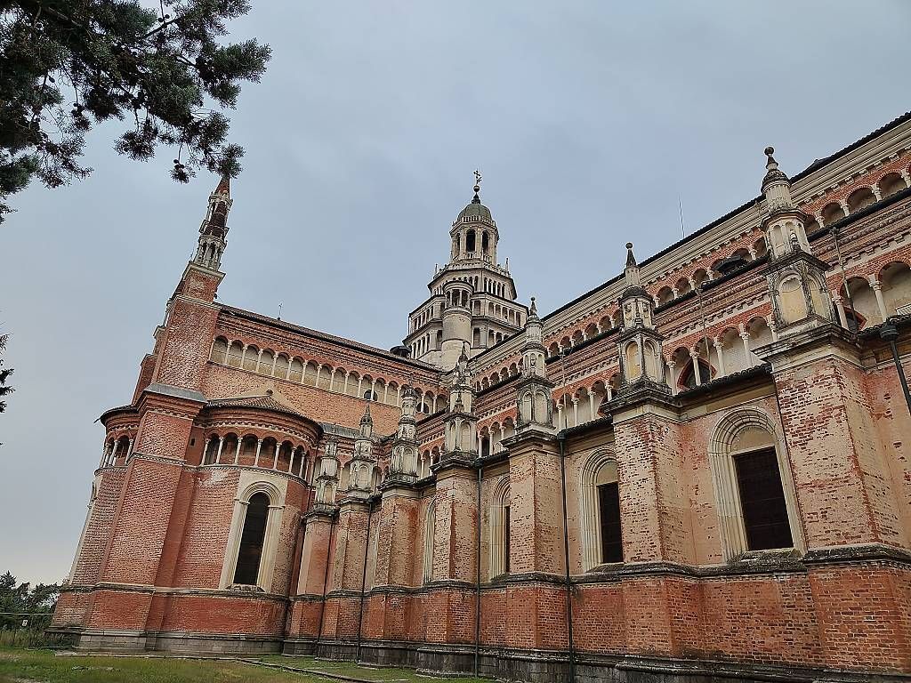 Wir lassen es heute sehr langsam angehen und fahren erst um 10h45 weiter. Es ist mehrheitlich bewölkt und 16°. Mir geht es heute wieder sehr viel besser. Keine Ahnung, was ich egstern für eien Störung hatte. Um 14h20 sind wir bereits in Pavia, auf dme Stellplatz, den Paul für uns vorgesehen hat. Es ist grauslich grau, kalt und unfreundlich, aber (noch) ohne Regen. Nach dem späten Mittagessen machen wir uns zu Fuss auf den etwa 600m weiten Weg zur «Certosa di Pavia». Das ist ein Kloster, das wir vom Stellplatz aus sehen können. Wir wussten nicht, dass es dieses Kloster gibt, sind also zufällig hier gelandet.