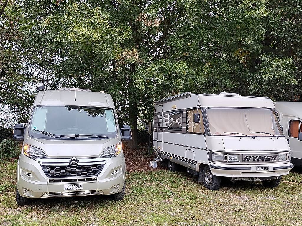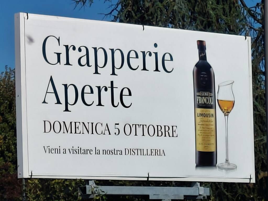 Wir erwachen mit wunderbarem Sonnenschein und 18°. Wir stehen unter einem Eichenbaum und in der Nacht fallen 4 oder 5 Mal Eicheln auf das BONSAI-Dach! Um 10h fahren wir los. Heute fahren wir nur auf Nebenstrassen. Und so schön die Landschaft auch ist, die Strassen sind eine einzige Katastrophe. Es ist 12h30 als wir in Ghemme ankommen. Hier waren wir schon mal und haben auch hier übernachtet. Damals hat es aus allen Rohren geschüttet. Aber heute ist das Wetter herrlich und der Himmel blau. Im Grappaladen Francoli kaufen wir ein und weil heute der Tag der offenen Tür ist, finden Führungen durch den Grappabetrieb statt. Wir machen die Führung von 14h mit. Während 1½ Stunden erklärt uns einer der Junioren der Firma den ganzen Betrieb auf Italienisch, was sehr interessant ist. Für Paul ist es eher langweilig, aber ich übersetze ihm das Wichtigste. Nach dem Degustieren der Grappas verlassen wir die Firma Francoli und fahren zu unserem heutigen Schlafplatz beim Fussballplatz von Ghemme.
