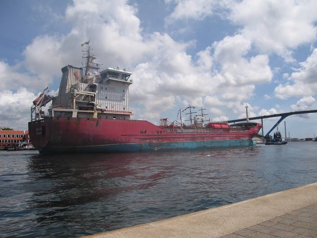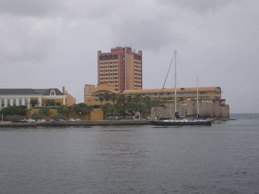 Mit dem 9h-Bus fahren Anne, Werner, Wolfgang und ich, als Guide, in die Stadt zum einklarieren. Paul wird um 9h von Rainer abgeholt und die beiden fahren per Dinghy in die Seru Boca Marina. Sie werden Houward, dem Amerikaner aus Utah helfen, sein 70-Fuss-Bötchen (ca. 21m lang), die „Ladyhawk“, in die Curaçao Marina in Willemstadt zu verlegen. Dort wird es aus dem Wasser genommen, und es werden diverse Arbeiten erledigt. Bei der Verlegung sind Houward, Christa, Peter der Maschinist, der Österreicher Manfred, Rainer und Paul dabei. Ich habe das Funkgerät im Rucksack und Paul teilt mir mit, dass sie ca. um 11h15 die Königin-Emma-Drehbrücke passieren werden. Das klappt auch, aber wir vier Einklarierer sind leider auf der „falschen“ Brückenseite, d.h. ,in Otrobanda, anstatt in Punda, um ihnen zuzujubeln und ein paar schöne Fotos zu machen. Wir können nicht rechtzeitig rüber, weil die Brücke schon offen ist. Aber wir sehen sie dennoch und ich versuche Fotos zu schiessen.