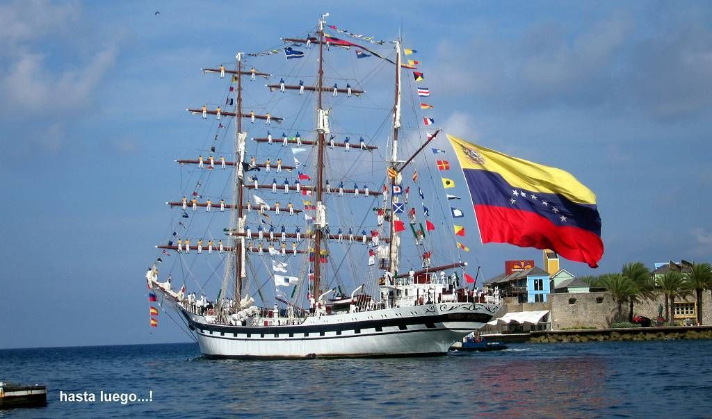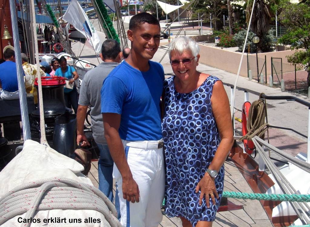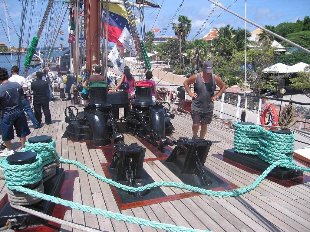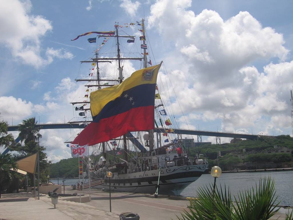 Bei der täglichen (ausser Sonntags) Funkrunde morgens um 7h45, haben wir gehört, dass ein Dreimaster in Willemstadt angelegt hat. Den wollen wir uns heute ansehen. Kurz nach 10h sitzen wir im Bus in die Stadt. Gegen 11h kommen wir bei dem Dreimaster an. Es ist ein Rahsegler aus Venezuela, das Schulschiff „Simón Bolivar“. Man darf das schöne Schiff besichtigen und ein freundlicher junger Kadette, Carlos, zeigt und erklärt uns das Schiff. Es wurde in Spanien gebaut und kam am 24.Juli (Geburtstag von Simón Bolivar) 1979 erstmals ins Wasser. Die Ausbildung der Marinesoldaten dauert vier Jahre und im Moment sind 77 Kadetten an Bord dazu ungefähr 100 Personen an Vorgesetzten und Ausbildnern. Am Heck des Schiffes hängt eine wahnsinnsgrosse venezuelanische Flagge. Wir schätzen, dass wir daraus 3 !!! Segel für unsere MABUHAY schneidern könnten!!! Ausserdem hängen auf Deck so Parolen wie: Lieber TOT als KEIN sozialistisches Vaterland!