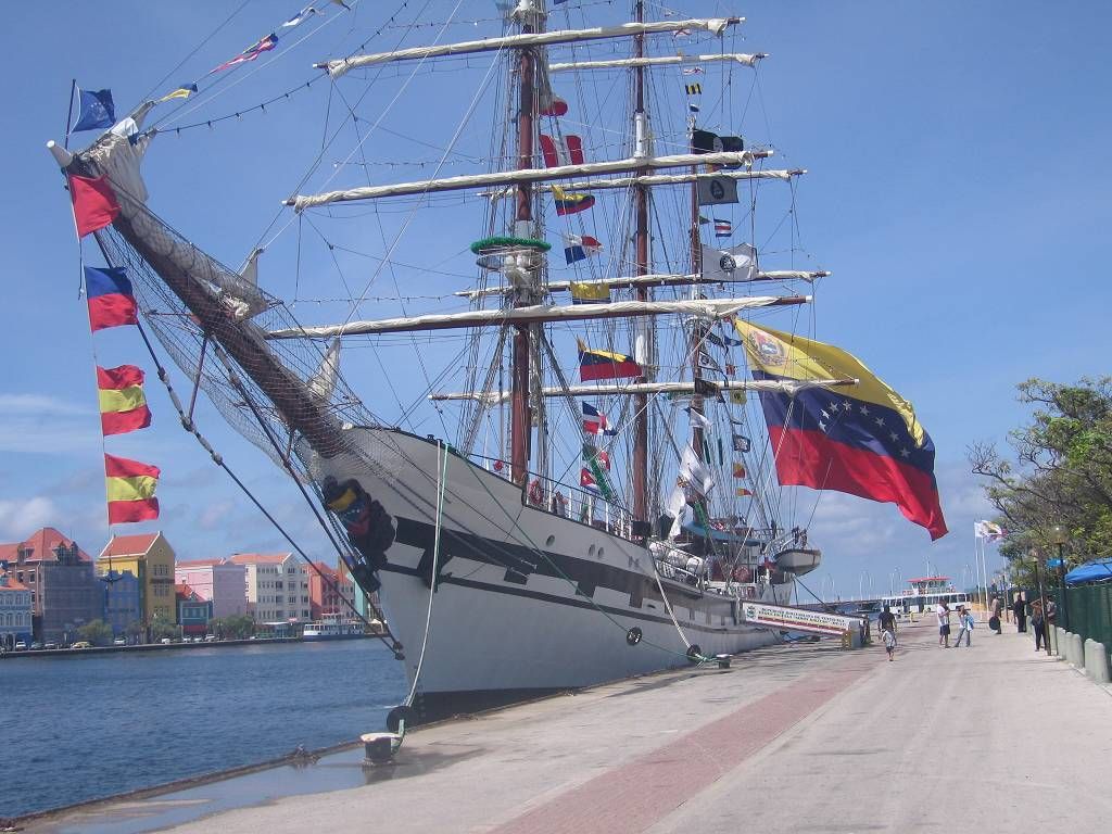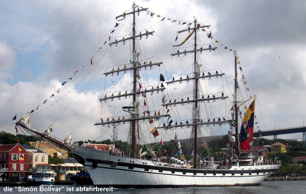 Carlos hat uns gestern gesagt, dass die „Simón Bolivar“ heute morgen um 9h auslaufen wird. Um 8h, als wir auf den Bus warten, regnet es und wir werden ein bisschen nass. Aber das ist halb so schlimm, es ist ja WARMER Regen. Wir kommen genau zur rechten Zeit in Willemstadt an und setzen uns in eines der Restaurants bei der Drehbrücke und trinken einen Kaffee. Hier haben wir einen prima Logenplatz. Wir staunen wie die Kadetten über eine ganze Stunde oben auf den Rahen (Querbalken, wo die Rahsegel befestigt sind) stehen müssen. Sie tragen alle weisse Hosen und pro Mast eine andere Farbe T-Shirts in den Farben Gelb ,Blau und Rot der venezuelanischen Flagge. Sehr schön sieht das aus! Von hier aus segelt die „Simón Bolivar“ direkt nach Hause, nach Venezuela.