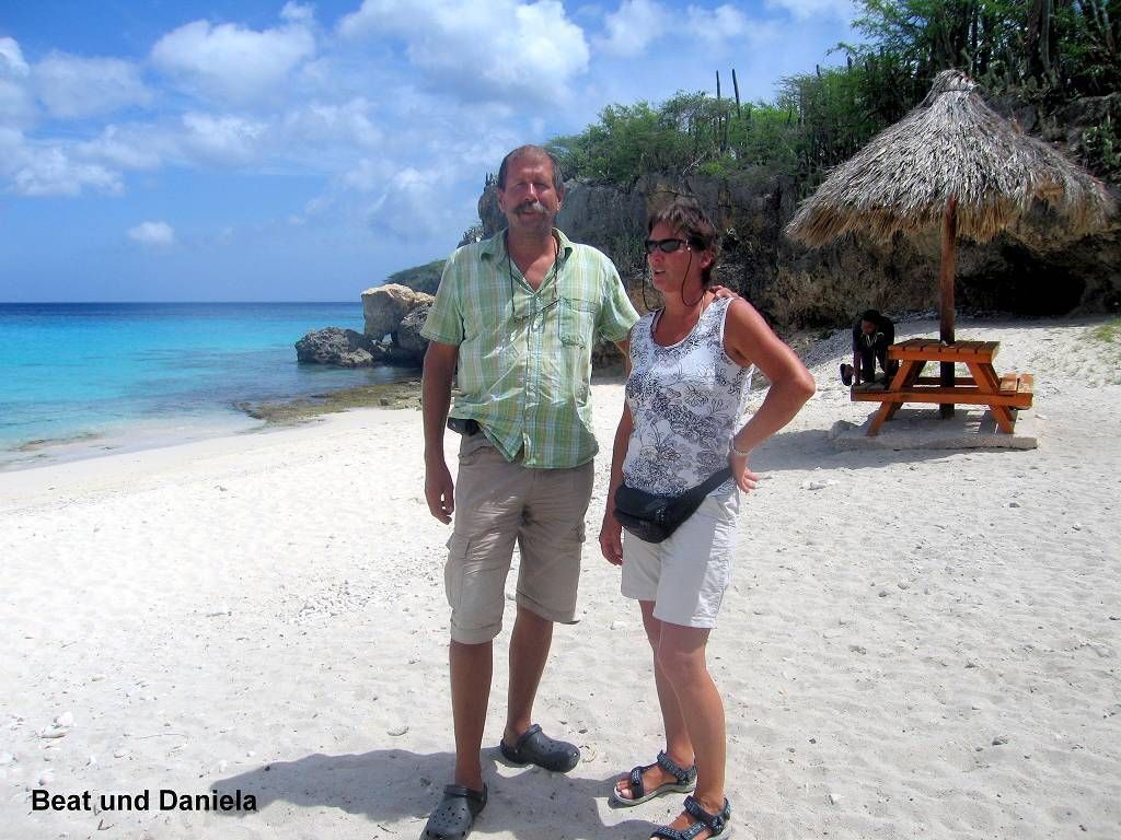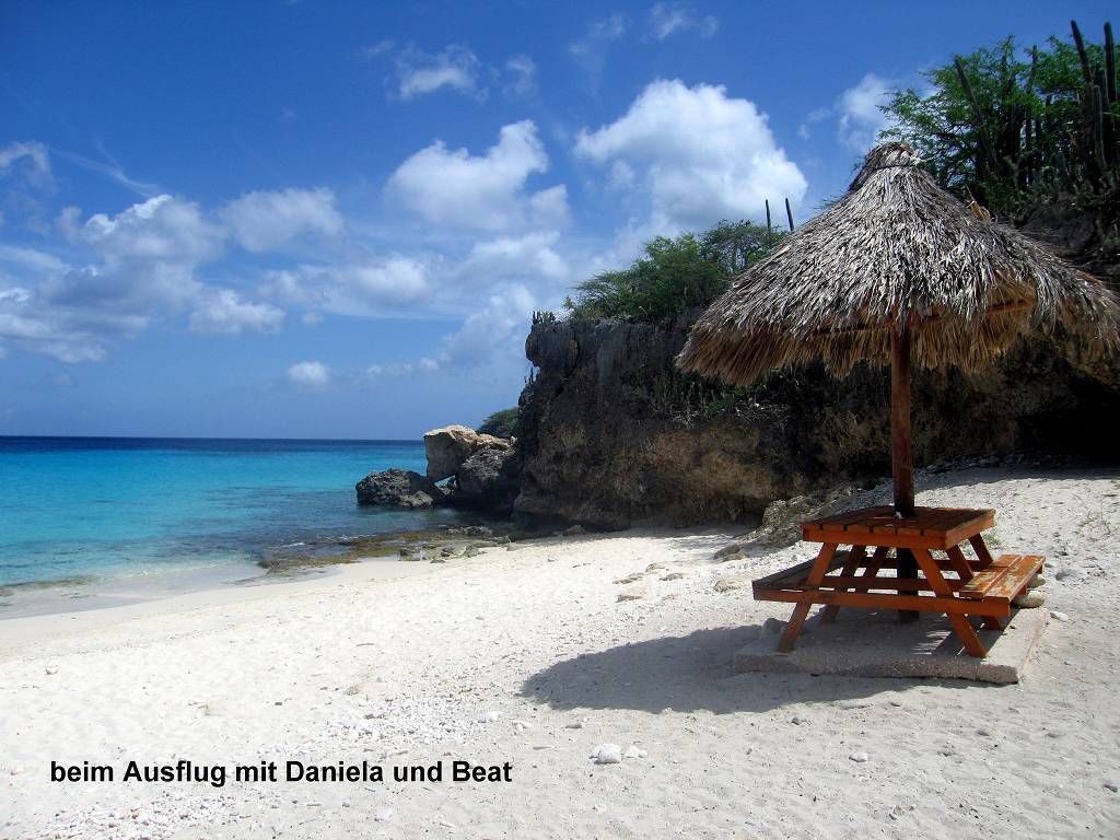 Daniela und Beat haben ihren Besuch, Nathalie und Kilian morgens um 05h zum Flugplatz gebracht. Wir skypen mit unserer Bank in der Schweiz und werden danach, um 9h30 von Daniela und Beat, die direkt neben uns liegen, per Dinghy abgeholt. Die beiden haben während drei Tagen ein Mietauto und sie haben uns eingeladen, mit ihnen eine Inselrundfahrt zu machen. Wir freuen uns sehr über diese Einladung! Mit dem Mitsubishi Lancer fahren wir zuerst über die mächtige Königin-Juliane-Brücke Richtung Flugplatz. An der Ostküste Curaçao's geht es weiter nach Norden. Wieder an der Westküste trinken wir in einer Bar hoch über einer wunderschönen Bucht einen Zitronensaft. Später baden wir in einer südlicheren Bucht im herrlich blauen Wasser. Zurück in Willemstad machen wir noch einen Einkaufs-Stop im Supermarkt „Centrum“, holen unterwegs meinen reparierten Laptop ab (Arbeit plus nicht-originalen Ventilator: 100 US$).