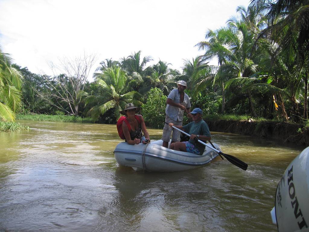 Um 13h kommen Beat und Daniela und Paul sitzt zu ihnen ins Dinghy. Ich setze mich zu Anne und Werner ins Dinghy. Nun fahren wir etwa 1,2 sm (ca.2 km) zum Mono River. Wir wollen den Fluss hinauf fahren und ihn ein wenig erkunden. Es dauert nicht sehr lange, platscht schon das erste mächtige (ca. 2½ m) Krokodil ins Wasser. Wir haben grossen Respekt, aber vermutlich hat das arme Tier noch mehr Angst als wir. Wir fahren mit dem Motor, bis eine Tafel darauf hinweist, dass man nur noch ohne Motor den Fluss weiter hinauf darf. Die Strömung ist aber ziemlich stark, so dass wir bald wieder umkehren und uns langsam den Fluss hinunter treiben lassen. Es ist wunderschön und friedlich, so ohne Motor. An genau der gleichen Stelle wie vorhin, verschwindet wieder eiligst das gewaltige Kroko im Wasser. Wir haben es beim Sonnenbaden gestört! Bei der Rückfahrt zu den Schiffen, gegen den Wind und die Wellen, werden wir ziemlich nass.