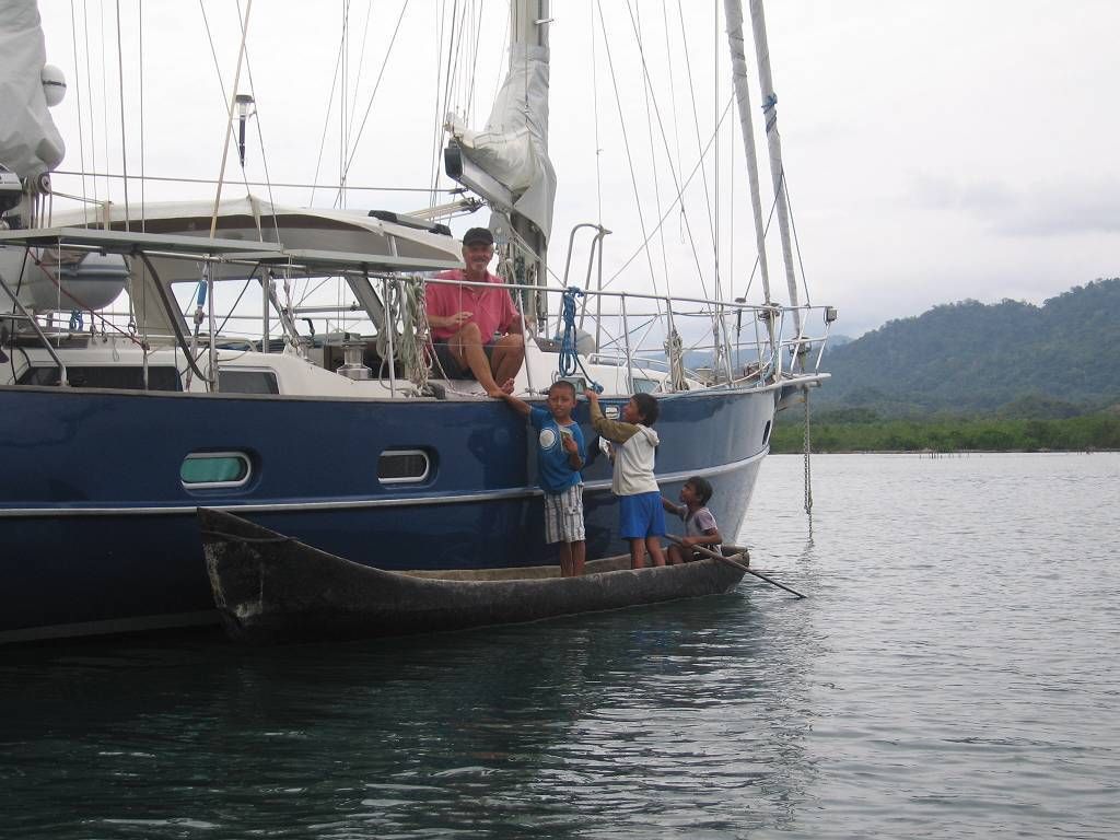 Als wir zur MABUHAY zurückkommen, liegt ein spanischer Segler neben uns. Wir sind überzeugt, dieses Schiff zu kennen und fahren zu den Leuten hin. Und tatsächlich, es ist die „Silver Cloud“ mit der spanischen Familie aus dem Baskenland, die wir auf der Isla Margarita kennen lernten. Wir sagen ihnen, dass wir jetzt ins Dorf gehen und im Restaurant dort eine gute Suppe essen werden. Sie schliessen sich uns an und wir (d.h. ich) palavere mit Amaya und Emilio ausgiebig auf Spanisch. Vor dem Mittagessen bringen Paul und ich einem 11-jährigen Albino-Knaben, Louis, der übrigens ganz fürchterlich schielt, meine Sonnenbrille, die ich nach dem Augenlasern, von der Augenklinik erhalten habe. Louis freut sich, sagt „gracias“, setzt die Brille sofort auf die Nase und verschwindet wieder mit seinen Spielkameraden. Der Vater von Louis sagt uns, er habe 3 (drei) Albino-Kinder, eine Tochter und zwei Jungs. Er und seine Frau, die wir gestern kennen lernten, sind „normale“, braunhäutige Indianer.