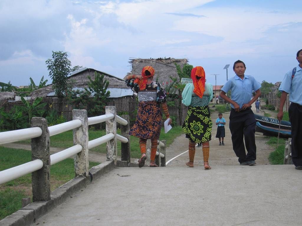 Wir kommen an einer riesigen (überdimensionierten) katholischen Kirche vorbei und an einer grossen Schulanlage. Schule wird in zwei Etappen gehalten, eine Gruppe muss am Morgen zur Schule, die anderen am Nachmittag. Es hat UNMENGEN von Kindern..., und es hat viele ALBINOS. Sie sind ganz hellhäutig, haben fast weisses Haar und sehr empfindliche Augen. Durch häufige Fälle von erblich bedingtem Albinismus bei den Kuna entstanden Legenden über Indianer mit weißer Hautfarbe.