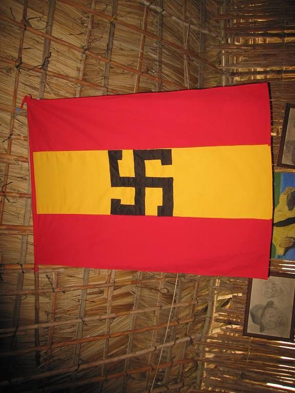 In einer Kneipe am Hafen essen wir zu Mittag. 3 mal Hühnersuppe, 3 mal Chili con Carne auf Reis und 6 Colas kosten 14.25 $. Da kann man wirklich nicht meckern, oder? Beim Wirt kaufen Werner und wir eine Kuna Flagge. Die Flagge, die Kuna Yala seit 1925 führt, bildet eine Swastika (ein Hakenkreuz) ab. Diese stellt einen Oktopus dar, der nach der lokalen Überlieferung die Welt erschaffen hat.
