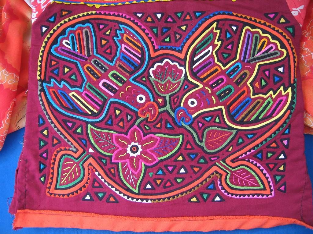 Die Molas werden auf Vorder- und Rückseite der Blusen der Kuna Frauen genäht. Sie bestehen aus Stoffresten die in mehreren Lagen miteinander vernäht werden und durch Heraustrennen und umnähen von einzelnen Flächen ein Motiv ergeben.