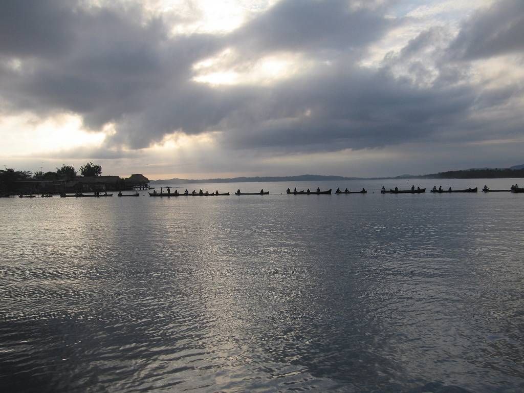 Kein Regen! Bereits um 6h werden wir von lautem Männerpalaver geweckt. Wir stehen auf und schauen dem Treiben vor dem Dorf zu. Etwa 20- 30 Kanus mit je zwei bis vier Mann liegen in einer Reihe quer vor der Einfahrt zur Bucht. Es dauert ein Weilchen, bis wir herausfinden, was da gemacht wird. Sie legen eine Wasserleitung vom Festland zum Insel-Dorf. Stück für Stück wird ein Kunststoff-Rohr nach dem anderen angesetzt und weiter geschoben. Das dauert etwa 3 Stunden. Nun entdecken wir ein Grüppchen richtig grosse Delfine, die in aller Gemütlichkeit in der Bucht und zwischen den Schiffen herumschwimmen und fressen. Wir sind jetzt 6 Segelschiffe hier. Die „sail away“, Anna X und „Time after Time“ verlassen den Ankerplatz und fahren zur nächsten Insel. Wir bleiben noch hier, weil wir mit dem Dinghy den Rio Sugandi erkunden wollen. Das wird im Segelführerbuch so vorgeschlagen. Ausgerüstet mit Wasser und Picknick machen wir uns auf den Weg. Aber unser Ausflug dauert nicht lange! Wir kommen nicht einmal bis zur Flusseinfahrt, werden wir schon von einem Motoreinbaum aufgehalten. Zwei Frauen und ein Mann sagen uns, es sei verboten in den Fluss zu fahren, er sei heilig und es koste 50 $ wenn wir dort hin fahren möchten!!!! Nein Danke, soviel ist uns dieser Fluss nicht wert.
