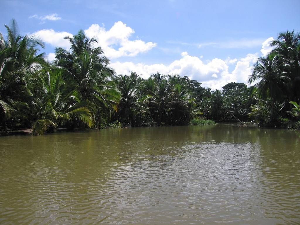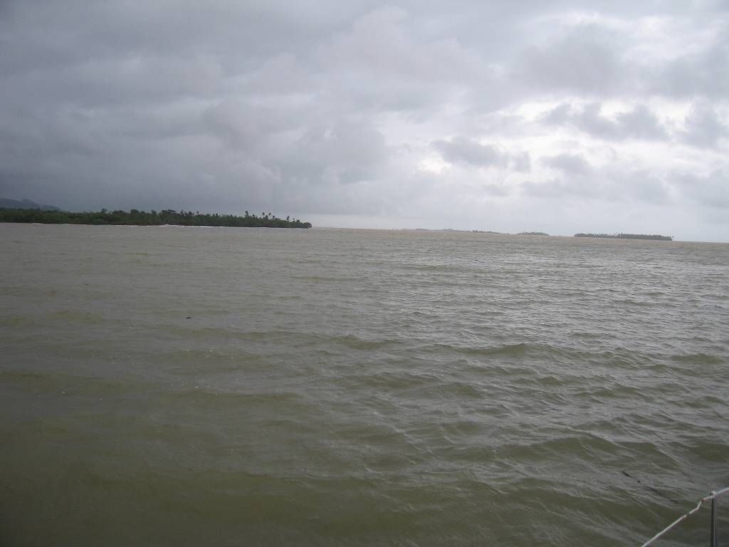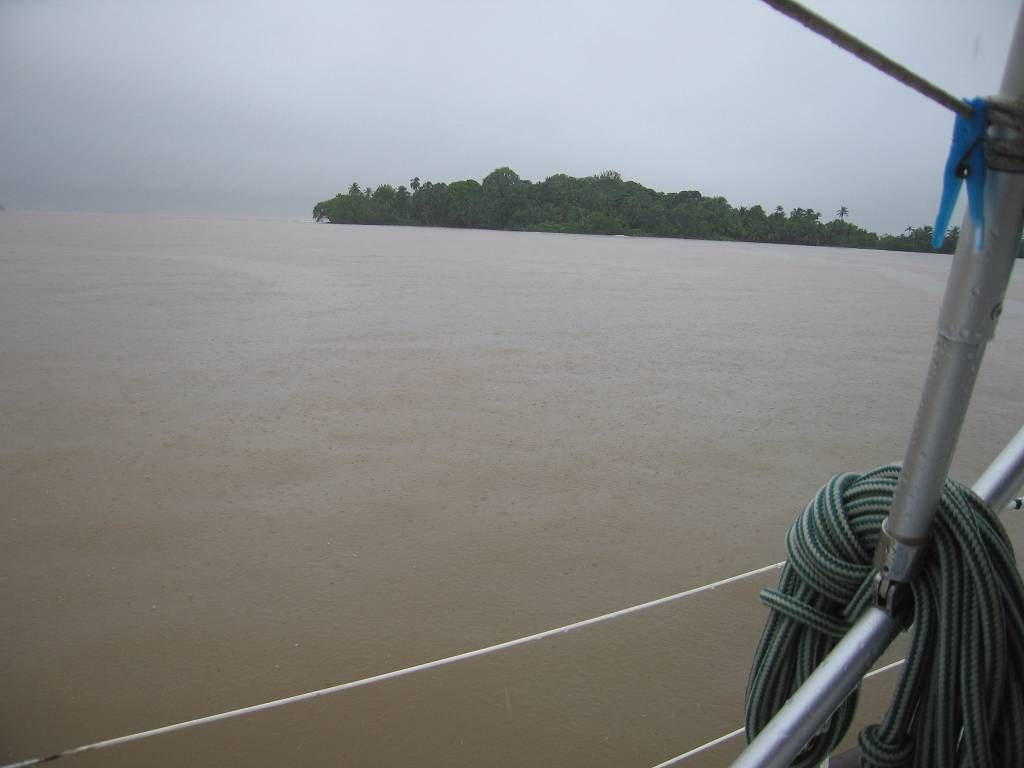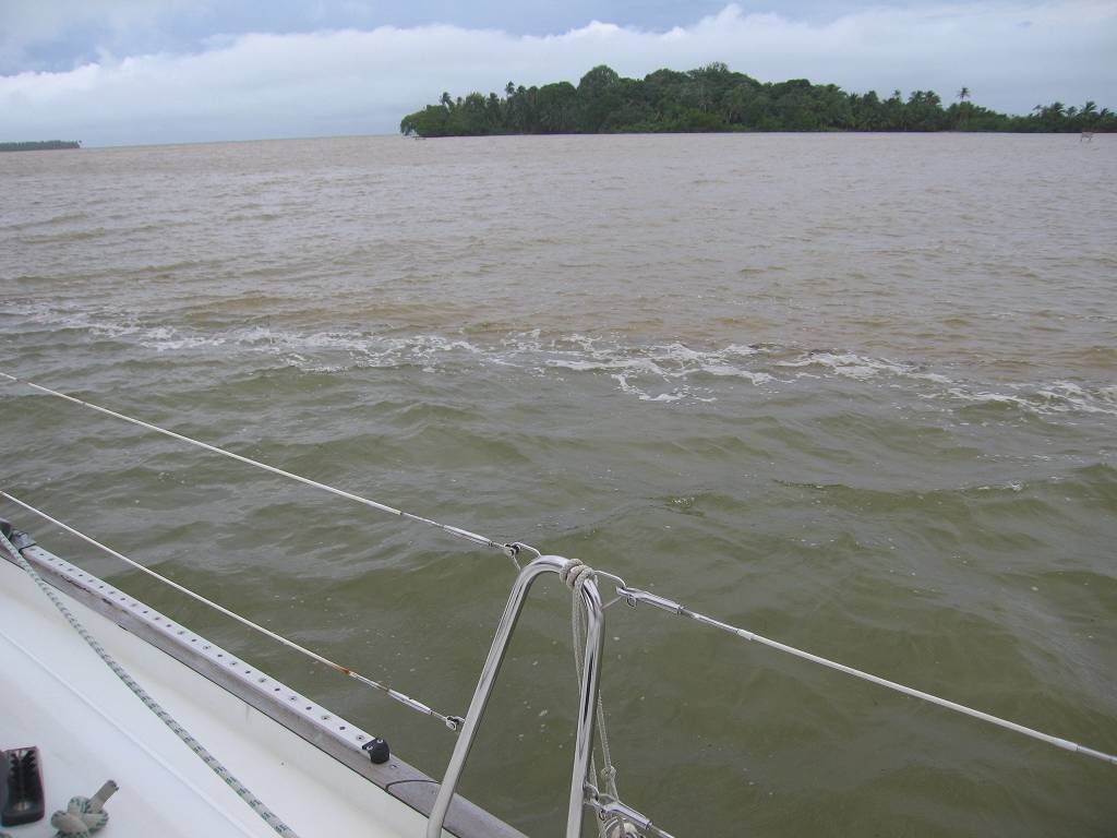 Der Rio Mono bringt Unmengen von Kokosnüssen, Baumstämmen, Ästen und total braunes Wasser mit sich. Die GANZE Bucht, und sie ist RIESIG, ist voll mit braunem Wasser und wir sitzen mitten drin in dieser braunen Brühe.