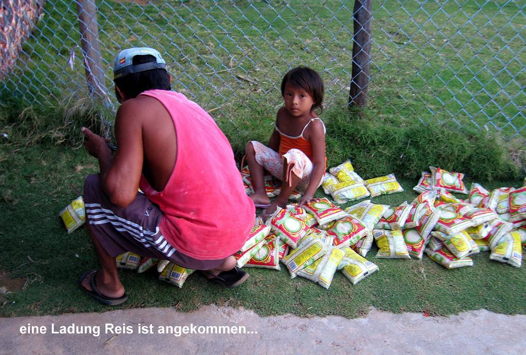 Nachmittags, in einer Regenpause, kommen zwei Indianer im Kanu vorbei und verkaufen uns 16 (!) dicke, grasgrüne Bananen für 1 US$! Einer sagt uns, heute sei hier „Muttertag“. Und es werde noch 4 (vier) Tage lang so weiter regnen. Ihre Wissenschaftler hätten vorausgesagt, dass es 15 Tage regnen werde. Oh Gott, hoffentlich haben die sich verrechnet!