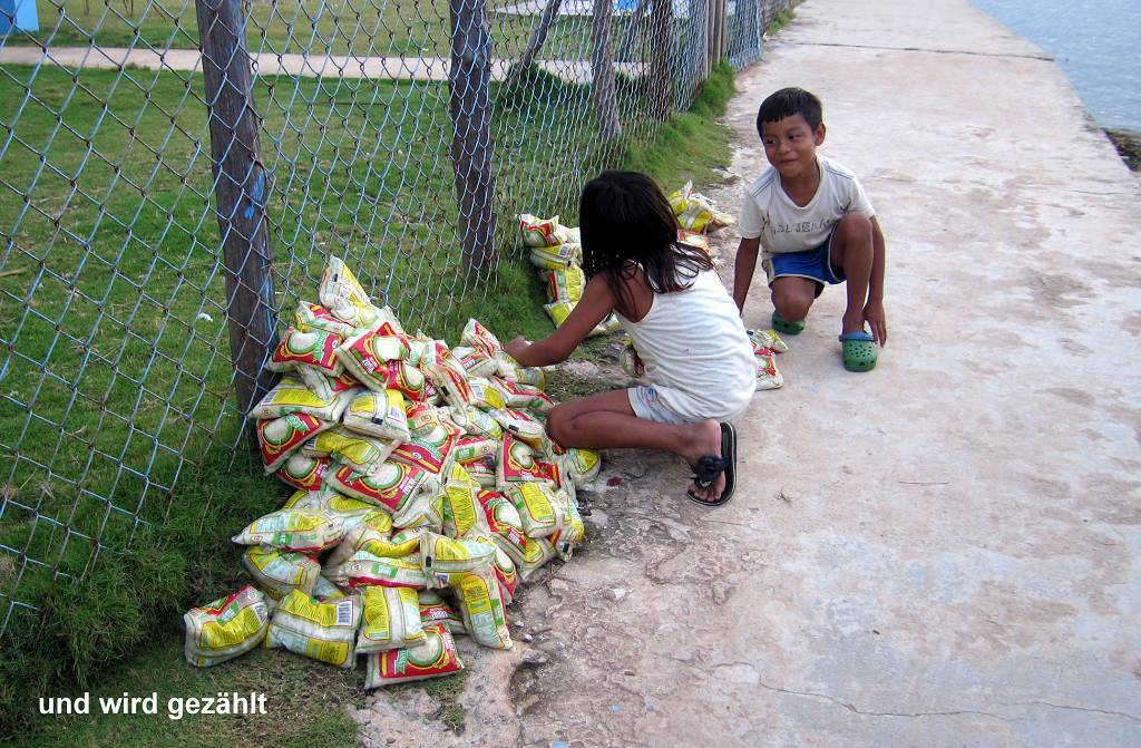Als wir zur MABUHAY zurückkommen, liegt ein spanischer Segler neben uns. Wir sind überzeugt, dieses Schiff zu kennen und fahren zu den Leuten hin. Und tatsächlich, es ist die „Silver Cloud“ mit der spanischen Familie aus dem Baskenland, die wir auf der Isla Margarita kennen lernten. Wir sagen ihnen, dass wir jetzt ins Dorf gehen und im Restaurant dort eine gute Suppe essen werden. Sie schliessen sich uns an und wir (d.h. ich) palavere mit Amaya und Emilio ausgiebig auf Spanisch. Vor dem Mittagessen bringen Paul und ich einem 11-jährigen Albino-Knaben, Louis, der übrigens ganz fürchterlich schielt, meine Sonnenbrille, die ich nach dem Augenlasern, von der Augenklinik erhalten habe. Louis freut sich, sagt „gracias“, setzt die Brille sofort auf die Nase und verschwindet wieder mit seinen Spielkameraden. Der Vater von Louis sagt uns, er habe 3 (drei) Albino-Kinder, eine Tochter und zwei Jungs. Er und seine Frau, die wir gestern kennen lernten, sind „normale“, braunhäutige Indianer.
