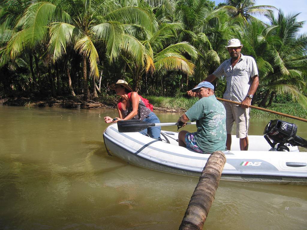 Um 13h kommen Beat und Daniela und Paul sitzt zu ihnen ins Dinghy. Ich setze mich zu Anne und Werner ins Dinghy. Nun fahren wir etwa 1,2 sm (ca.2 km) zum Mono River. Wir wollen den Fluss hinauf fahren und ihn ein wenig erkunden. Es dauert nicht sehr lange, platscht schon das erste mächtige (ca. 2½ m) Krokodil ins Wasser. Wir haben grossen Respekt, aber vermutlich hat das arme Tier noch mehr Angst als wir. Wir fahren mit dem Motor, bis eine Tafel darauf hinweist, dass man nur noch ohne Motor den Fluss weiter hinauf darf. Die Strömung ist aber ziemlich stark, so dass wir bald wieder umkehren und uns langsam den Fluss hinunter treiben lassen. Es ist wunderschön und friedlich, so ohne Motor. An genau der gleichen Stelle wie vorhin, verschwindet wieder eiligst das gewaltige Kroko im Wasser. Wir haben es beim Sonnenbaden gestört! Bei der Rückfahrt zu den Schiffen, gegen den Wind und die Wellen, werden wir ziemlich nass.