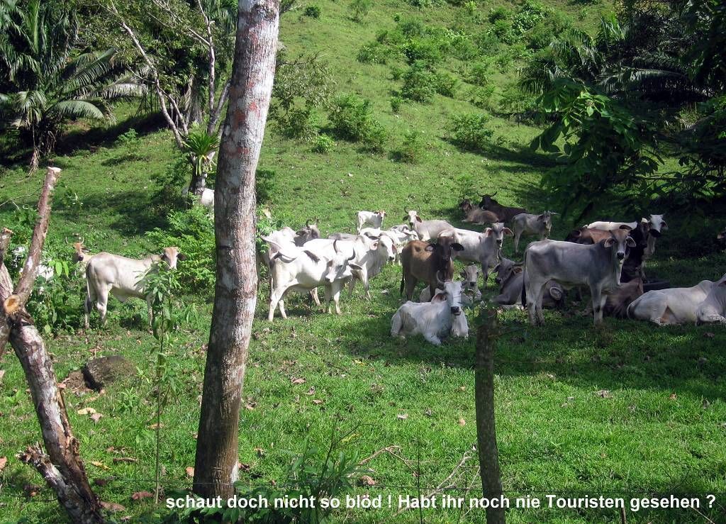 Per Dinghy fahren wir an Land. Von hier wollen wir zur „Panamarina“ laufen. Wir hoffen sehr, in dieser Marina Hilfe für unsere Raymarine Autopiloten-Probleme zu finden. Wir latschen von Puerto Lindo ca, eine Stunde lang auf einer schön geteerten Strasse. Heute sehen wir erstmals seit dem 17.November, seit Cartagena in Kolumbien, wieder einmal Autos. Die haben wir eigentlich gar nie vermisst!!! Und links und rechts von der Strasse hat es steile grüne Weiden mit Zeburindern drauf, die uns blöd anschauen. Klar, wer latscht denn schon bei dieser Hitze auf einer Hauptstrasse? Als ich endlich jemanden frage, wo denn die „Panamarina“ sei, müssen wir umkehren. Wir haben den Abzweiger verpasst und müssen das ganze Stück wieder zurück. Dabei habe ich jetzt schon eine schöne, etwa wie ein 20-Rappen-Stück, grosse Blase von den Crocs auf dem Rist.