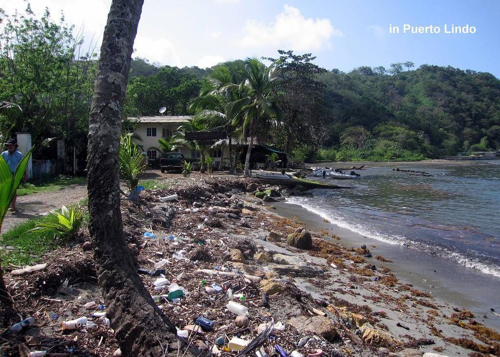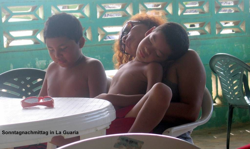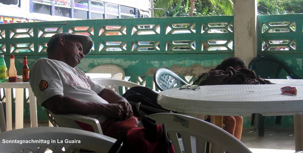Nach dem das Brot gebacken und die Wäsche getrocknet ist, beschliessen wir spontan, nochmals einen kleinen Busausflug zu machen. Und zwar diesmal in die andere Richtung, nicht Richtung Colon. Beim Dorfplatz warten wir fast eine Stunde lang auf den Bus nach La Guaira. Überall liegt Abfall herum, es ist einfach scheusslich! Und dazu dröhnt höllenlaute Musik aus den Verstärkern. Und der Bus kommt und kommt nicht! Wir beschliesssen, schon mal ein Stück zu laufen und den Bus unterwegs anzuhalten. Wir latschen etwa eine ½ Stunde lang auf der heissen Landstrasse. Meine grosse Blase am Fuss ist aufgeplatzt und brennt mächtig. Bei Paul bildet sich eine Blase an der kleinen Zehe. Aber heute haben wir Pflaster dabei und können uns verarzten. Endlich, um 13h45 kommt ein fast leerer Bus und wir können sitzend ins ca. 20 km entfernte La Guaira fahren. In Puerto Lindo steigt der Mann ein, der uns 3,5 kg Zitronen verkauft hat. Er ist guter Dinge, er singt und räumt den Bus auf. Alle Bierdosen und PET-Flaschen die am Boden herumliegen hebt er auf und schmeisst sie in hohem Bogen aus dem Fenster auf die Strasse!!! So macht man das!!!