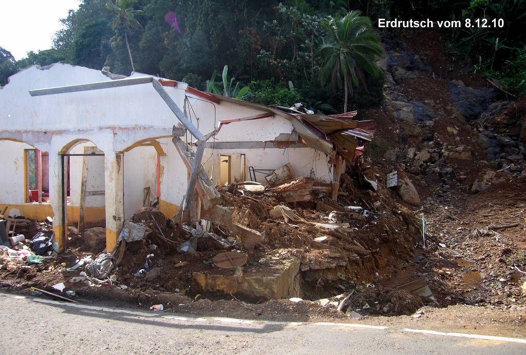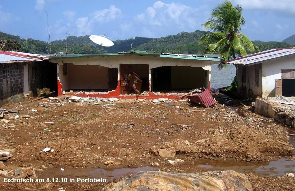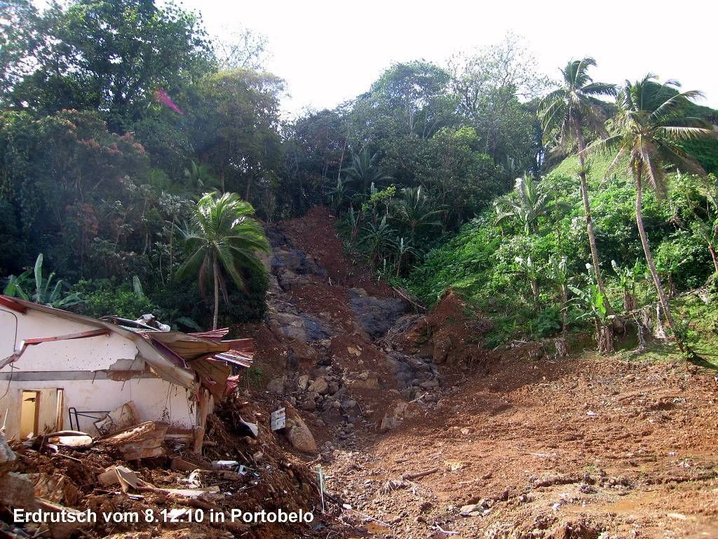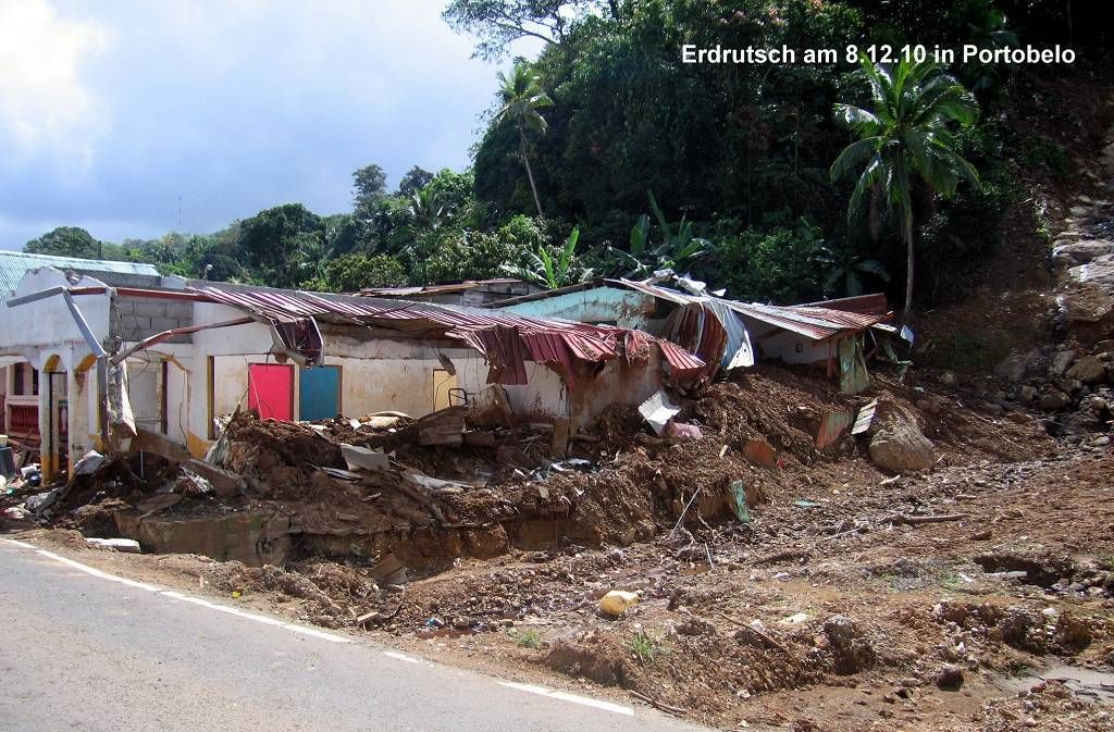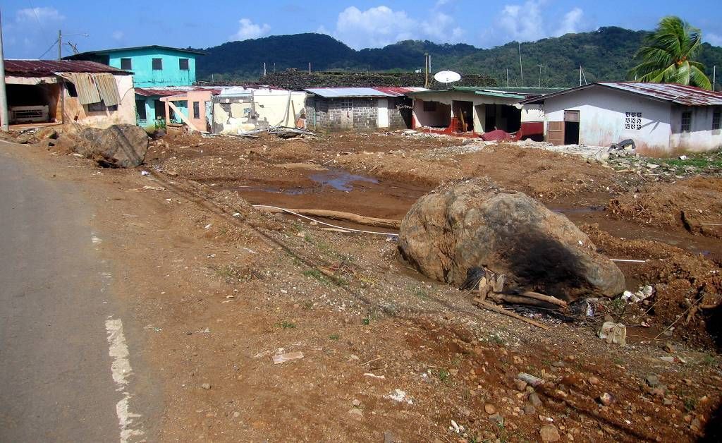 Durch das Dorf verläuft eine breite Schneise der Zerstörung. Häuser sind vom Erde und Felsbrocken niedergewalzt oder ganz weggerissen. Am 8 Dezember 2010 gab es hier einen Bergrutsch, bei dem 8 Personen starben. Der Auslöser dafür war der „grosse Regen“, den wir in Mono Island, auf den San Blas Inseln erlebten. Dies ist ein total trauriger Anblick.
