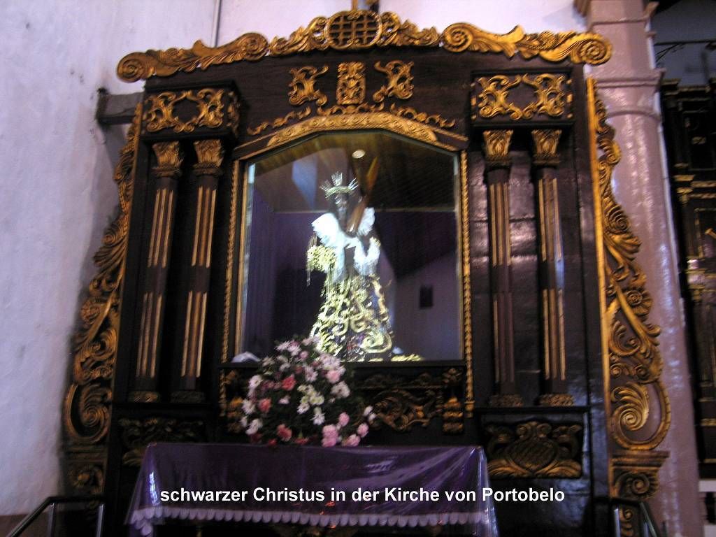 Portobelo ist ein berühmter Pilgerort. In der schlichten Kirche „Iglesia de San Felipe“ aus dem 17.Jahrhundert befindet sich eine hölzerne Statue des Cristo Negro de Portobelo, die wie ein Augapfel gehütet wird. Jedes Jahr am 21.Oktober pilgern Tausende von Gläubigen hierher um an der bedeutendsten Prozession Panamas teilzunehmen. Sie legen sogar die letzten Meter ihrer Pilgerreise auf den Knien zurück! Die Legende sagt, dass die Gegend von einer schweren Cholera-Epidemie betroffen war. Da tauchte in der Bucht vor Portobelo plötzlich eine Kiste auf. Die Fischer des Ortes holten sie an Land und fanden darin eine schwarze Christus-Figur. Sie brachten sie sofort in die Kirche und noch am gleichen Tag verschwand die Cholera-Epidemie.