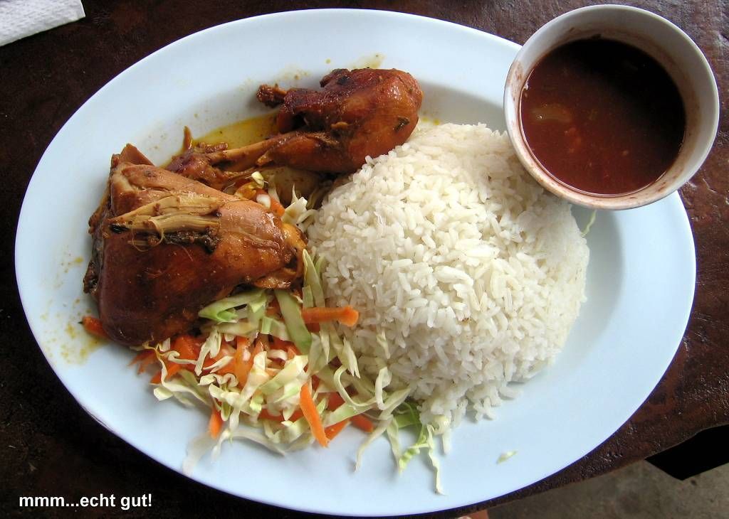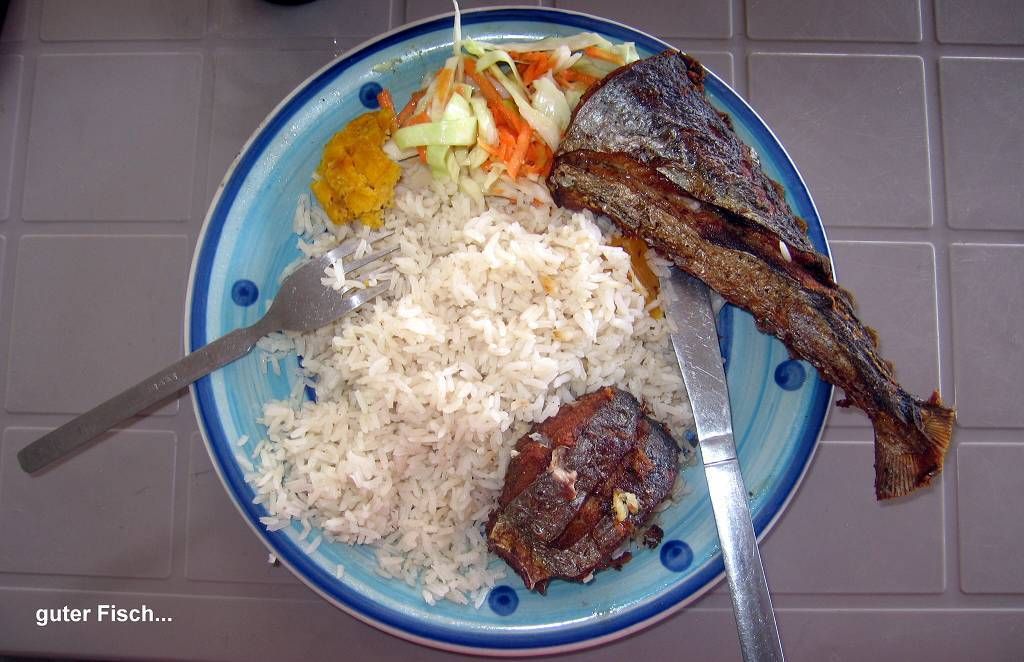 Danach holen wir den Benzinkanister aus dem Dinghy und lassen ihn bei der „Tankstelle“ füllen. Die Tankstelle ist ein ganz „normales“ Haus, wo das Benzin in der Wohnstube aufbewahrt wird. In alten Wasserflaschen, die genau 1 Gallonen (1 Gallone = 3.7853 Liter) fassen wird das Benzin abgemessen und in unseren Kanister abgefüllt. 1 Liter Benzin kostet ca. 1$. Wir lassen den Kanister bei der „Tankstelle“ stehen und gehen zum Mittagessen in ein kleines Restaurant bei der Kirche. Wir essen Huhn (was denn sonst???) mit viel Reis, Chabis-Rüebli-Salat und rote Bohnen. Es ist sehr gut und sehr genug! Beim Bezahlen fallen wir fast vom Hocker! Alles zusammen kostet 9 $! Das Essen ist 3 $ und wir hatten 4 Biere à 0.75 $. Da kann man wirklich nicht meckern, oder? Für diese Preise hier nehme ich meine Küche NICHT in Betrieb!