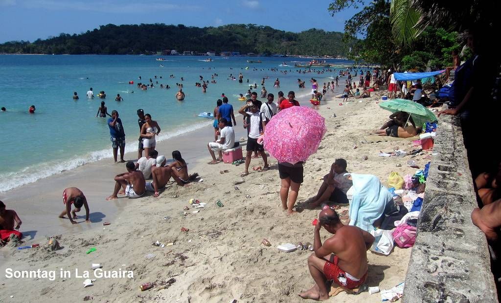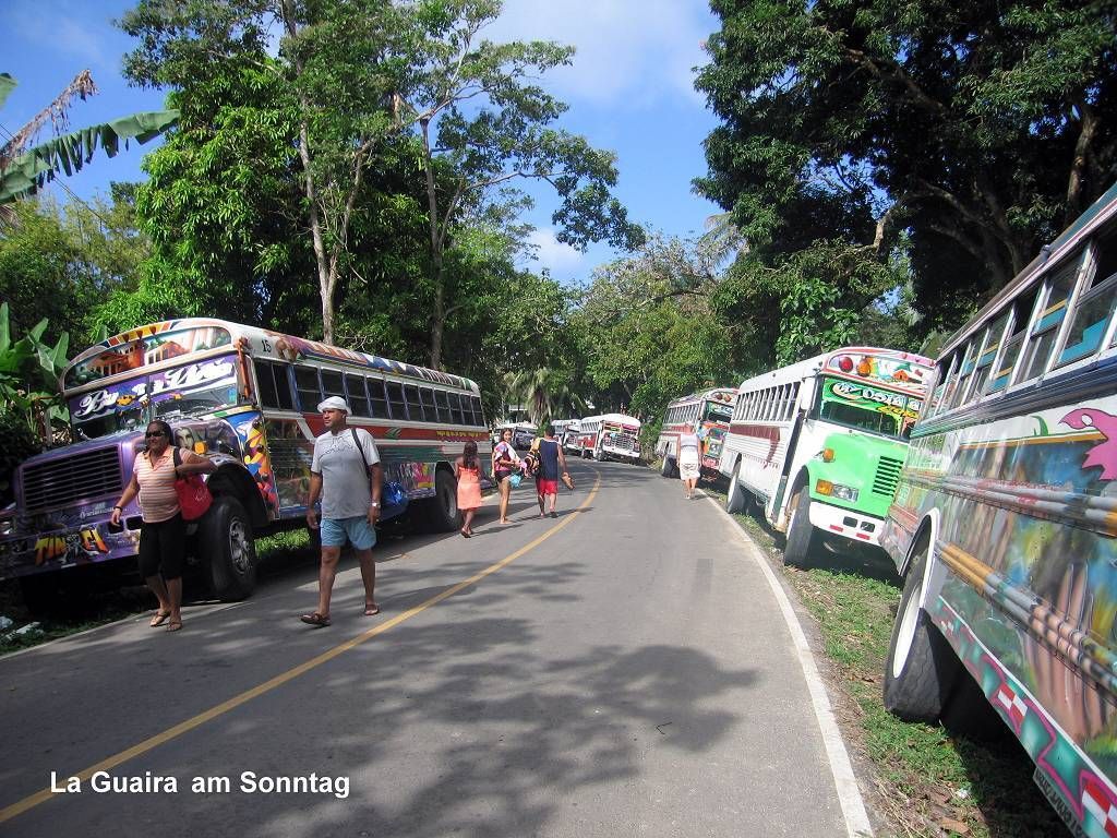 In La Guaira werden wir total überrascht. Hier stehen mindestens 50 (eher noch mehr) grosse, bunte Busse parkiert. Dazu jede Menge PKW's. Die Strände von La Guiara und der vorgelagerten Isla Grande sind schwarz von Menschen, die von weit herkommen um hier den Sonntag im Familienkreis, am Strand zu verbringen. Die Strände sind übersät mit Abfällen. Oh Gott, wie das hier wohl bis heute Abend aussehen wird? Wir setzen uns in ein Restaurant und essen sehr, sehr guten gebratenen Fisch (es gibt nur Oktopus oder Fisch!), ein winziges bisschen Chabis/Rüebli-Salat, dazu für mich viel Reis und für Paul gebratene Kochbananen (Patacones). Es ist 15h bis wir das Essen endlich bekommen und es ist „richtig teuer“! 6$ pro Essen und 0.75$ pro 3,3dl Fläschchen Bier! Um 16h sitzen wir wieder im Bus nach Portobelo. Auf dem Platz bei den Bussen herrscht ein Mordsgetümmel. Bis da wieder jeder im richtigen Bus ist! In unserem Bus stehen die Leute dicht aneinander gedrängt. Wenn eine Mutter mit einem Kind auf dem Arm einsteigt, wird ihr das Kind sofort von jemandem auf einem Sitzplatz abgenommen und nun sitzt das Kleine bei wildfremden Menschen auf dem Schoss. Ist das nicht schön? Um 17h sind wir wieder auf der MABUHAY und geniessen ein kaltes Bad im Meer. Zum Abendessen gibt es heute nur frisches Brot, kaltes Huhn und Zitronen-Wasser...